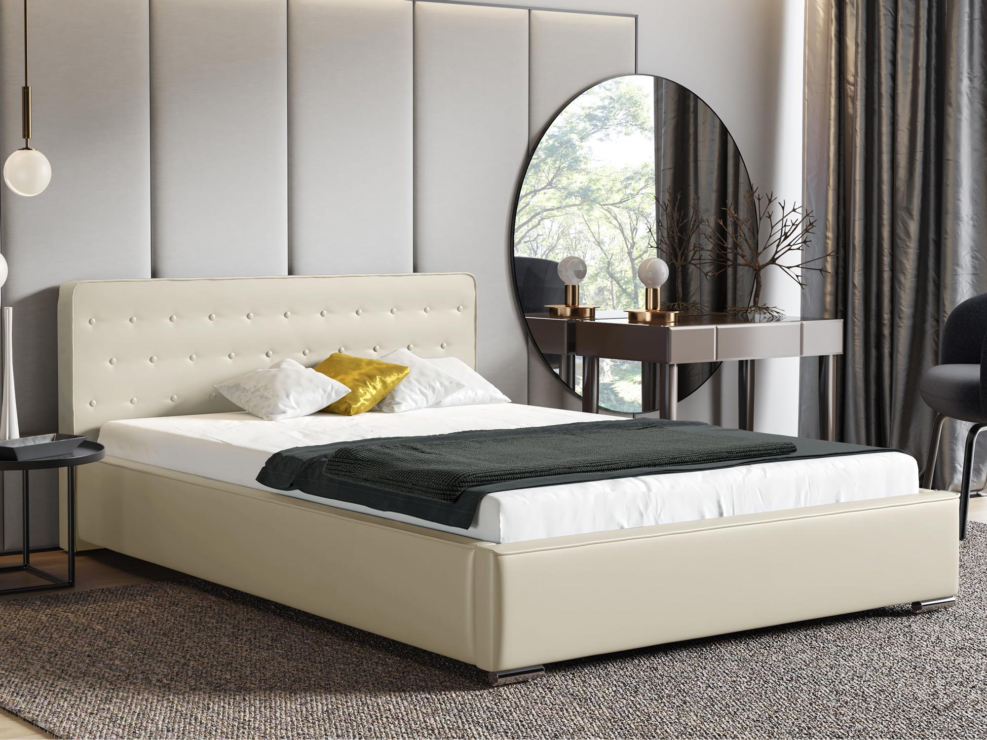 Kremowe łóżko tapicerowane z eleganckim zagłówkiem i czarną ramą