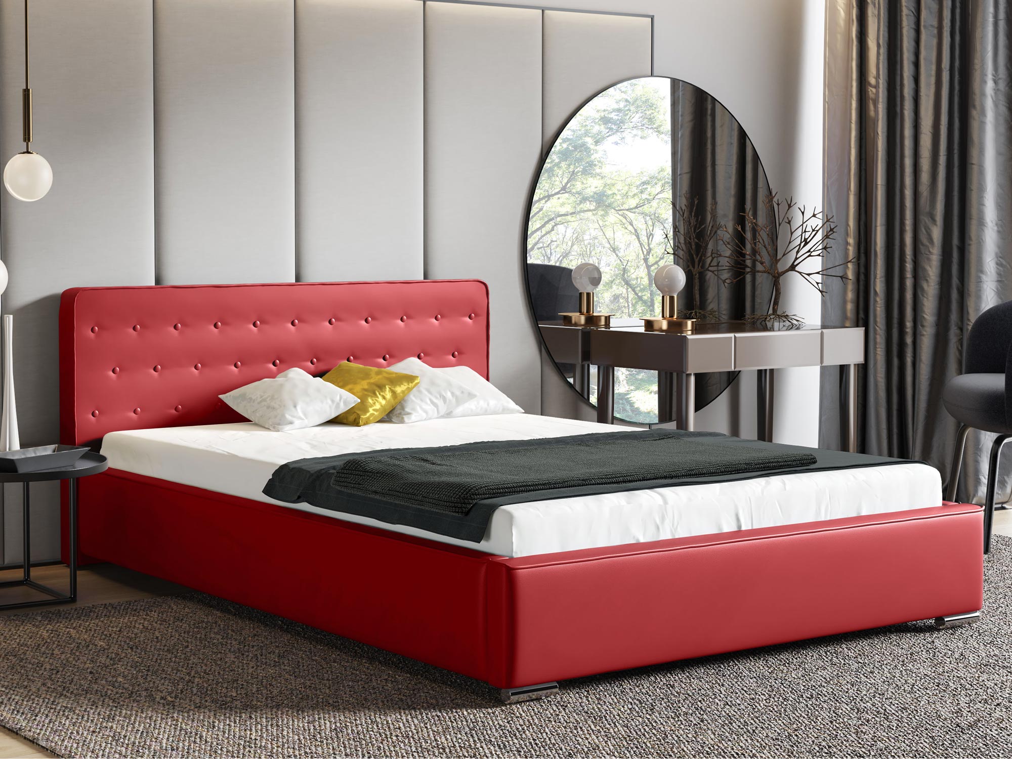 Czerwone łóżko tapicerowane z pikowanym zagłówkiem do nowoczesnej sypialni