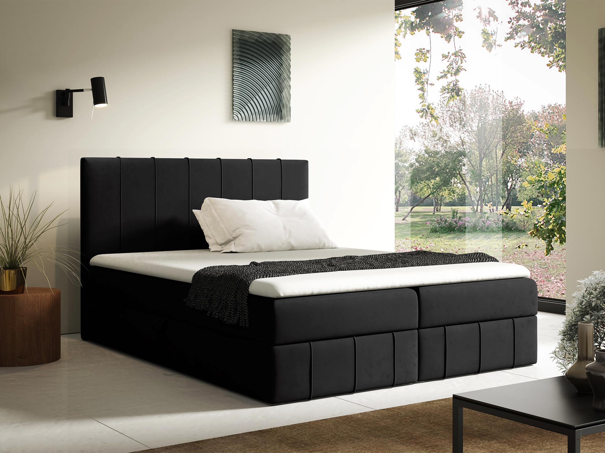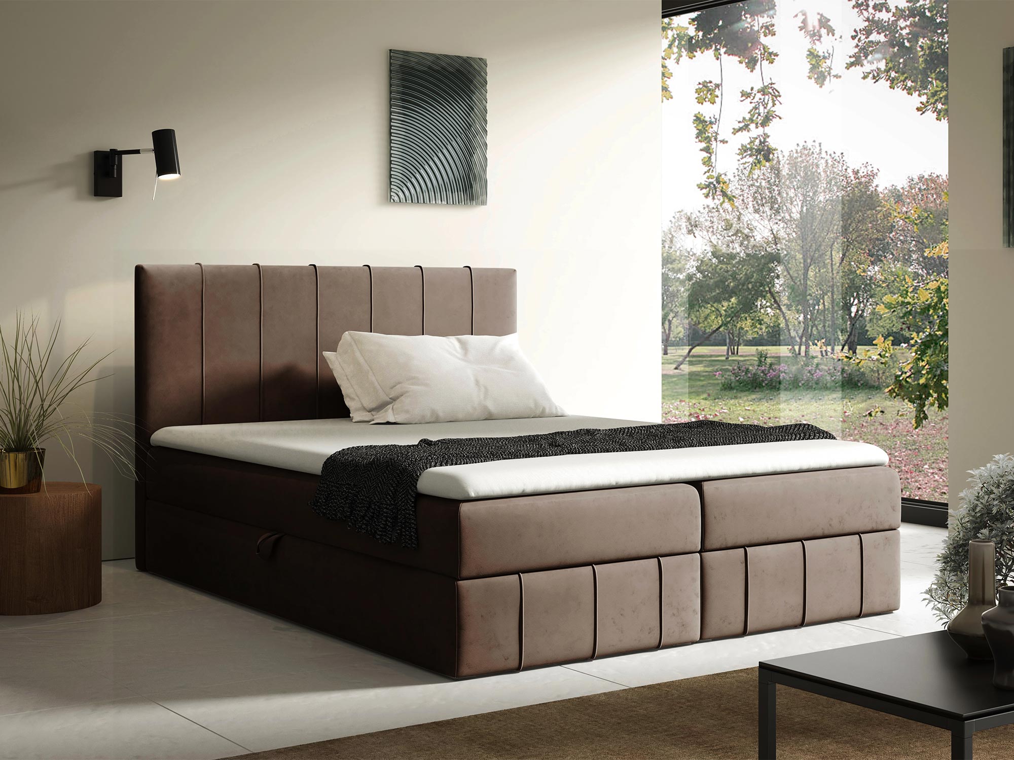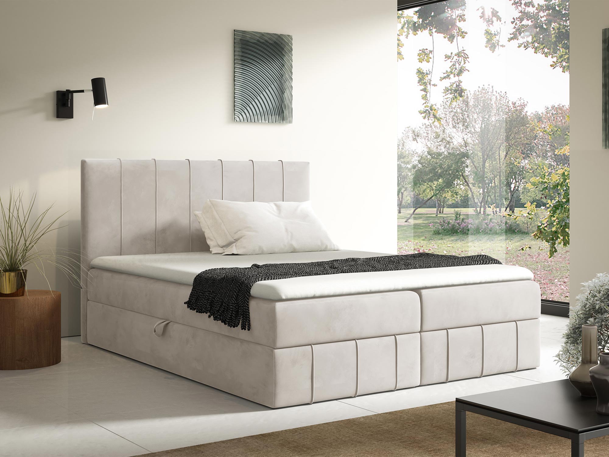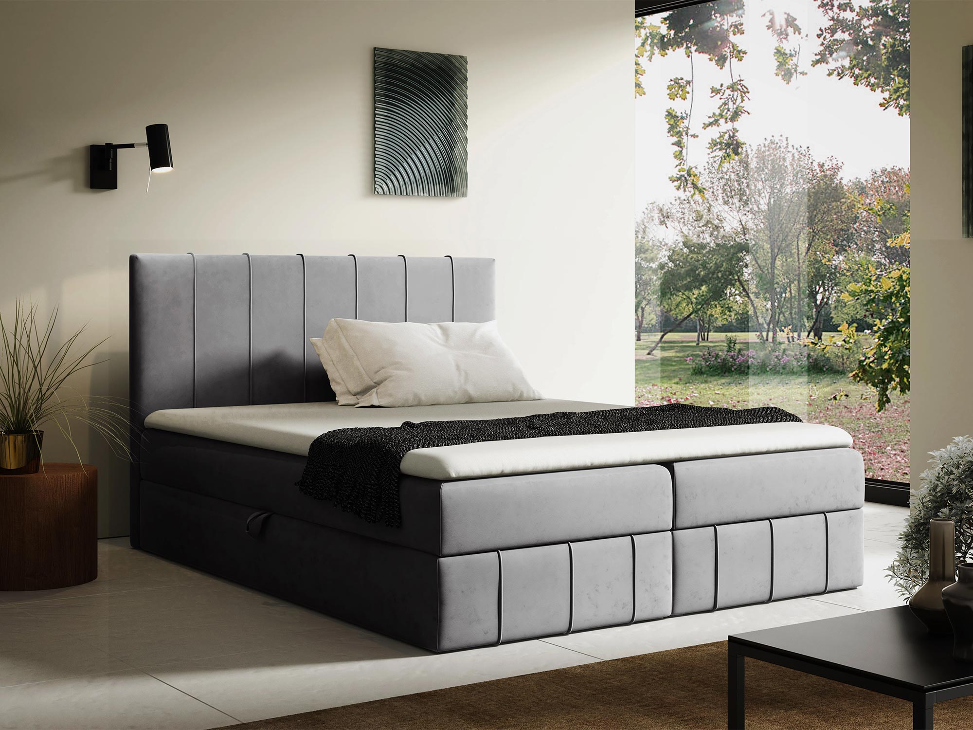 - Pikowany zagłówek z ozdobnymi przeszyciami – elegancki detal, który dodaje łóżku nowoczesnego charakteru.