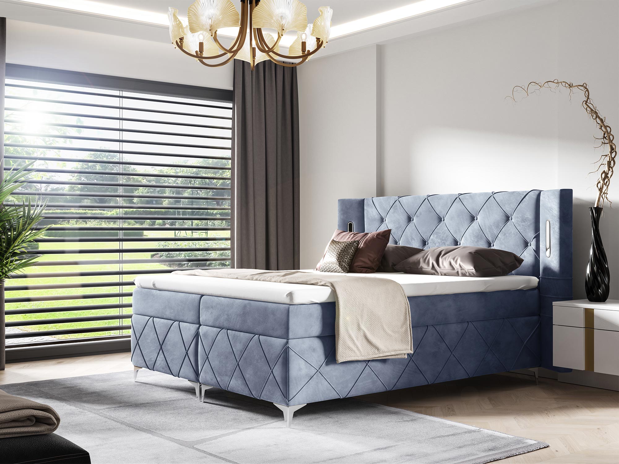 Łóżko tapicerowane w stylu glamour, niebieskie z przeszyciami