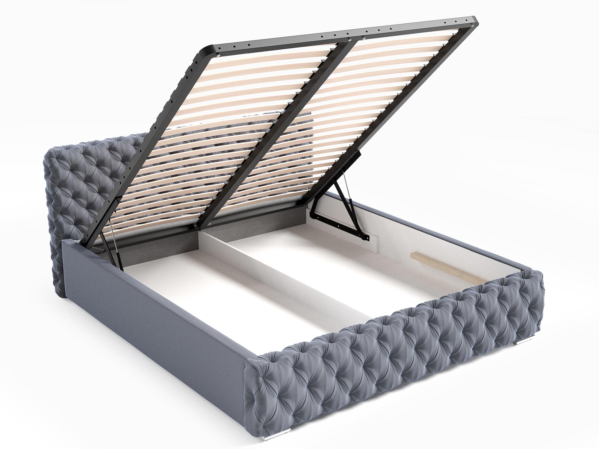 Łóżko MATIAS zostało stworzone z myślą o użytkownikach, którzy cenią sobie nowoczesną estetykę i najwyższy komfort. Standardowy metalowy stelaż z 34 sprężynującymi listwami oraz gazowe siłowniki o mocy 1000N gwarantują stabilność, trwałość oraz wygodę użytkowania. Niezależnie od wybranego wariantu, stelaż zapewnia odpowiednie podparcie dla materaca, co przekłada się na komfort snu i długotrwałą wytrzymałość.