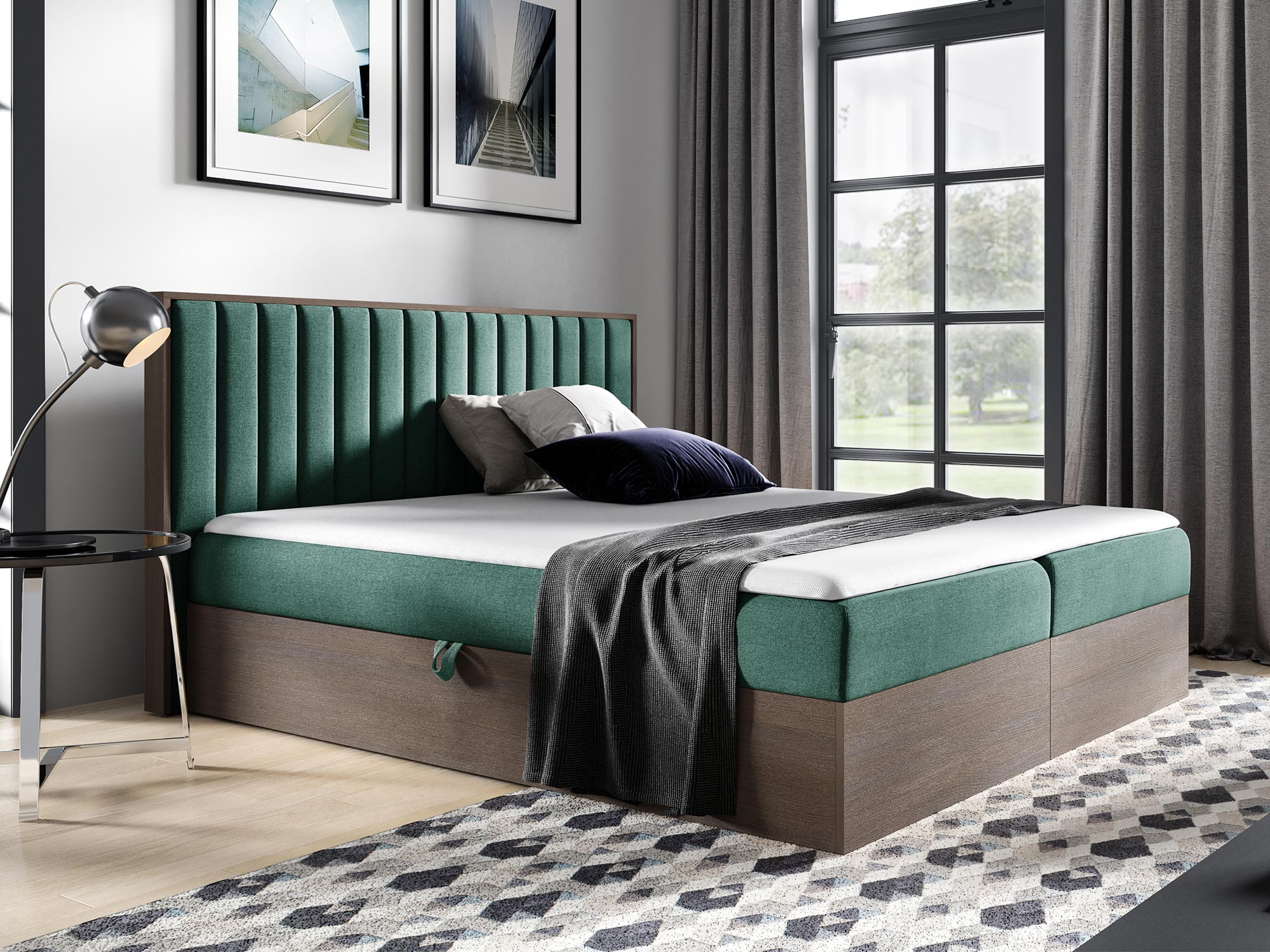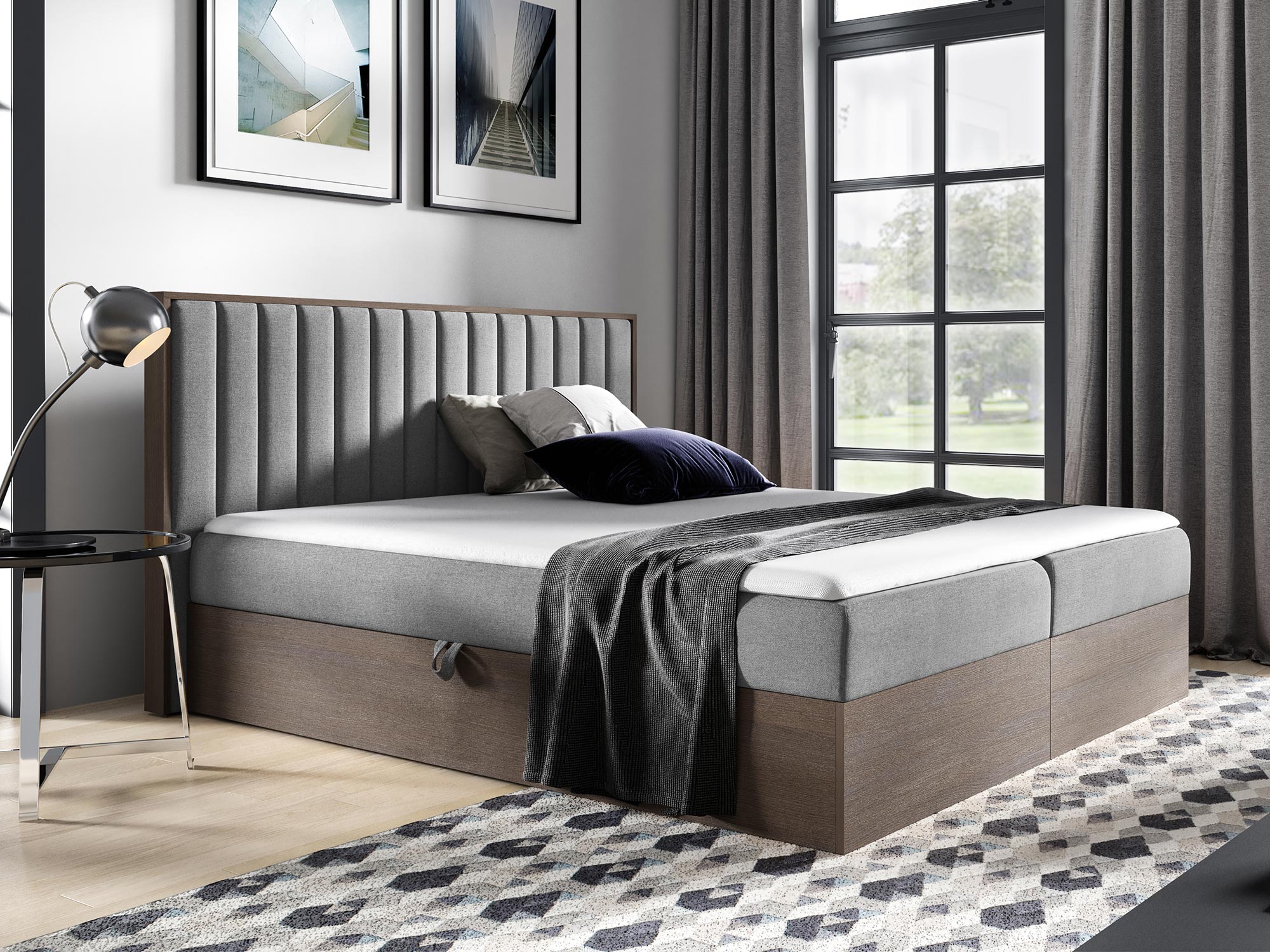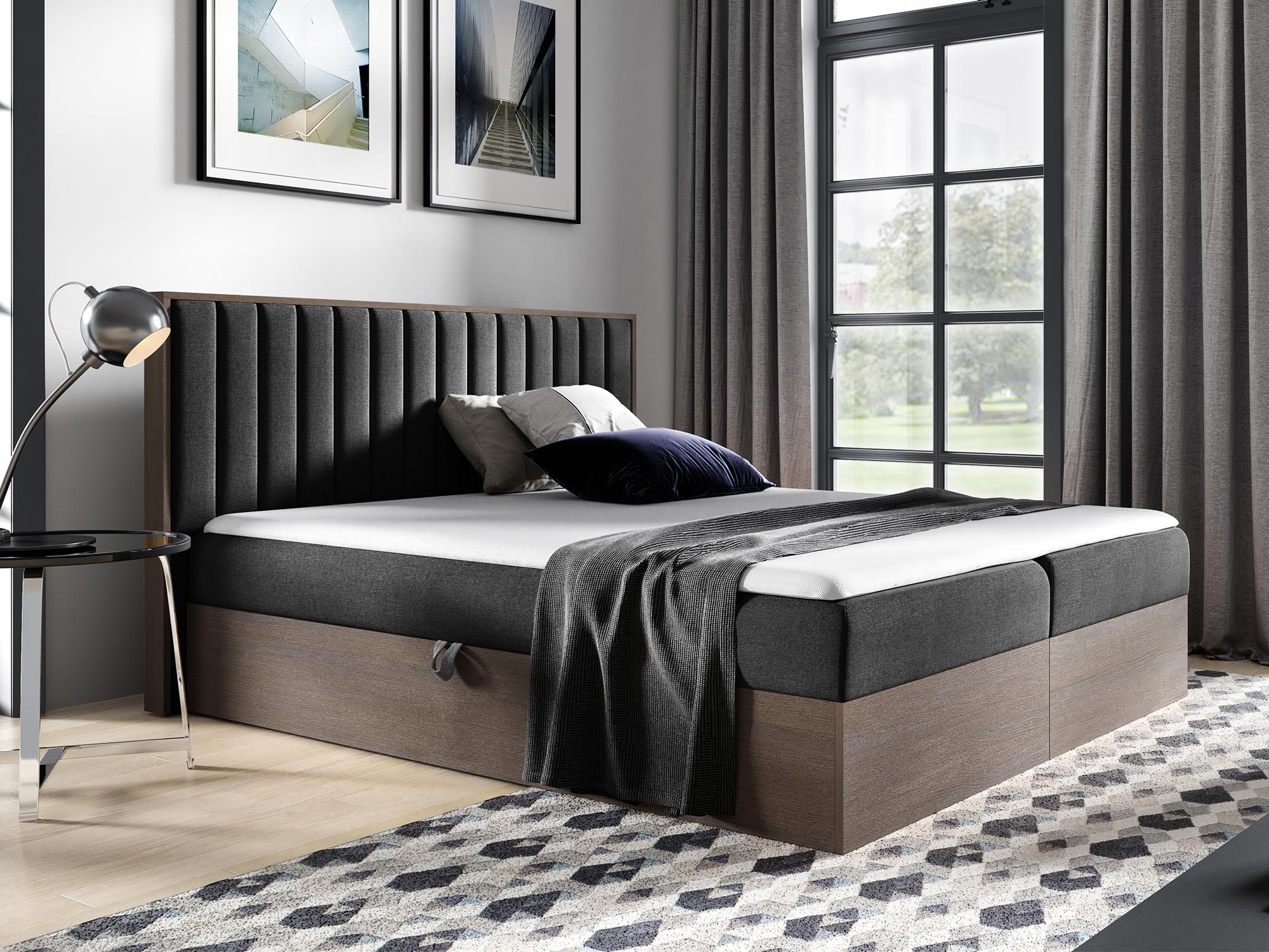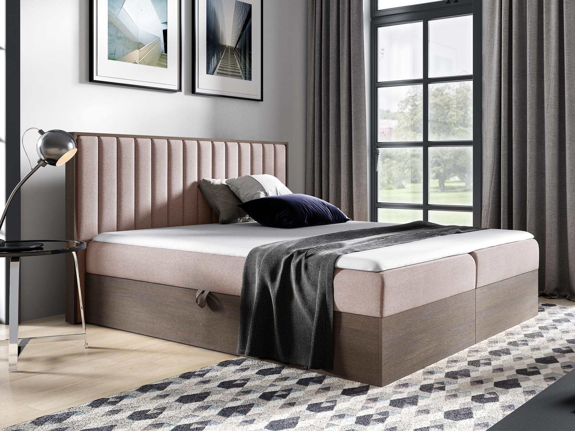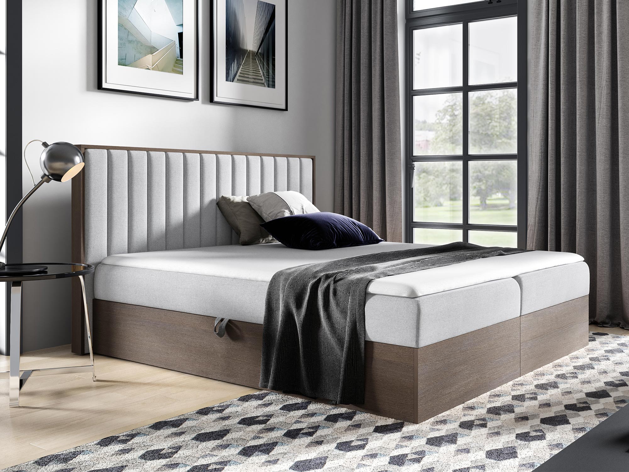 - Dwa pojemniki na pościel, otwierane automatem na sprężynach, zapewniające dodatkową przestrzeń do przechowywania