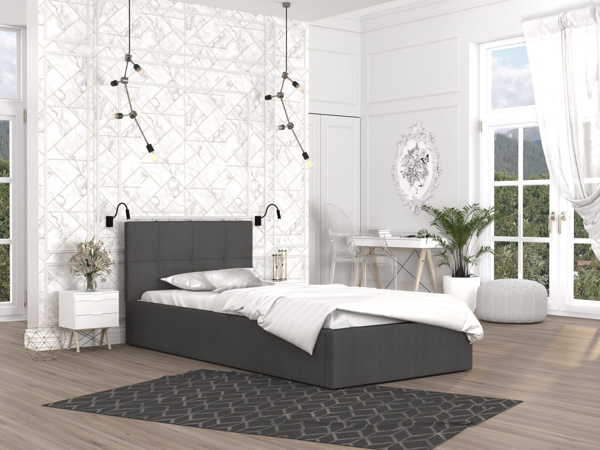 Pojedyncze łóżko grafitowe aranżacja widok z boku 120x200 RUBY