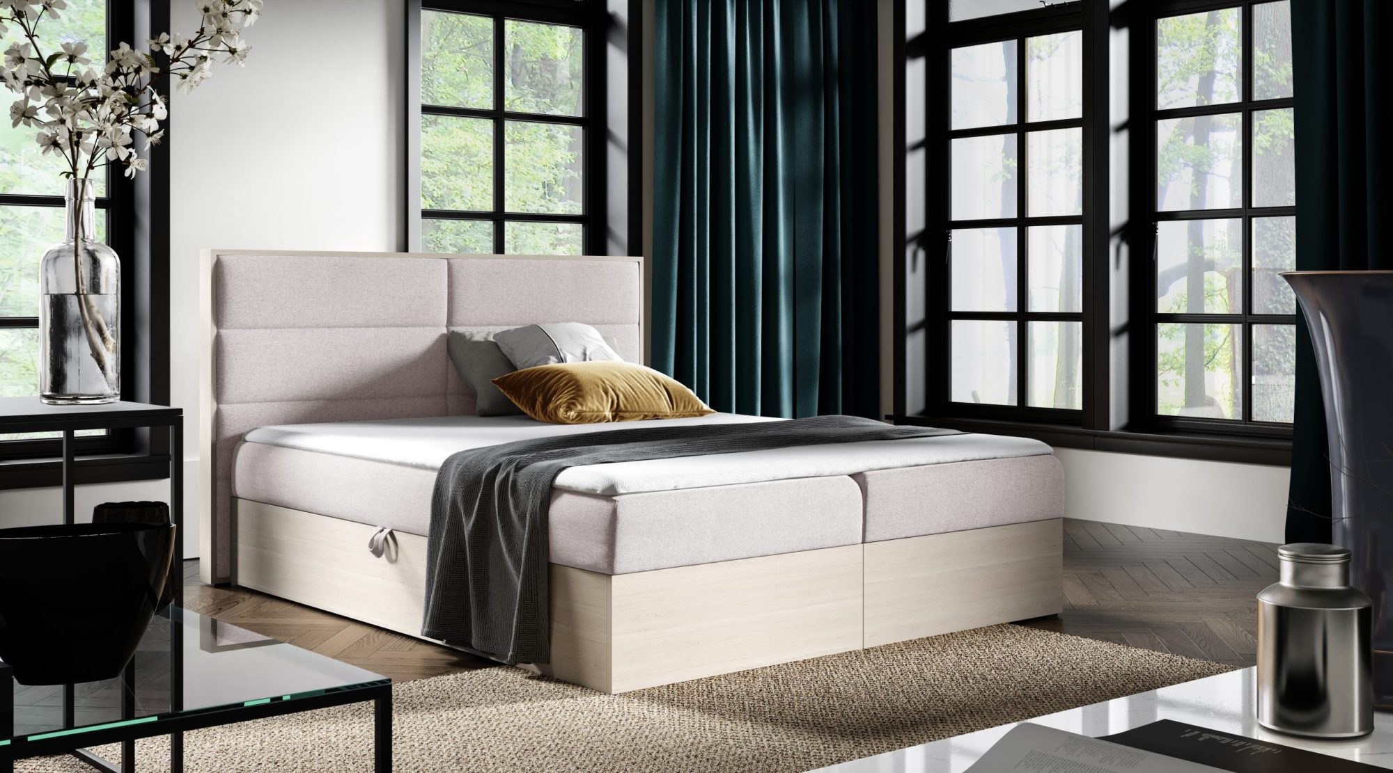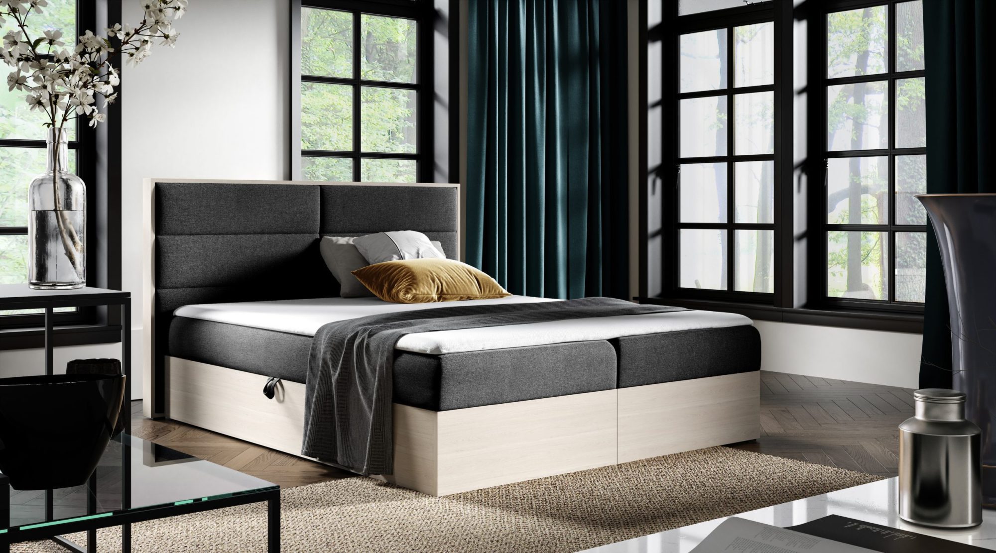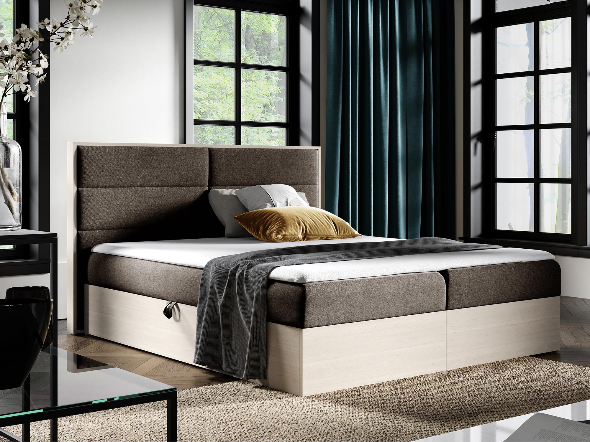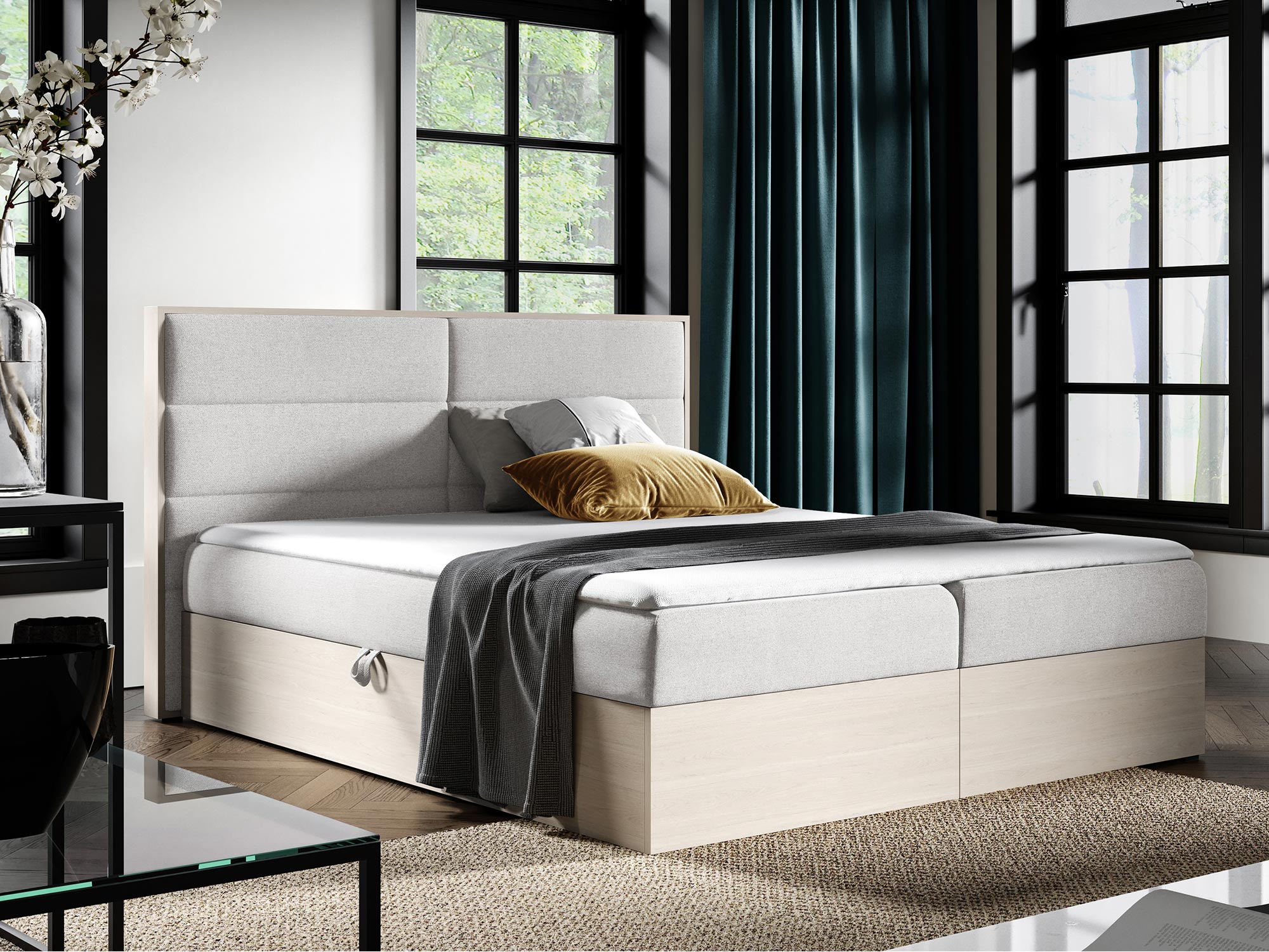 - Dwa pojemniki na pościel, które zapewniają dodatkową przestrzeń do przechowywania