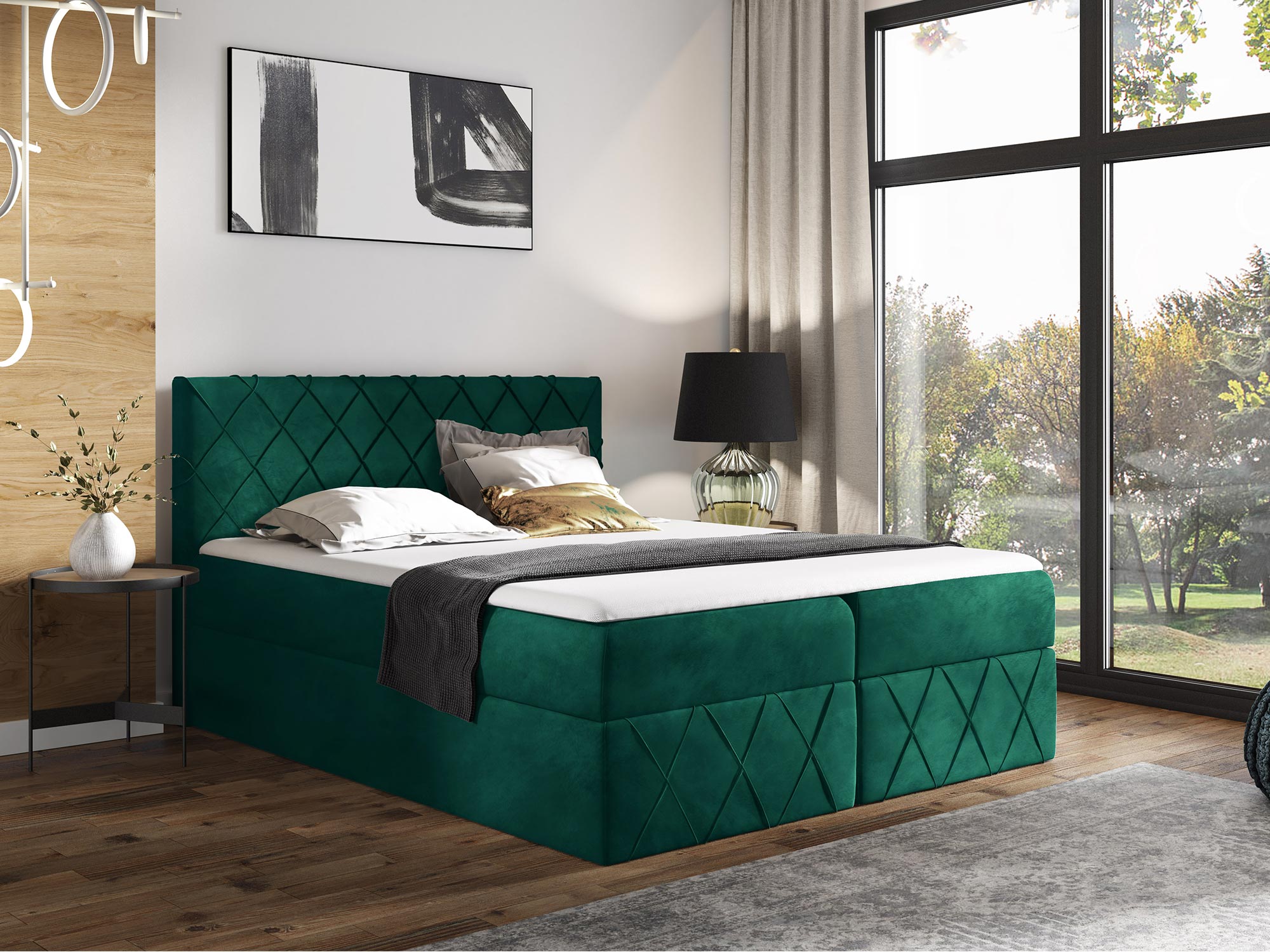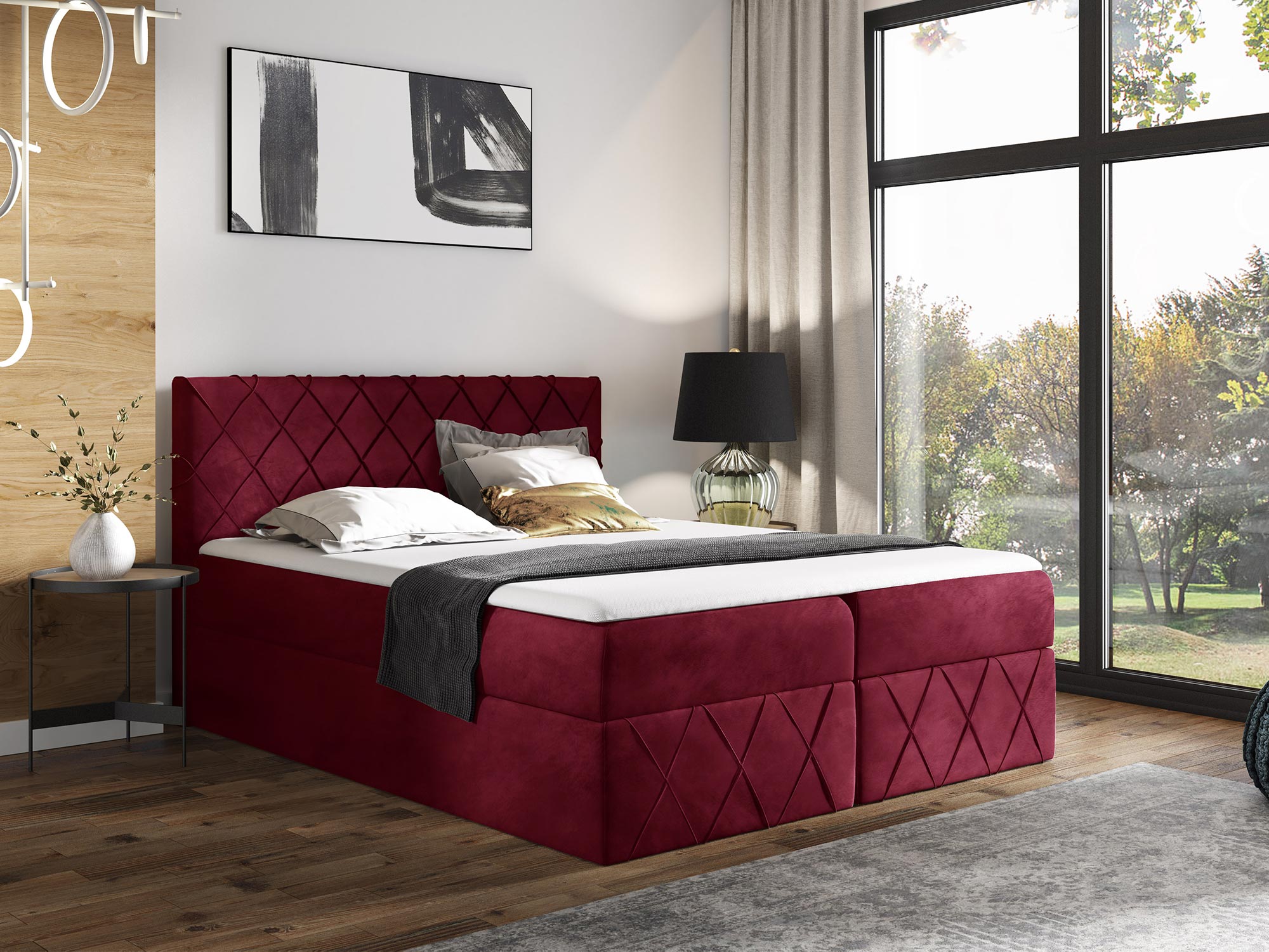 – Nowoczesny design – brak nóżek, ozdobne przeszycia i pełna tapicerka nadają łóżku elegancji i subtelności.