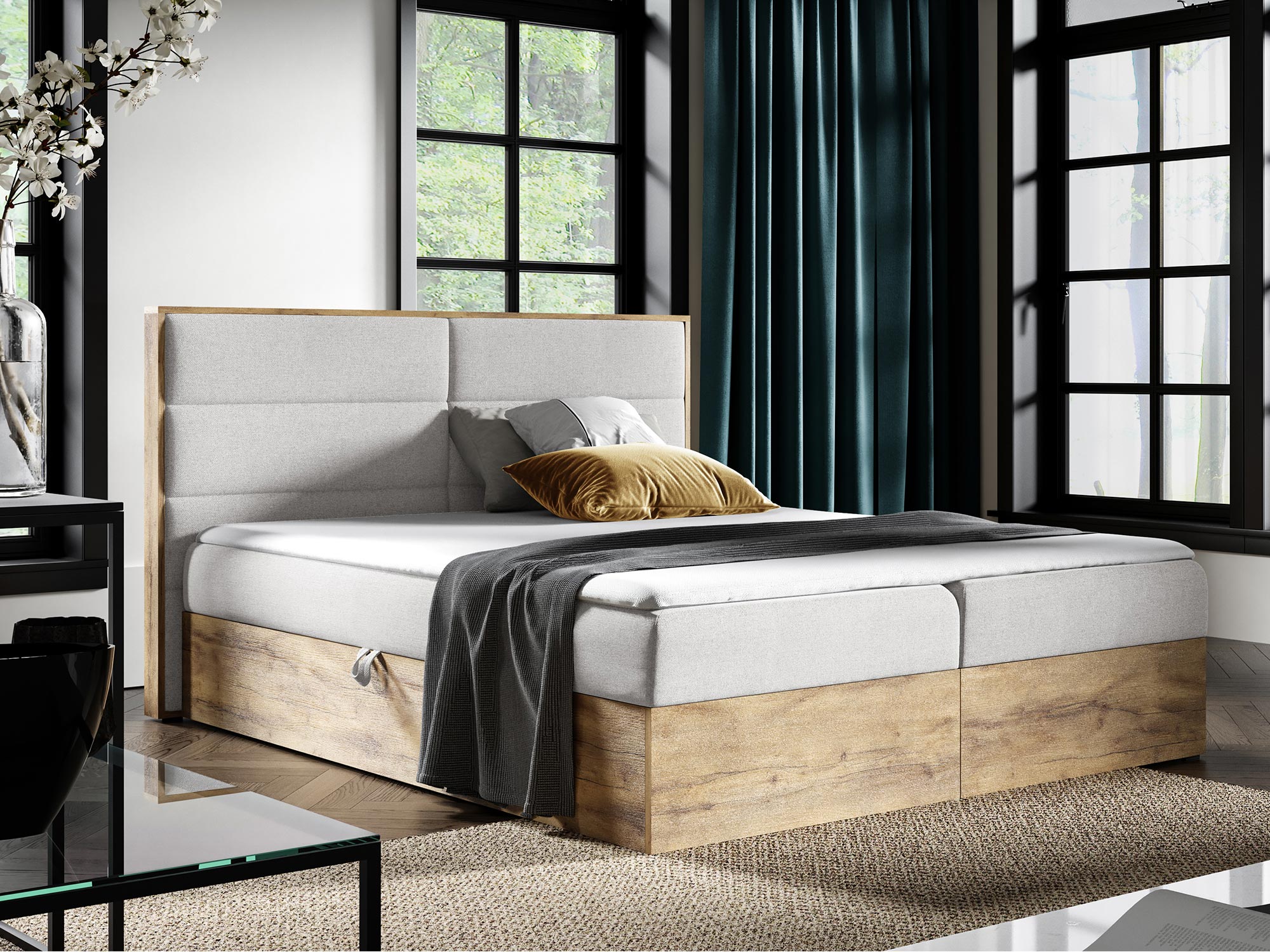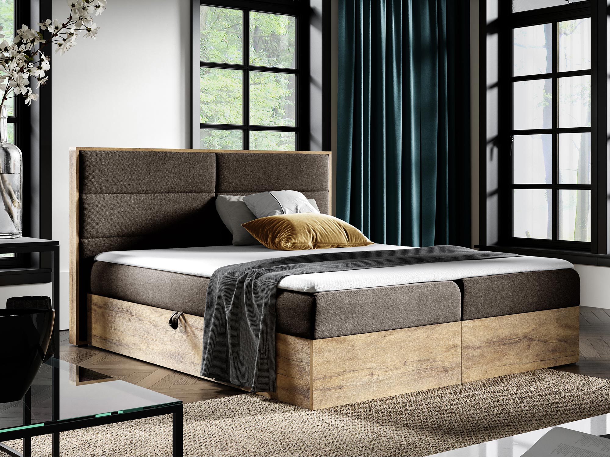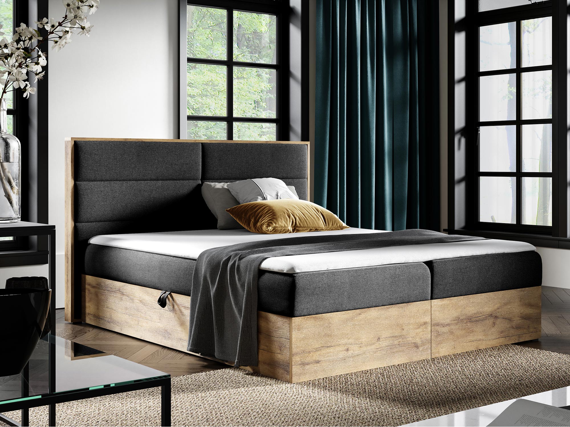 Łóżko CEDRIC 1 to kwintesencja stylu industrialnego, który łączy w sobie surowość formy z naturalnym ciepłem drewna. Część zagłowia oraz skrzynie wykonane z płyty laminowanej w kolorze dąb wotan podkreślają naturalny urok drewna, dodając wnętrzu przytulności. Połączenie prostych linii, minimalistycznej konstrukcji i ciepłych tonacji drewna sprawia, że łóżko idealnie wpisuje się w nowoczesne wnętrza, jednocześnie wprowadzając do nich element elegancji i stylu.