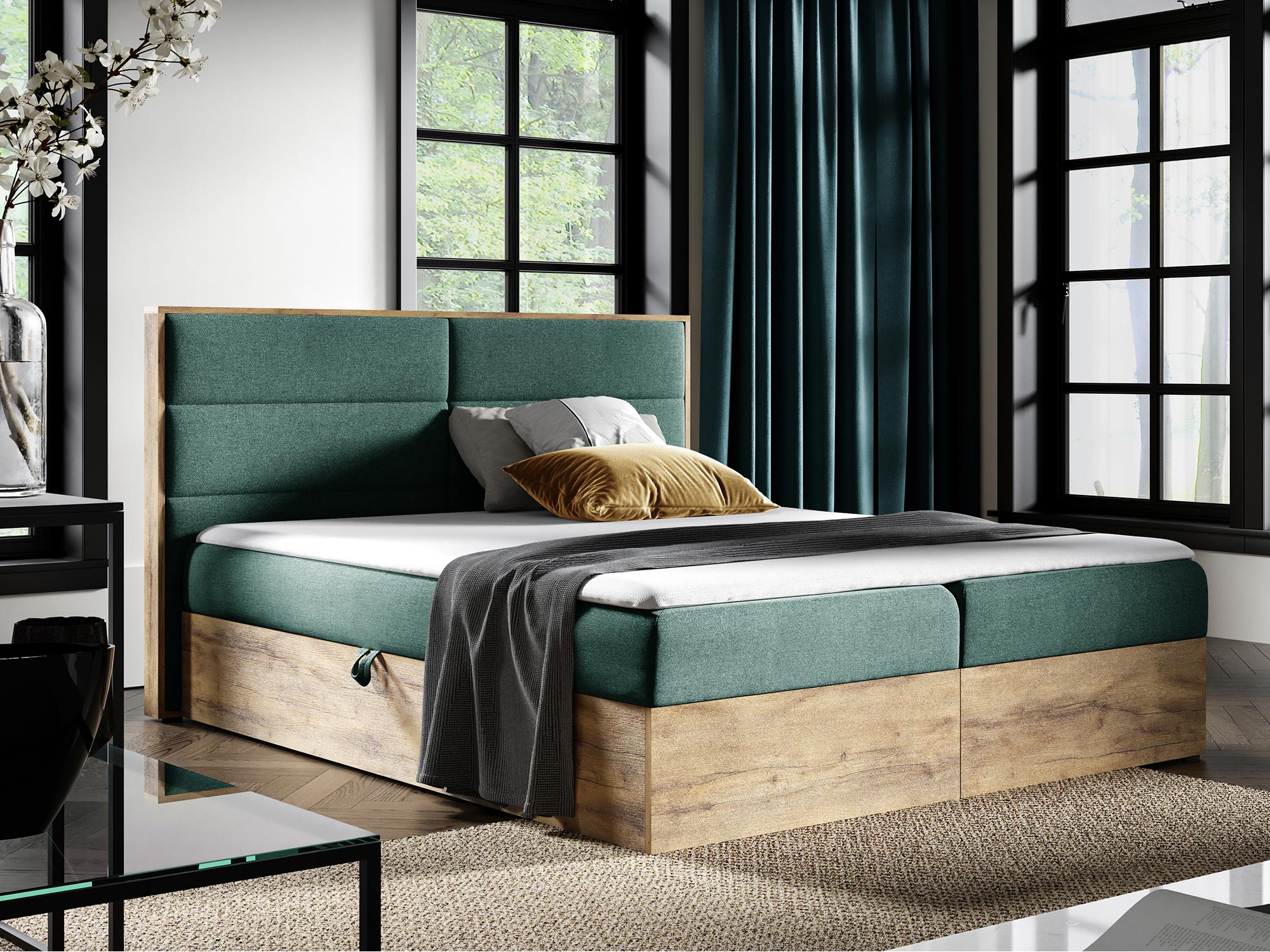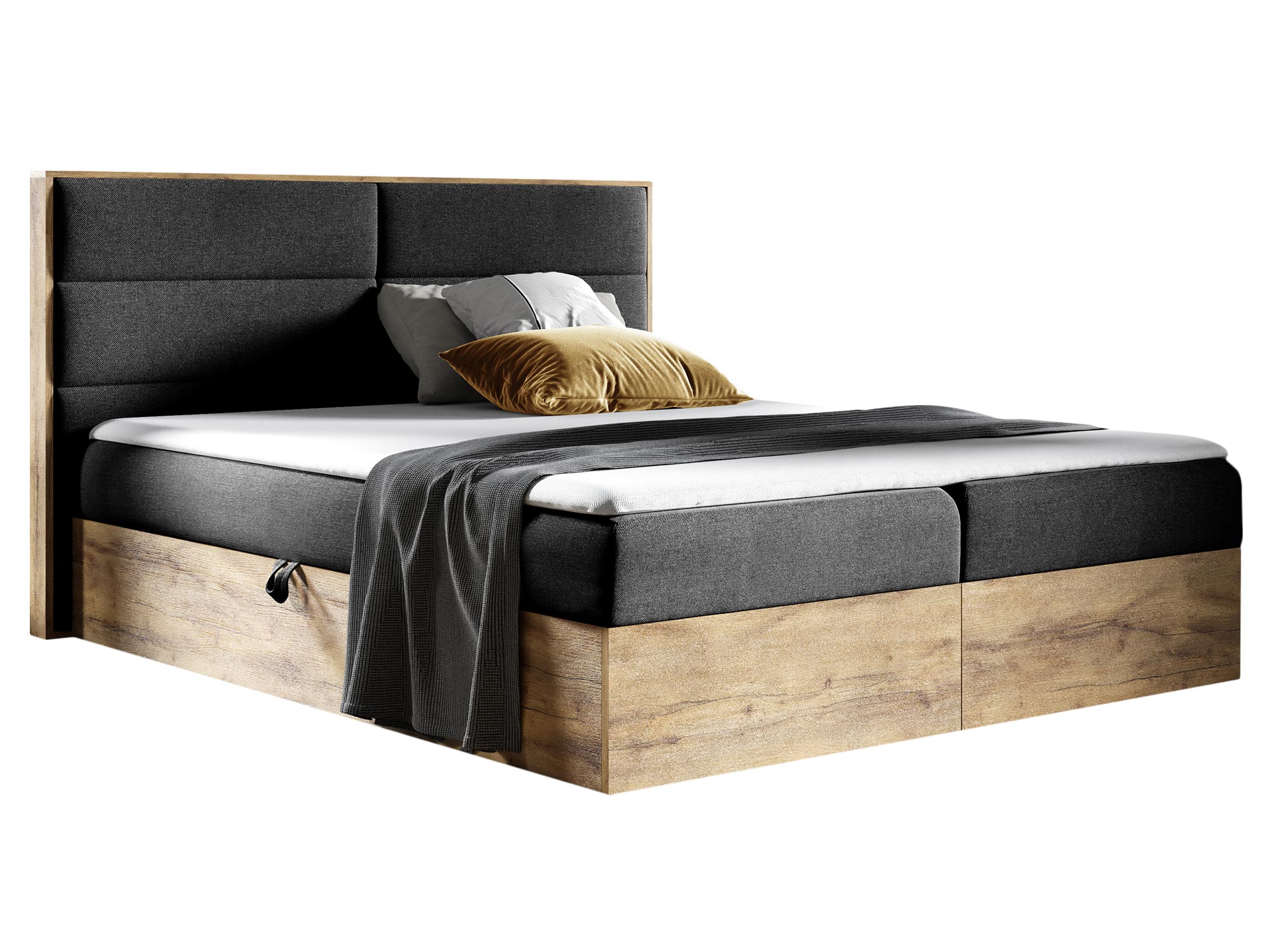 - Dwa pojemniki na pościel, otwierane automatem na sprężynach, zapewniające dodatkową przestrzeń do przechowywania