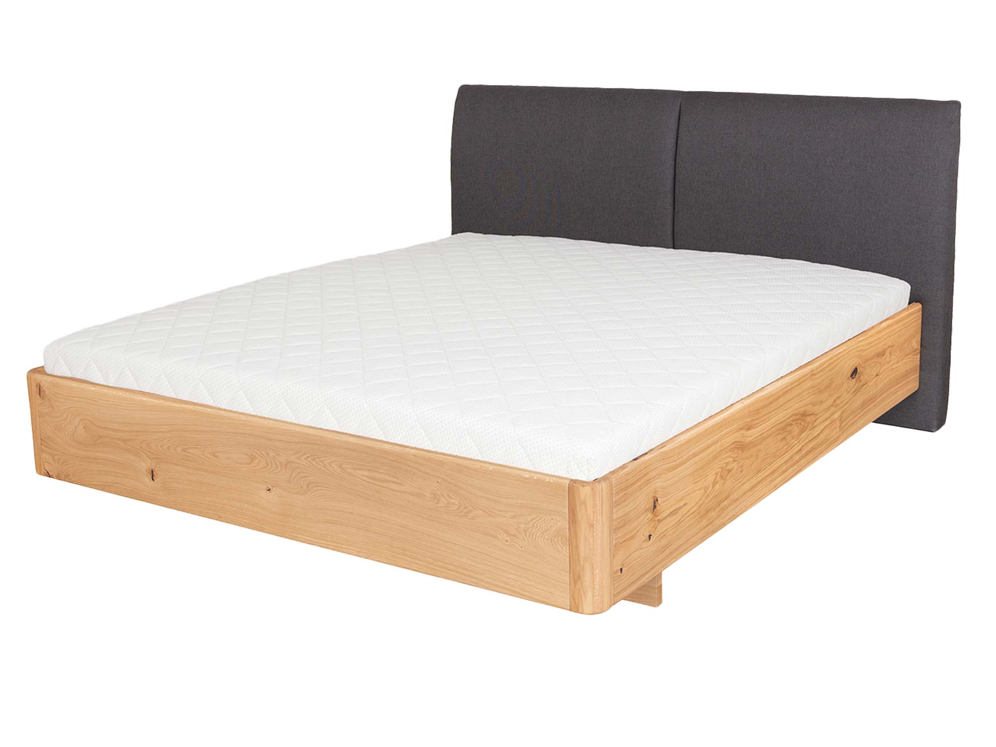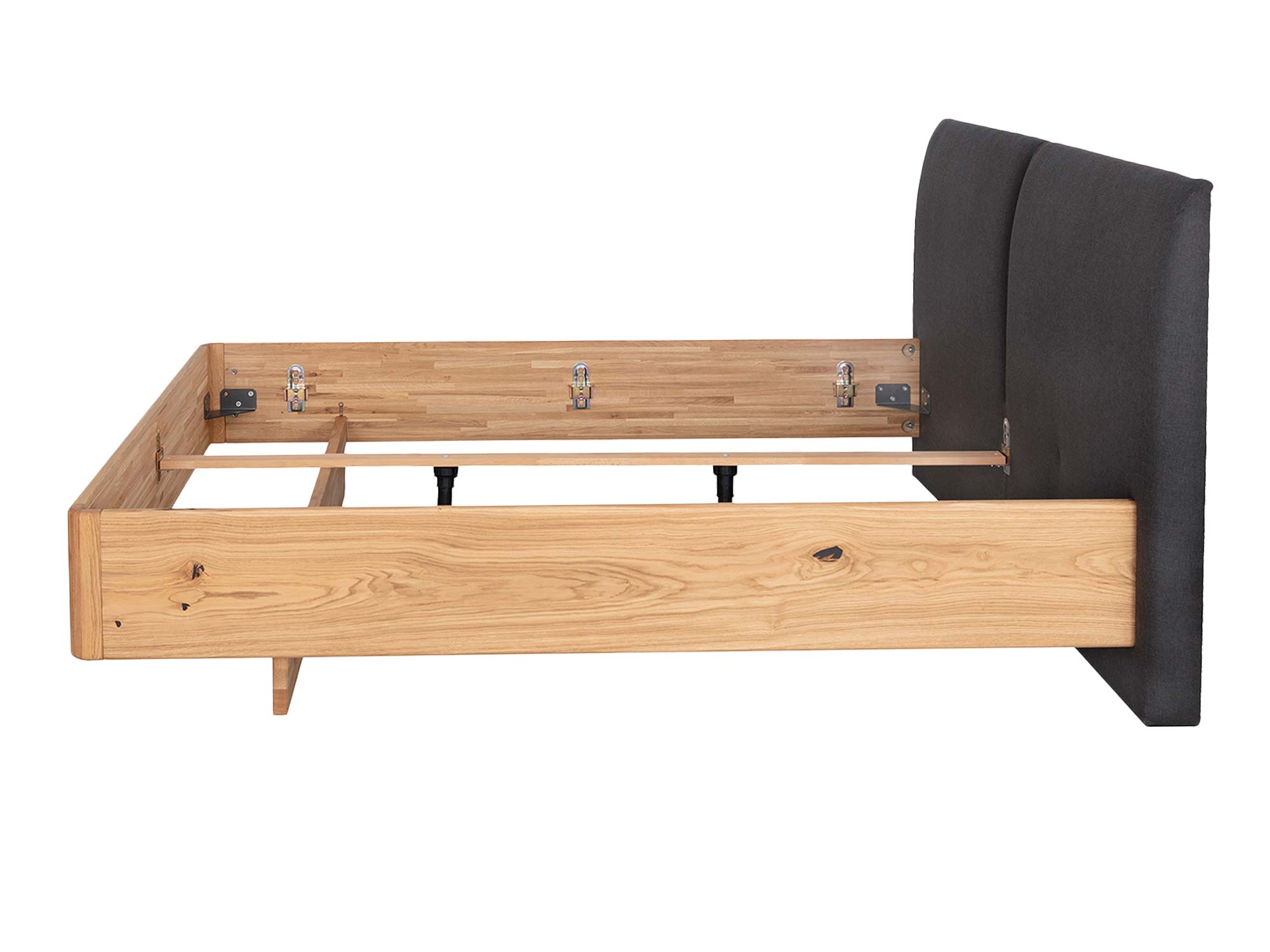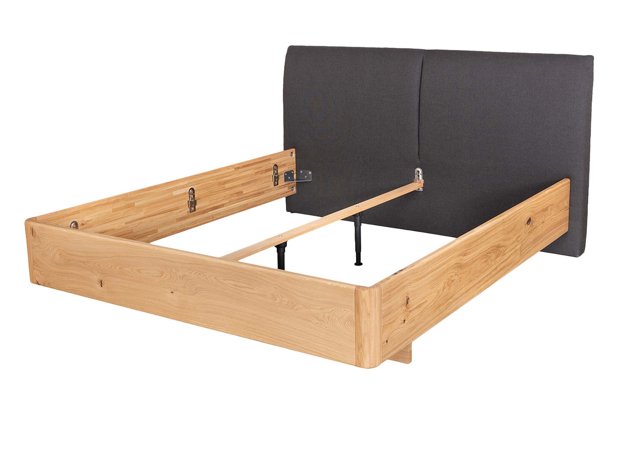 Subtelnie zaokrąglona rama łączy prostotę nowoczesnej linii z miękkością kształtu. W praktyce oznacza to większe bezpieczeństwo (brak ostrych krawędzi) oraz płynne przejścia, które sprawiają, że łóżko wygląda lekko, mimo masywnego, dębowego korpusu. Łączenia są ukryte, a zastosowane okucia zapewniają sztywność i odporność konstrukcji na lata użytkowania.