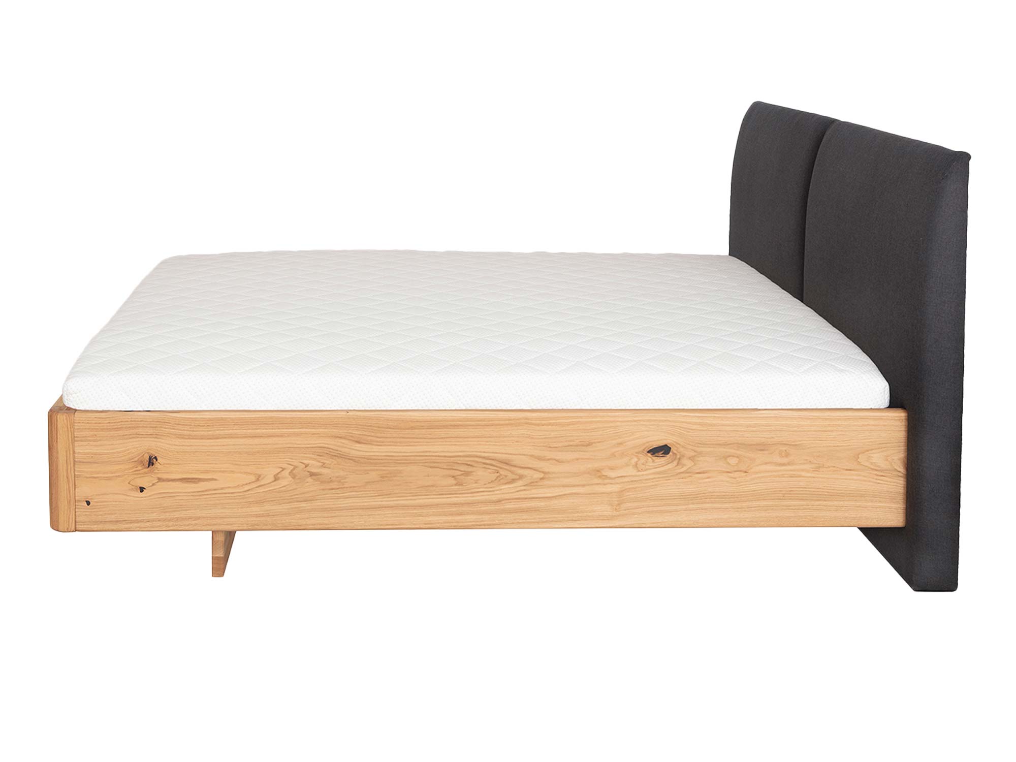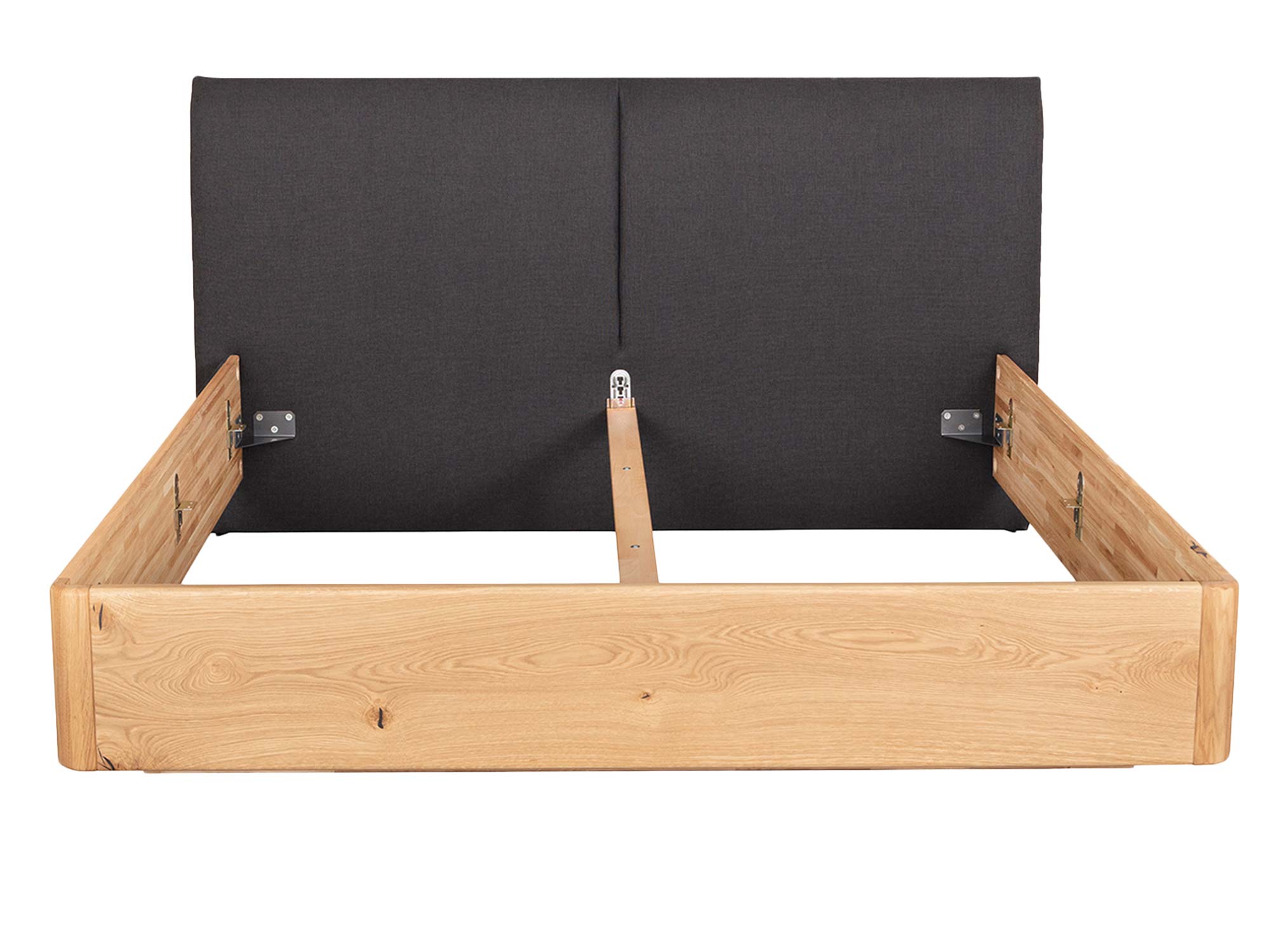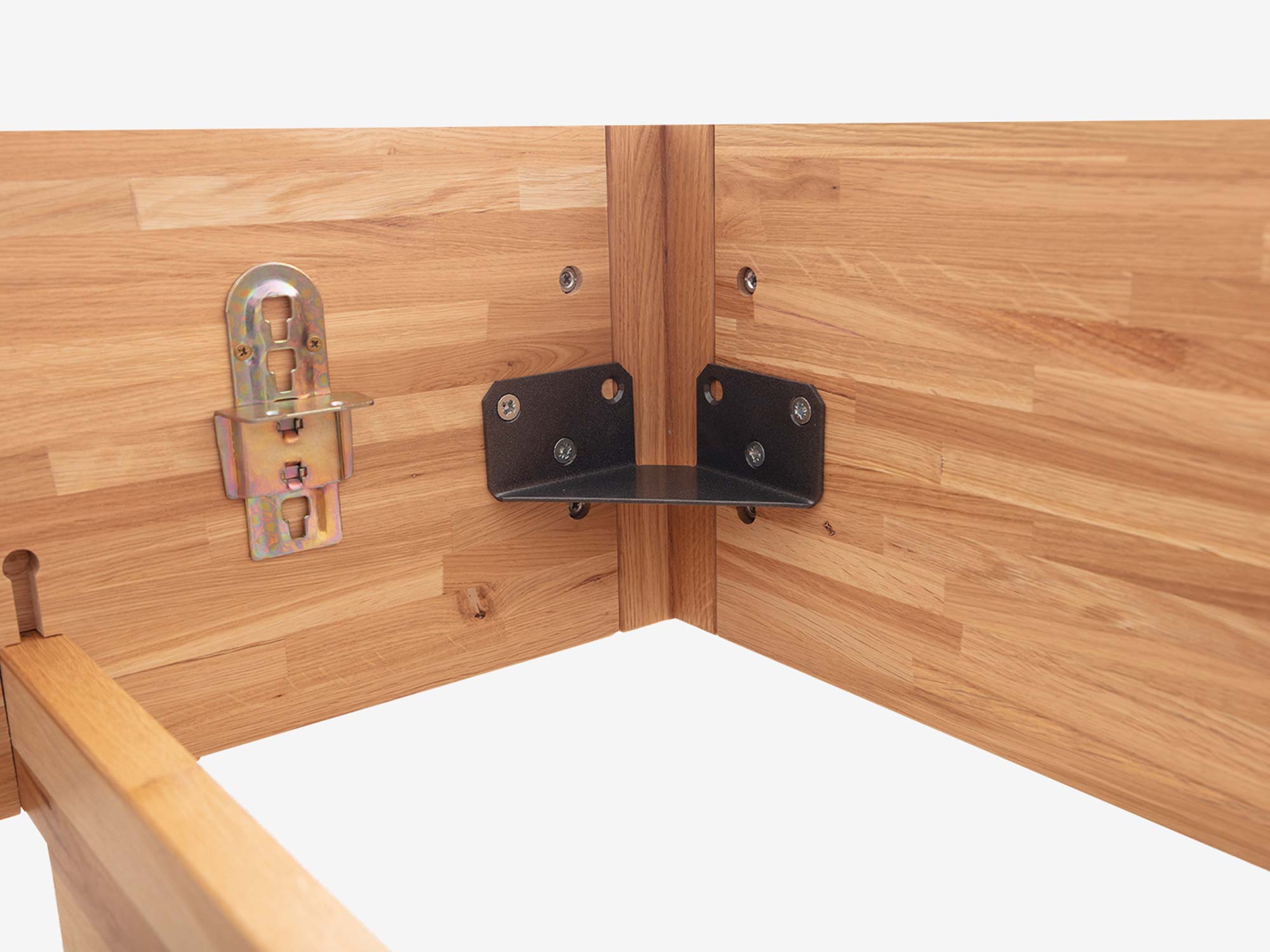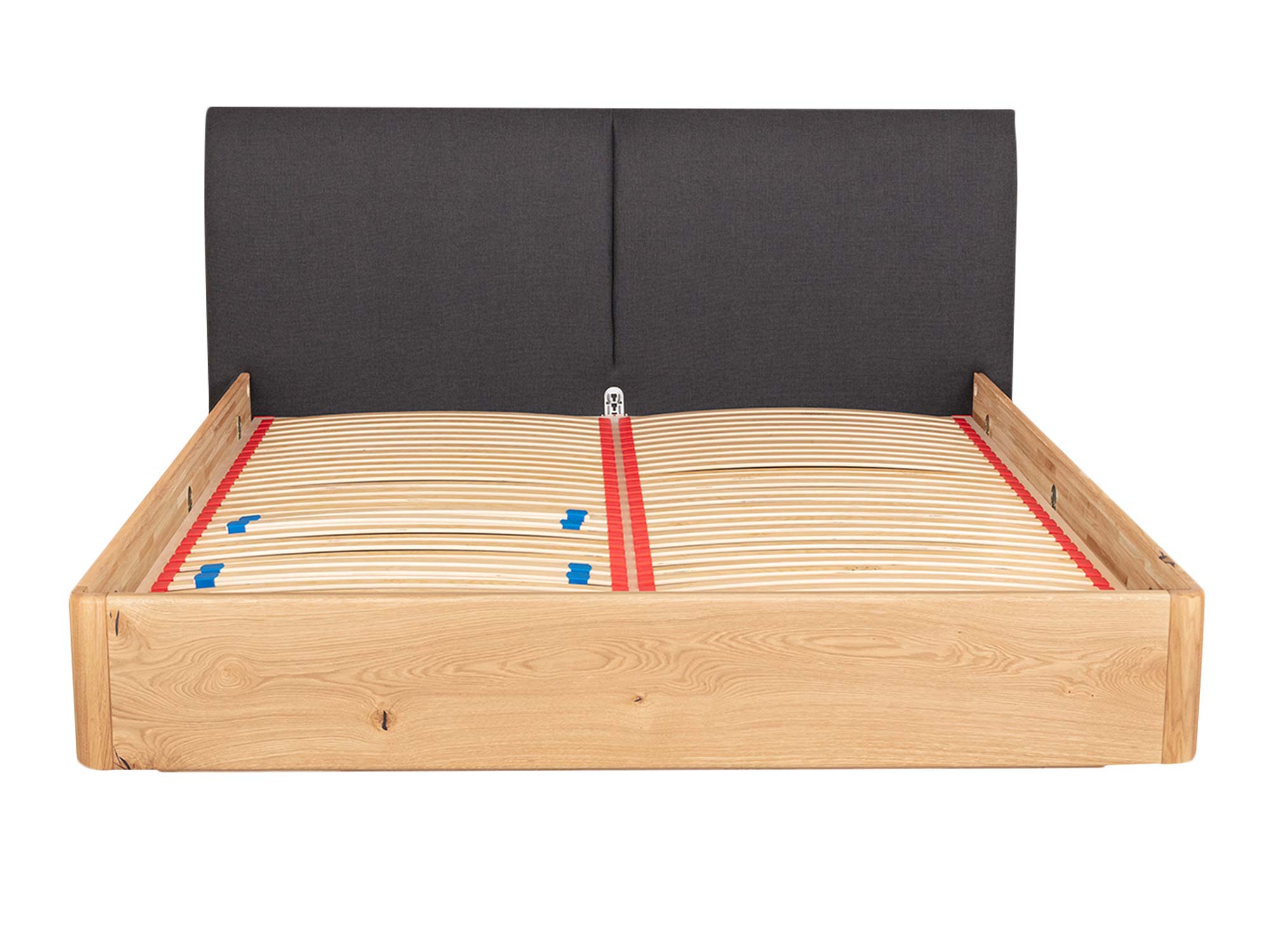 Subtelnie zaokrąglona rama łączy prostotę nowoczesnej linii z miękkością kształtu. W praktyce oznacza to większe bezpieczeństwo (brak ostrych krawędzi) oraz płynne przejścia, które sprawiają, że łóżko wygląda lekko, mimo masywnego, dębowego korpusu. Łączenia są ukryte, a zastosowane okucia zapewniają sztywność i odporność konstrukcji na lata użytkowania.