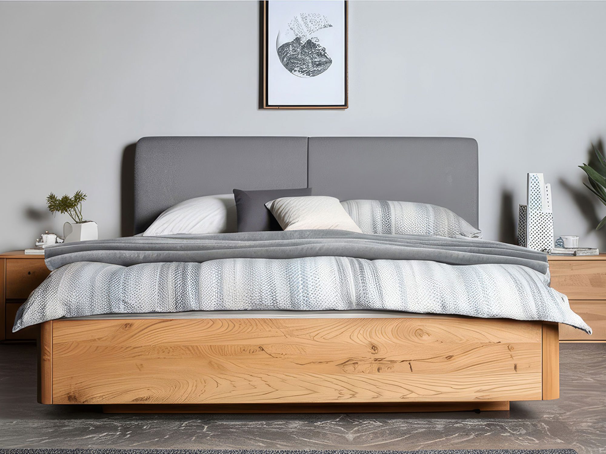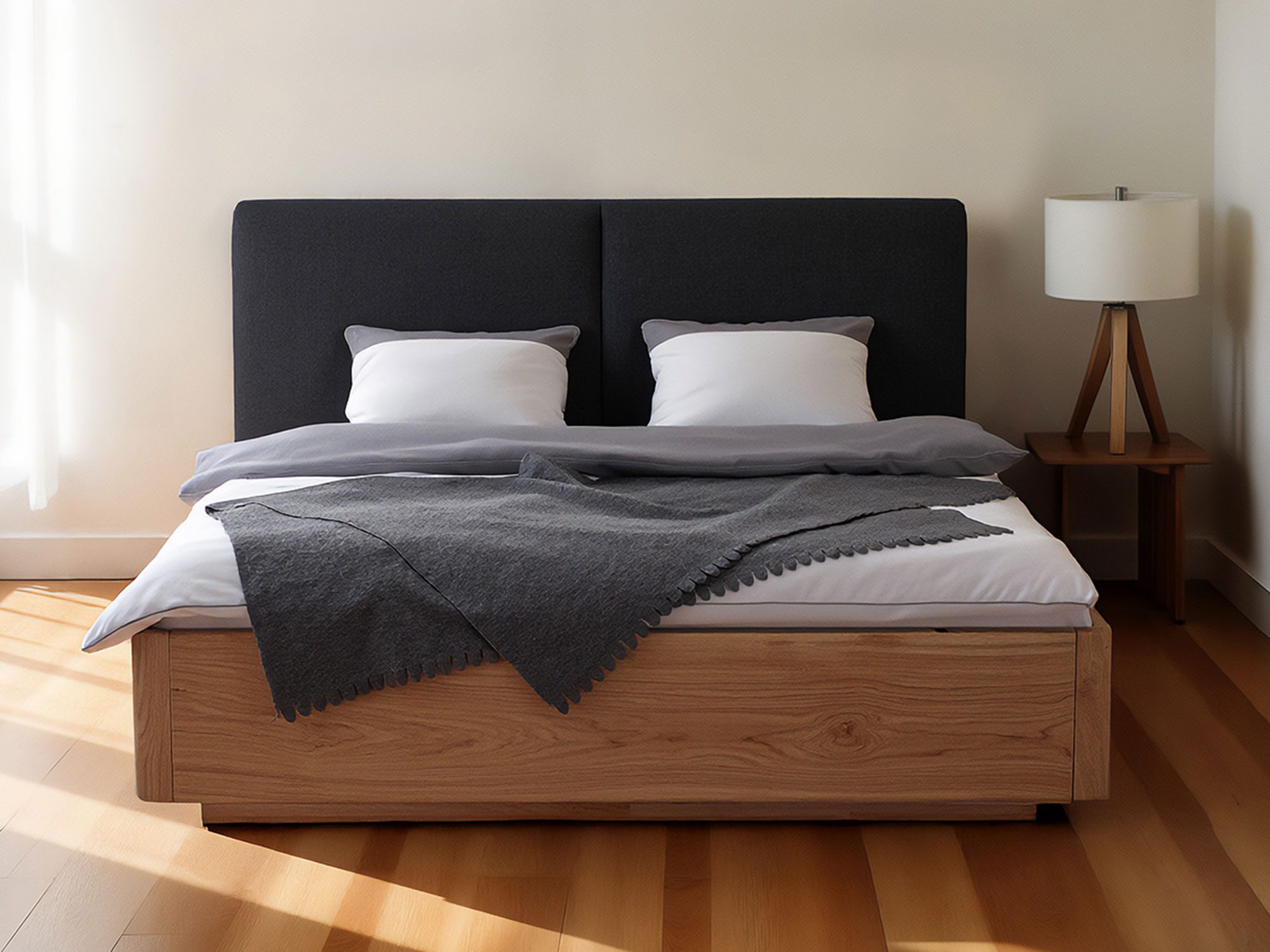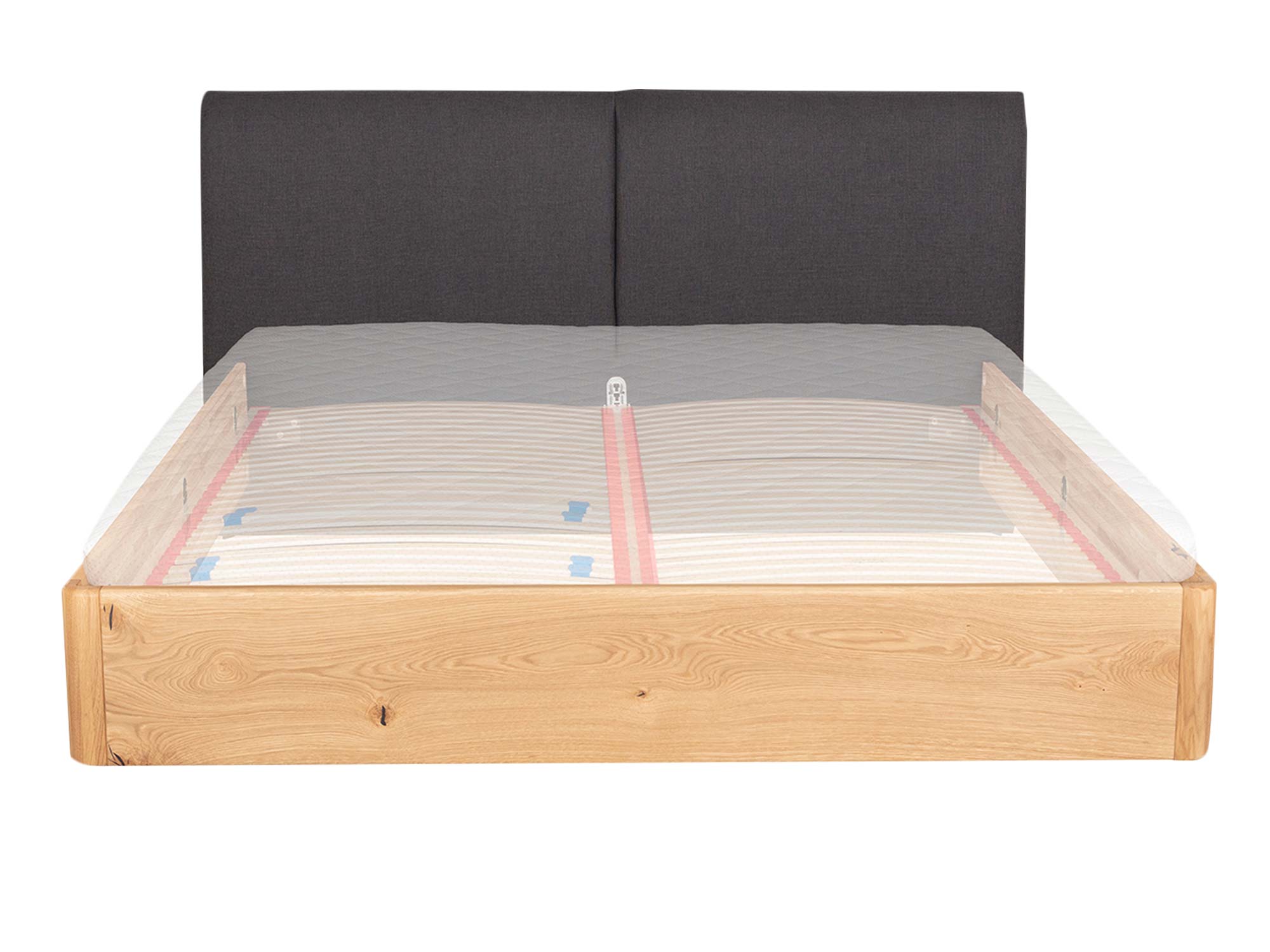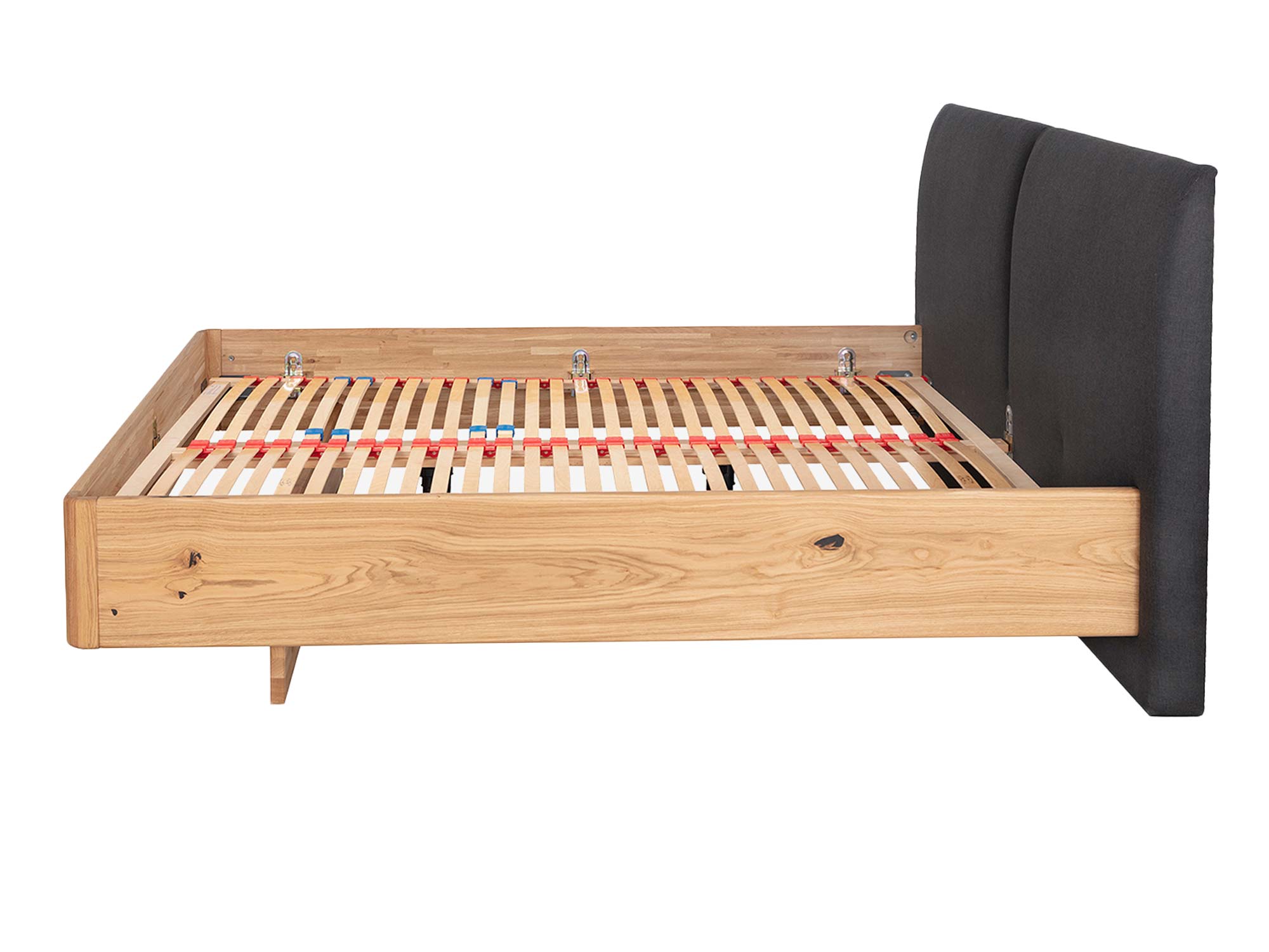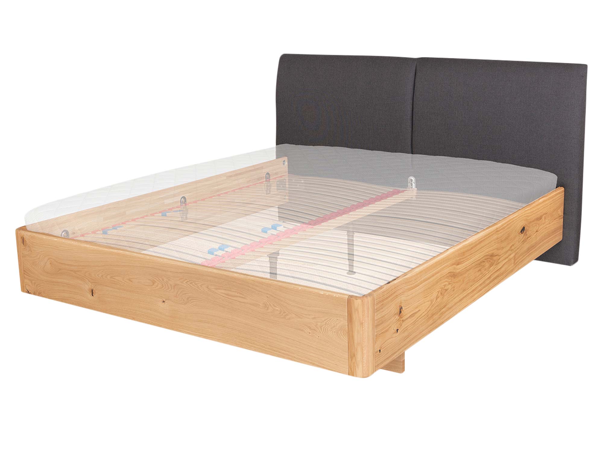 Stabilność bez kompromisów. Rama z litego dębu, wsparta precyzyjnymi złączami i nowoczesnymi okuciami, tworzy bazę pod wybrany stelaż i materac. Dzięki możliwości regulacji wysokości materaca łatwo dopasujesz poziom siedziska i ergonomię wsiadania do swoich potrzeb – to szczególnie ważne, gdy z łóżka korzystają osoby o różnym wzroście lub preferencjach.