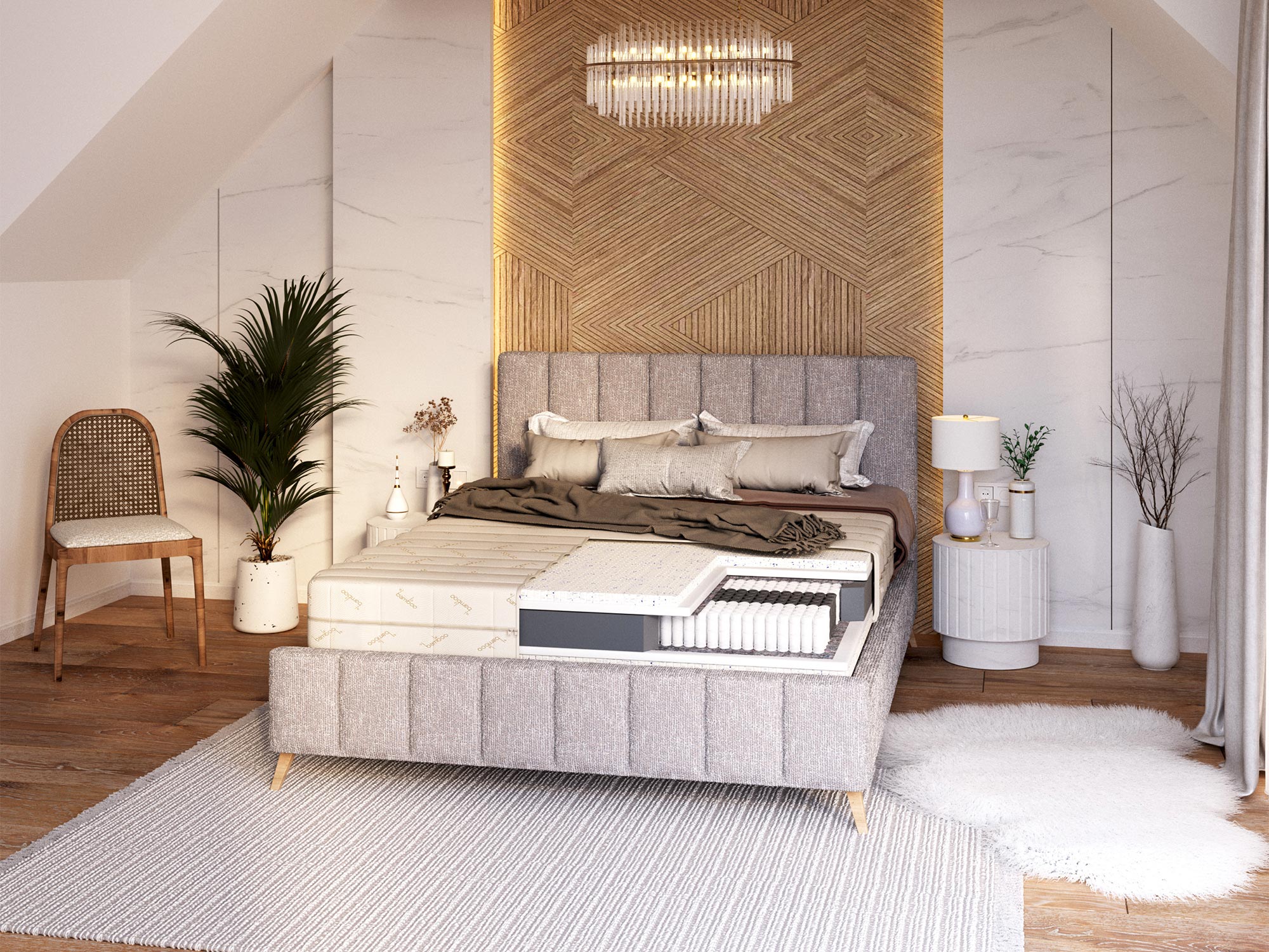 • 7-strefowe sprężyny multipocketowe: Sprężyny dzielą materac na 7 stref, każda odpowiadająca za odpowiednie podparcie dla danej części ciała.