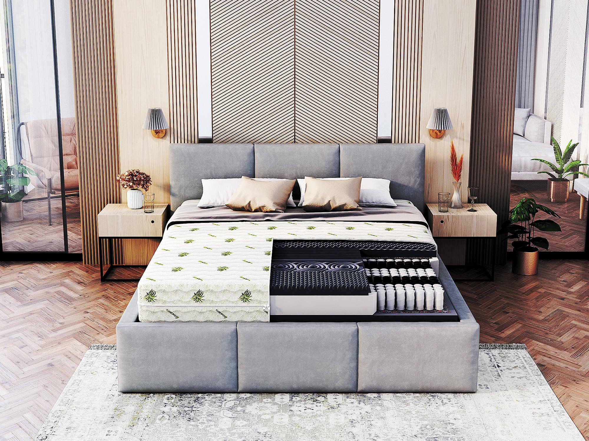 - Sprężyny kieszeniowe 7-strefowe – stworzone ze sprężyn znajdujących się w osobnych otulinach z niezwykle elastycznego materiału.