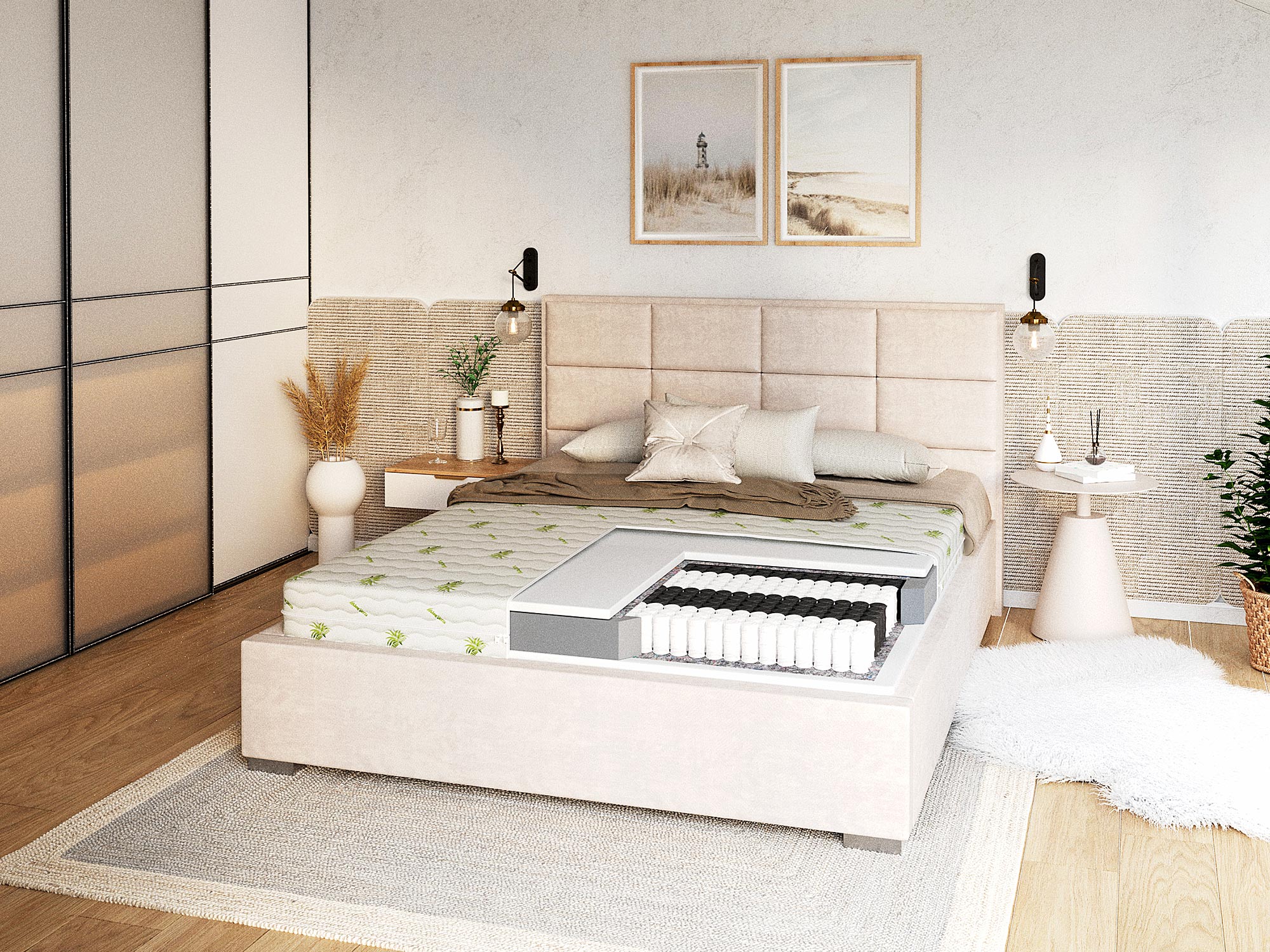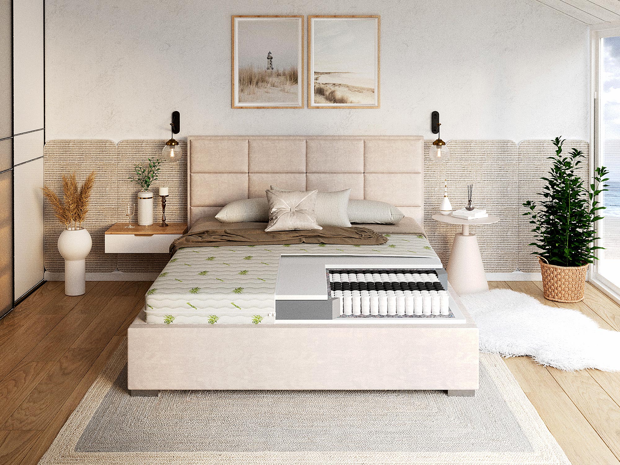 Tapicerowane łóżko beżowe z materacem kieszeniowym w jasnej sypialni