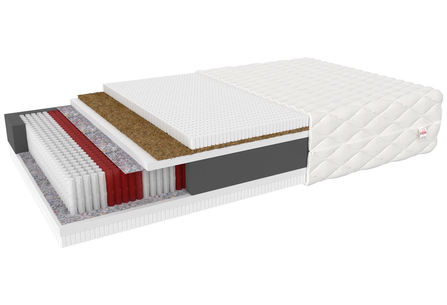 Materac VERMONT w szczególności wykonano z pianki poliuretanowej T25. Przez zwiększoną wytrzymałość i wyśmienitej przepuszczalności powietrza gwarantuje wspaniałą izolację termiczną. Dodatkowo zastosowany wkład kokosowy w 100% ekologiczny zapewnia spokojny sen. Jego cechy antyalergiczne zapobiegają rozwojowi mikroorganizmów i roztoczy. Ponadto wykorzystany system multi kieszeniowy jest złożony z siedmiu sektorów twardości. Są one skonstruowane z wielu sprężyn znajdujących się w osobnych otulinach z niezwykle elastycznego materiału. Kolejnym materiałem, z którego składa się materac jest lateks. Przez jego wykorzystanie materac ponownie zyskuje na elastyczności i jeszcze szybciej wraca do pierwotnego kształtu. Lateks dopasowuje się do kształtu ciała i ułatwia swobodną cyrkulację powietrza. Co więcej opisywany materac jest dwustronny, przez co można, a nawet trzeba co jakiś czas odwracać go zarówno w pionie jak i w poziomie, przedłuży to jego żywotność i będzie on długo spełniać oczekiwania użytkowników.
