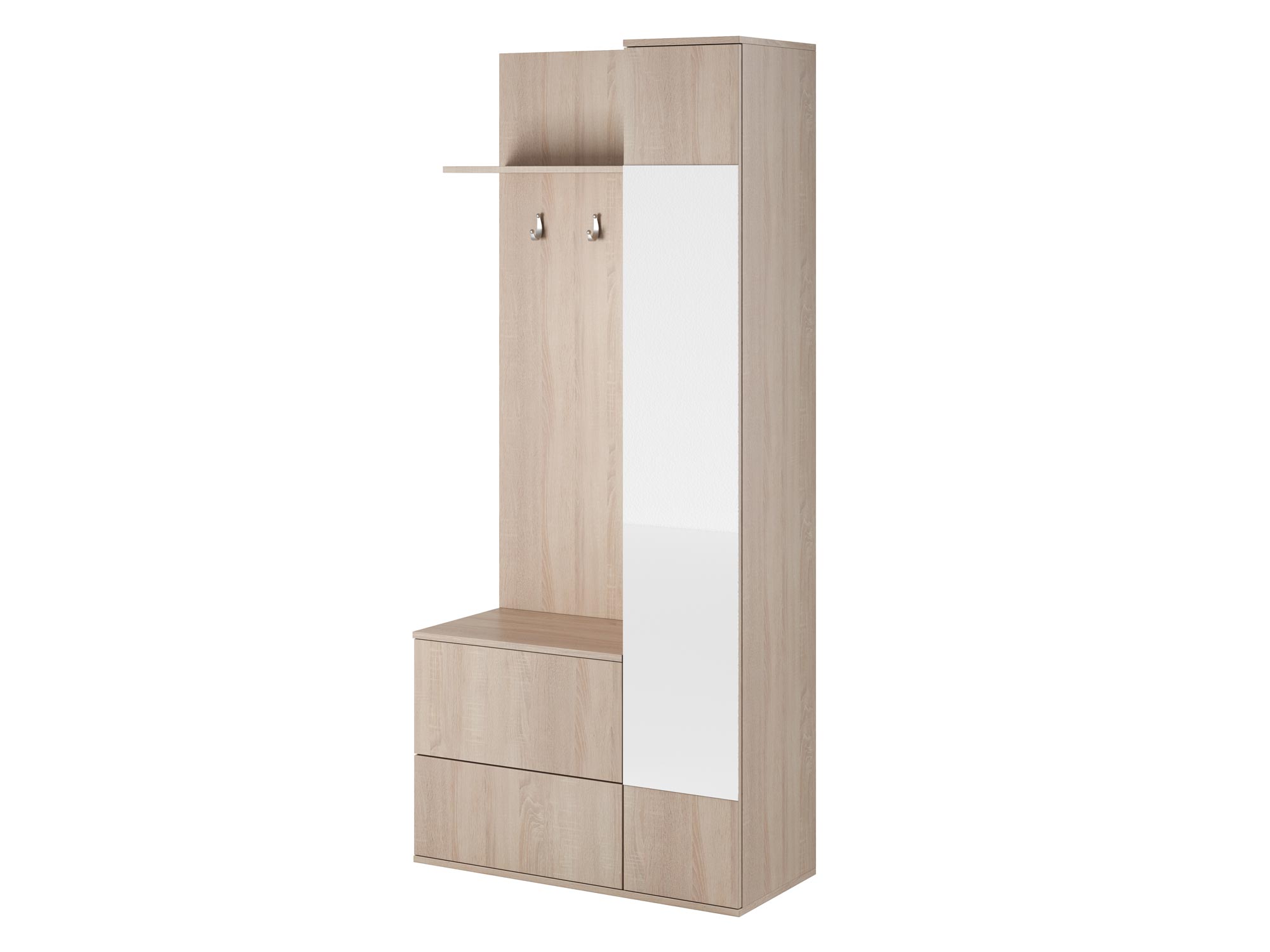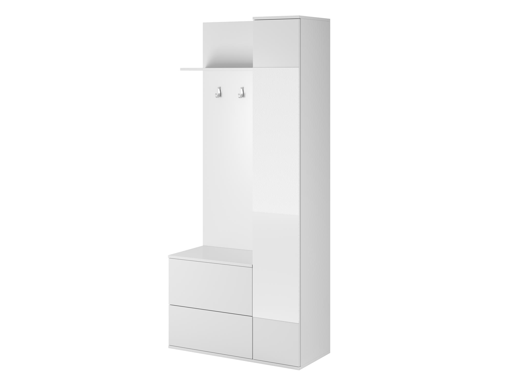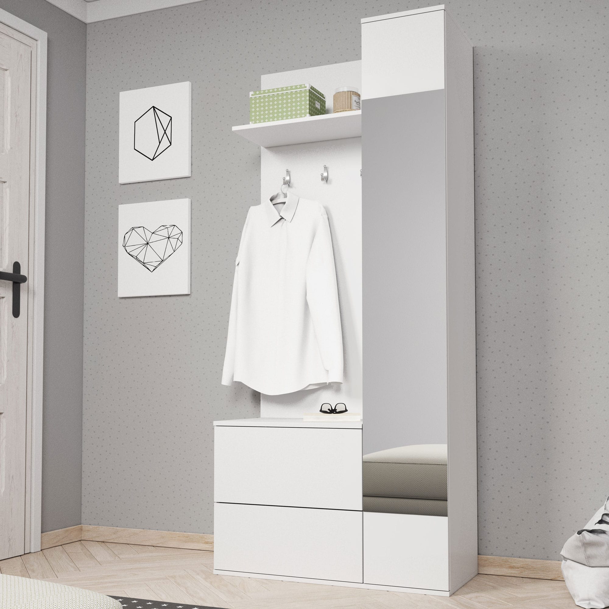 - Dwie szafki na buty, wieszaki, półka oraz szafa z lustrem z pięcioma półkami.