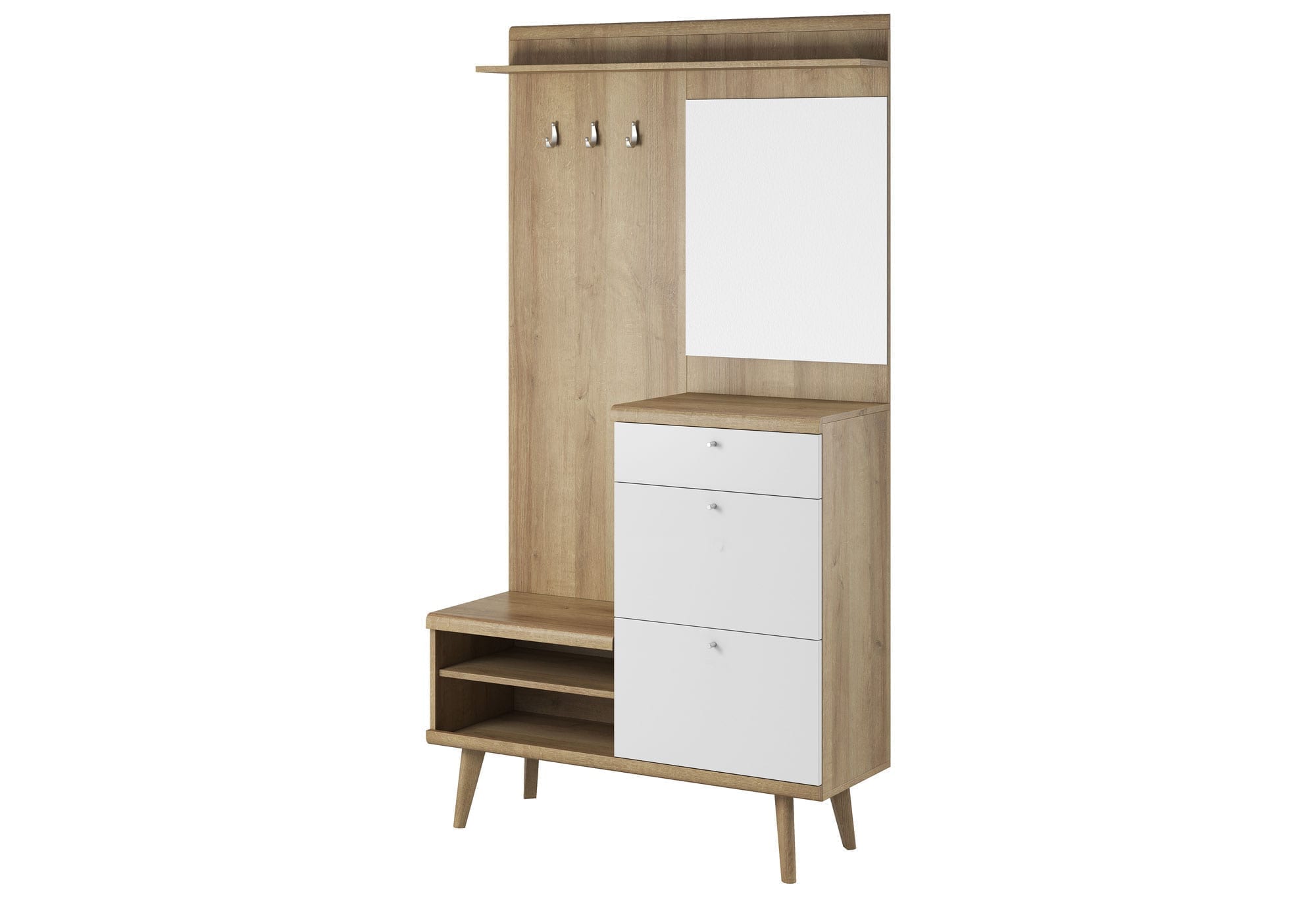 Garderoba ITALIA jest dedykacją dla wszystkich, szukających funkcjonalnych i wysoce estetycznych rozwiązań do swojego domu. Co więcej to minimalistyczny styl odnajdujący się we wnętrzach nowoczesnych i skandynawskich. Z pewnością mebel charakteryzuje się wytrzymałością, doskonałym wykonaniem oraz zestawieniem klasycznej bieli ze szlachetnością dekoru dębu riviera. Przede wszystkim garderoba wyposażona została w panel z prostokątnym lustrem, trzy wieszaki na okrycia wierzchnie, dwie otwarte komory, które mogą służyć jako półki na buty, pojemną szufladę oraz dwie komory zamykane drzwiczkami. Niewątpliwie całość osadzona na wysokich nóżkach sprawia wrażenie lekkości i przestronności. Funkcjonalna garderoba z łatwością przechowa niezbędne rzeczy, zapewniając ład w pomieszczeniu.
