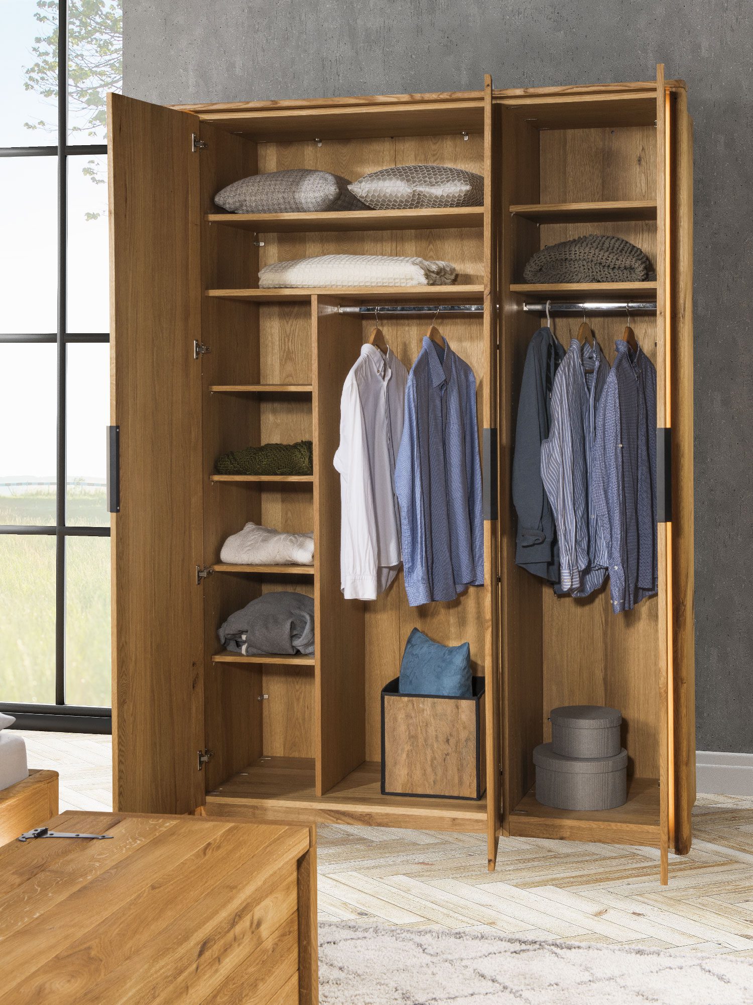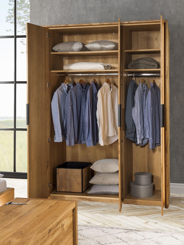 - Luksusowe wykończenie: Miękkie, szczotkowane powierzchnie litego drewna dębowego nadają każdemu meblowi niepowtarzalny charakter i tworzą przytulną atmosferę w sypialni.