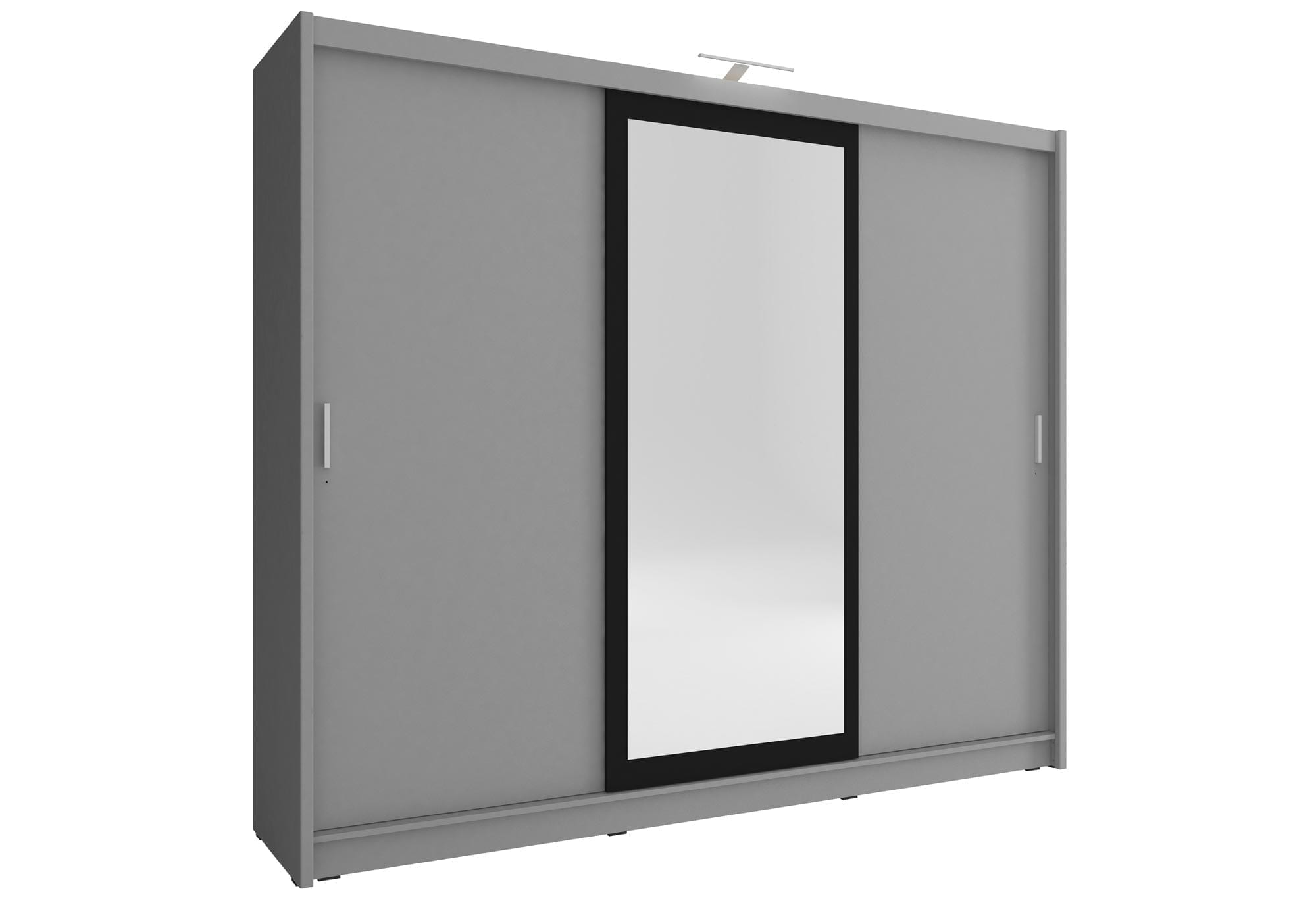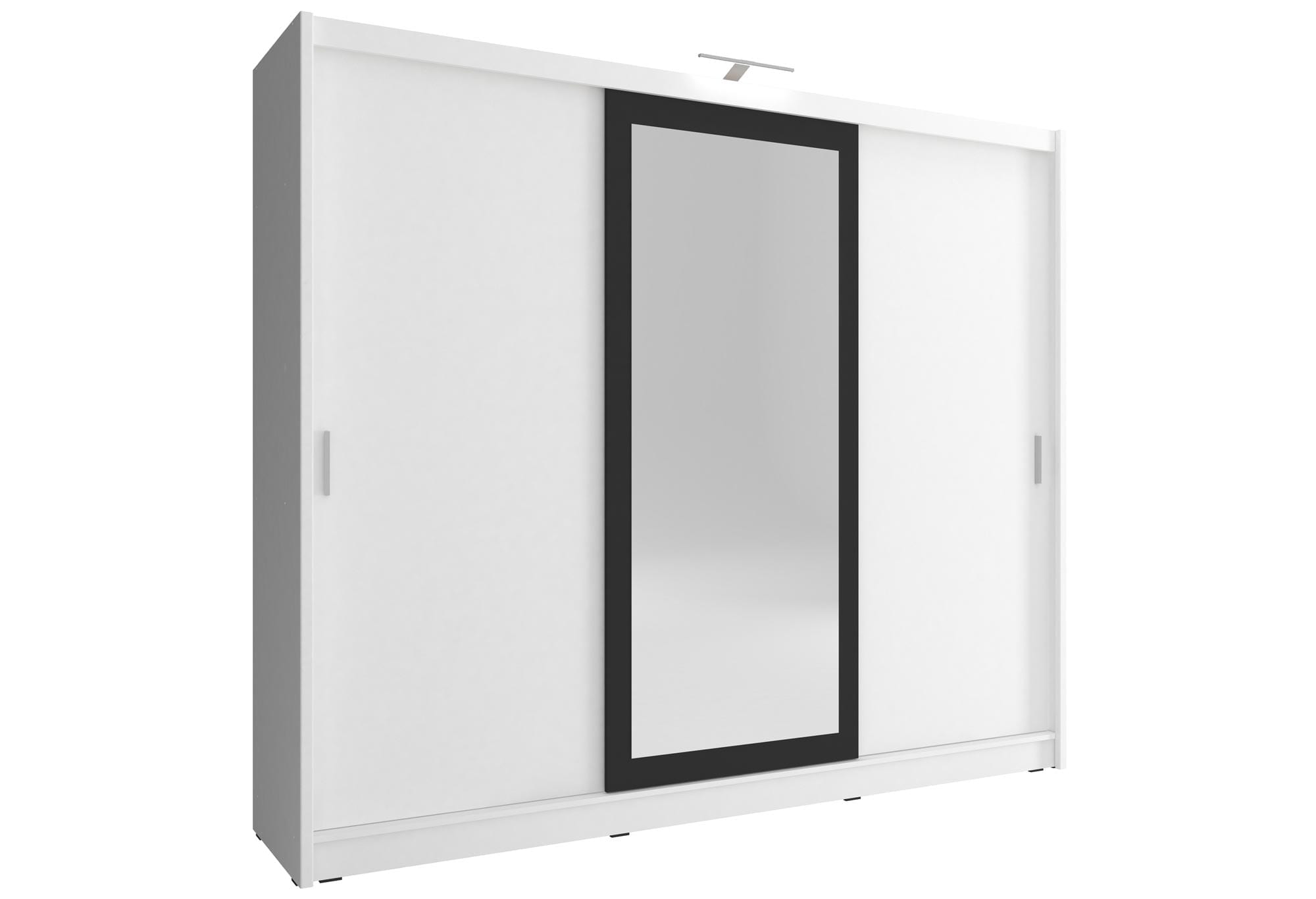 Duża trzydrzwiowa szafa na ubrania SIMENA II 250cm jest to propozycja mebla bardzo stylowego i eleganckiego. Ekstrawagancki dodatek w postaci czarnego dekoru wokół lustra sprawia, że szafa wyróżnia się wśród innych propozycji. Szafa jest nie tylko efektowna, ale posiada również funkcjonalne wnętrze. Dodatkowo troje drzwi przesuwnych zapewniają dużą pojemność.