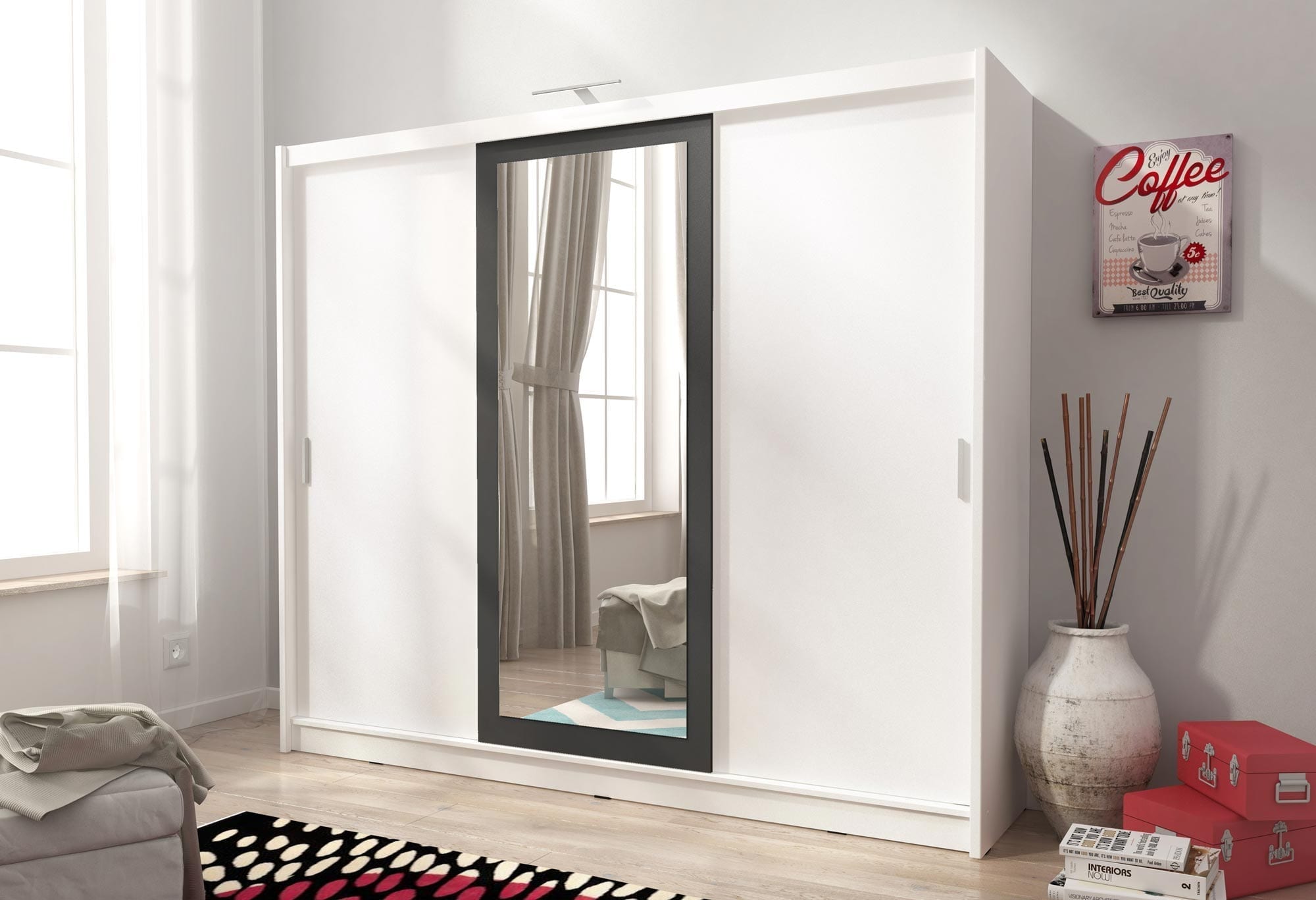 Szafa SIMENA II to mebel o nowoczesnym designie, który idealnie wpasuje się we wnętrze sypialni, przedpokoju czy garderoby. Ponadto na funkcjonalne wnętrze szafy składają się pojemne półki oraz dwa drążki. Co więcej posiada troje drzwi przesuwnych, z których na środkowych zostało umieszczone duże lustro pozwalające na optyczne powiększenie pomieszczenia.