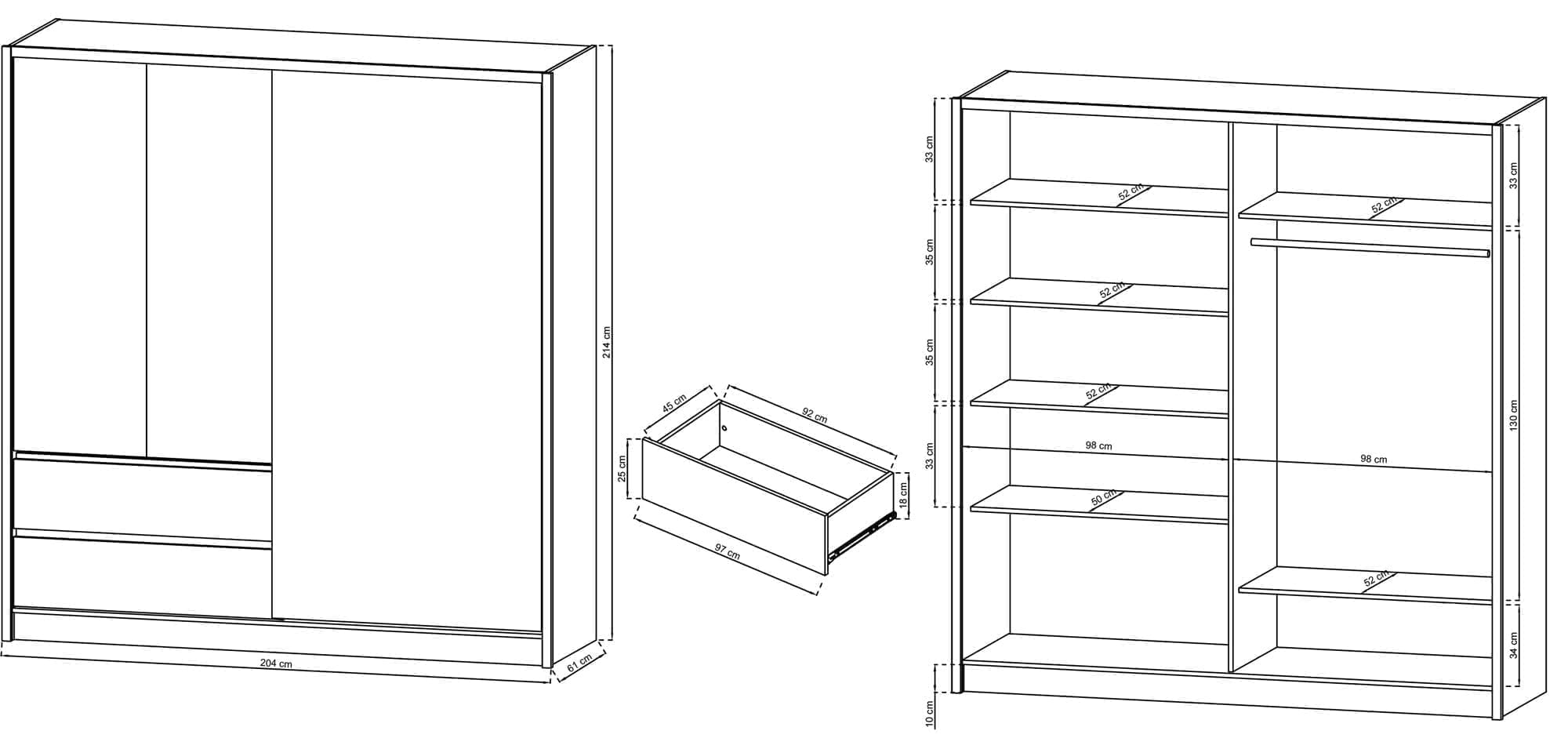 Propozycja Szafy TORINO wykonana z wysokiej jakości płyty laminowanej która ma grubość 16 mm i podwyższoną odporność na zarysowania. Ponadto obrzeża wykończono specjalną okleiną ABS. Drzwi przesuwne w jakie wyposażona jest szafa są umieszczone na aluminiowych prowadnicach. Dwudrzwiowa szafa TORINO 200cm w środku posiada drążek oraz liczne półki i szuflady zewnętrzne. Zobacz w naszym sklepie modele szaf drewnianych.