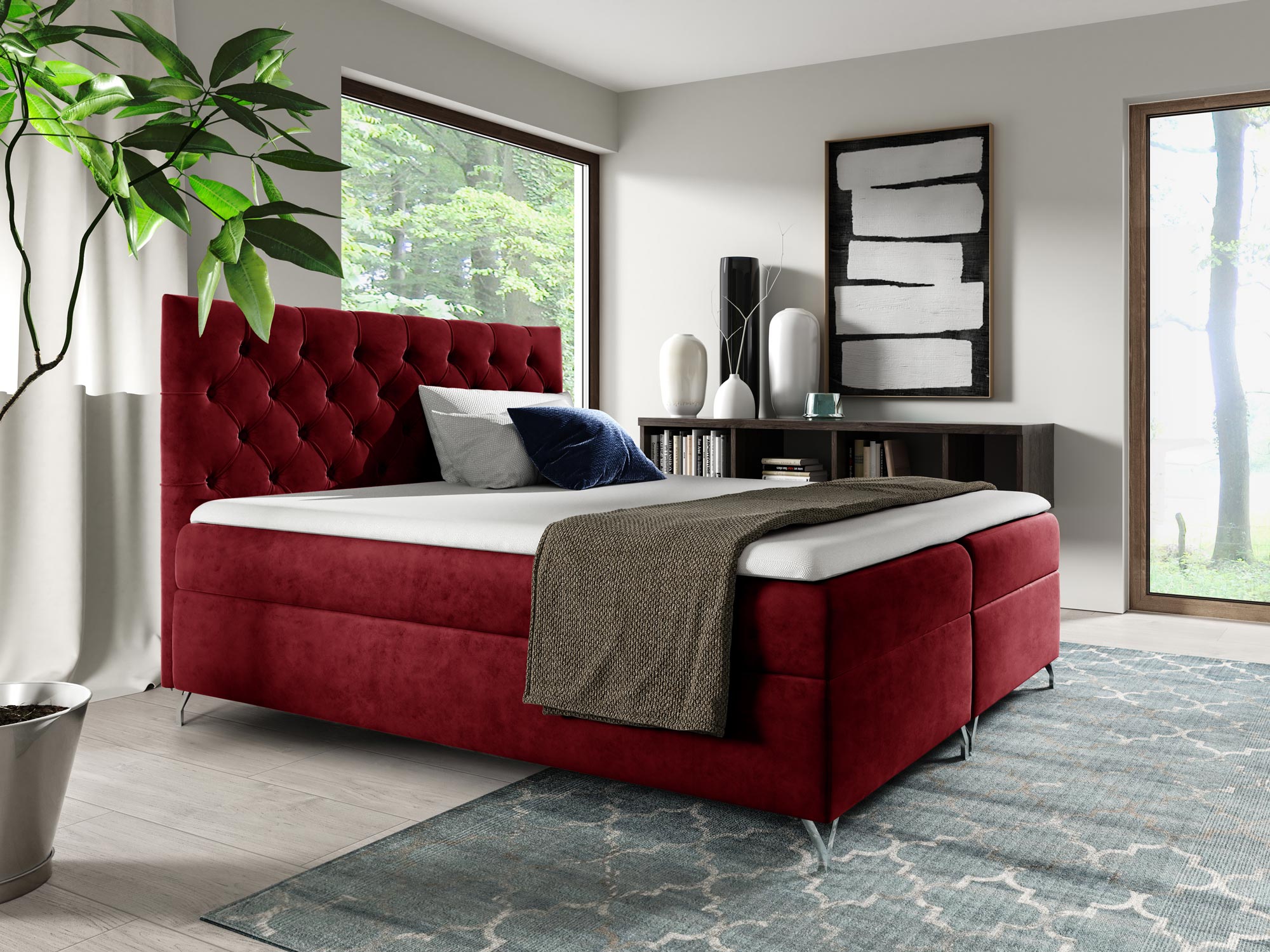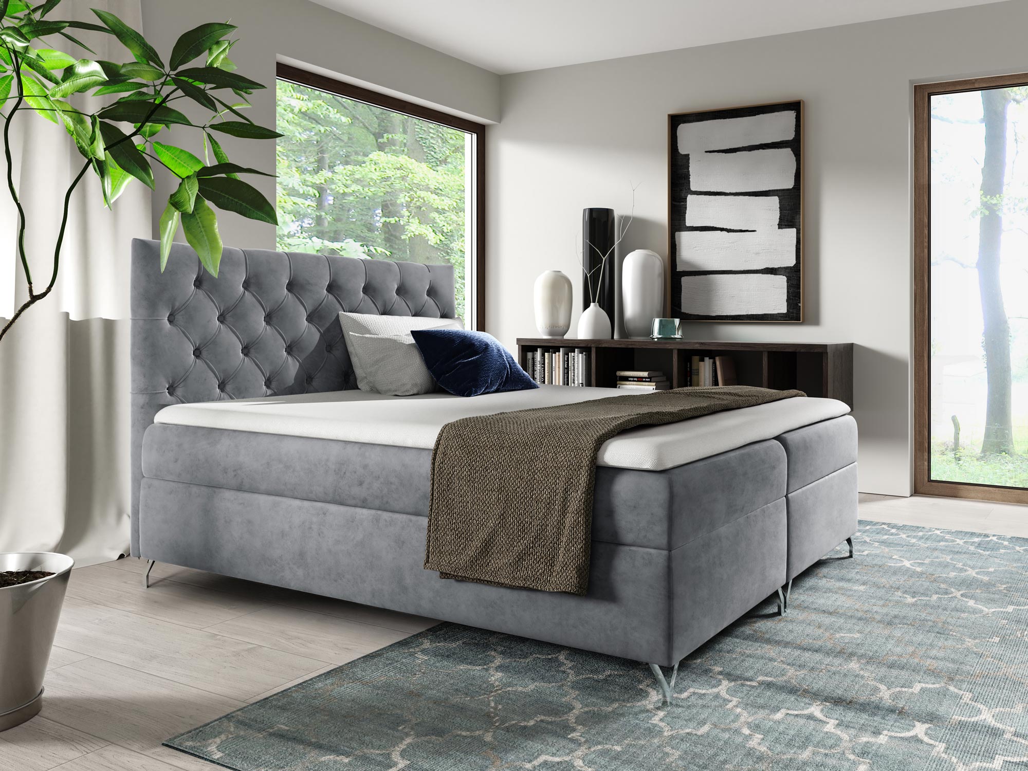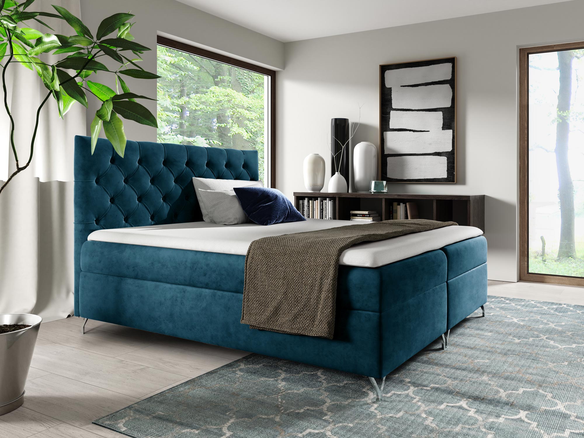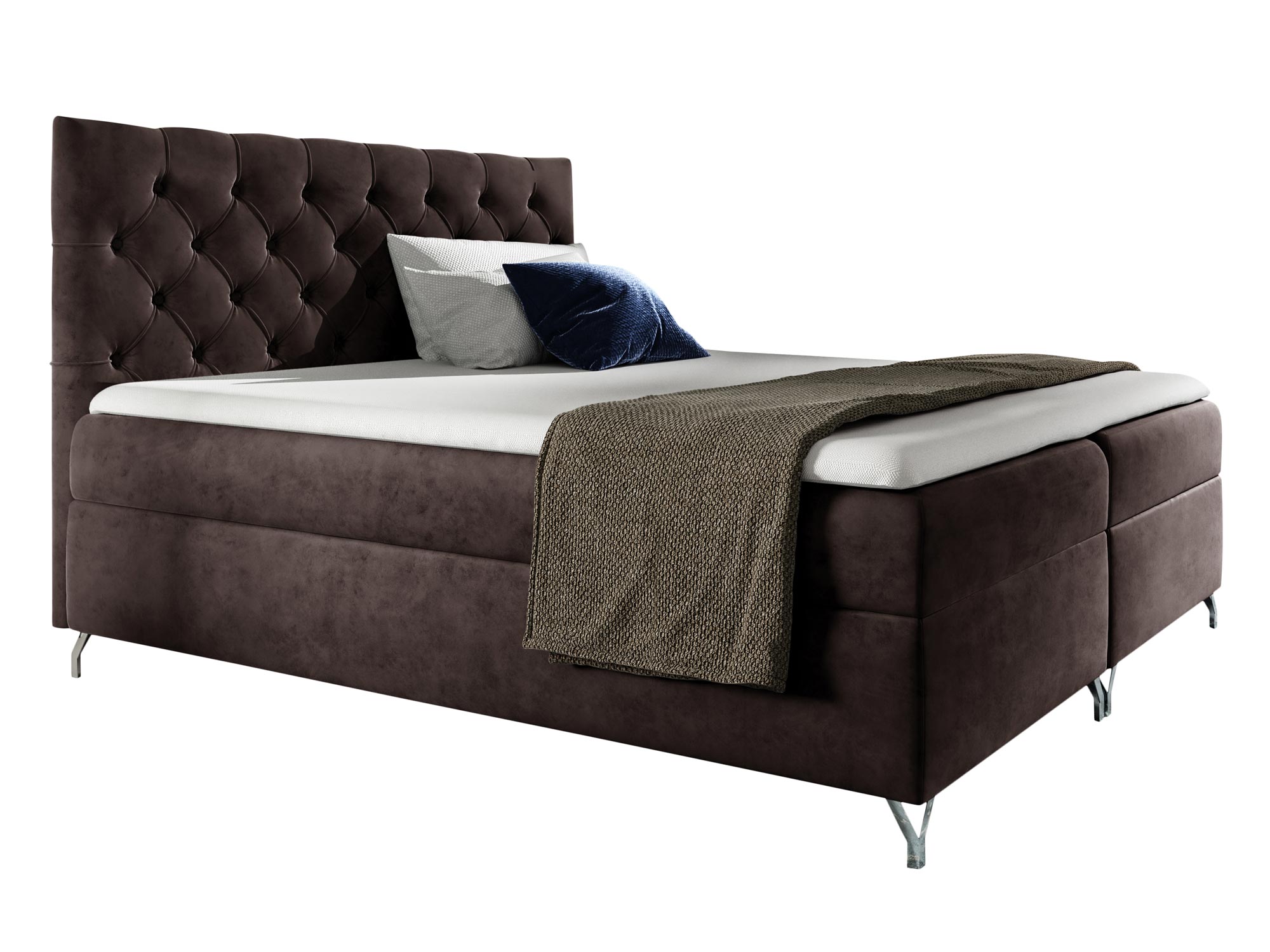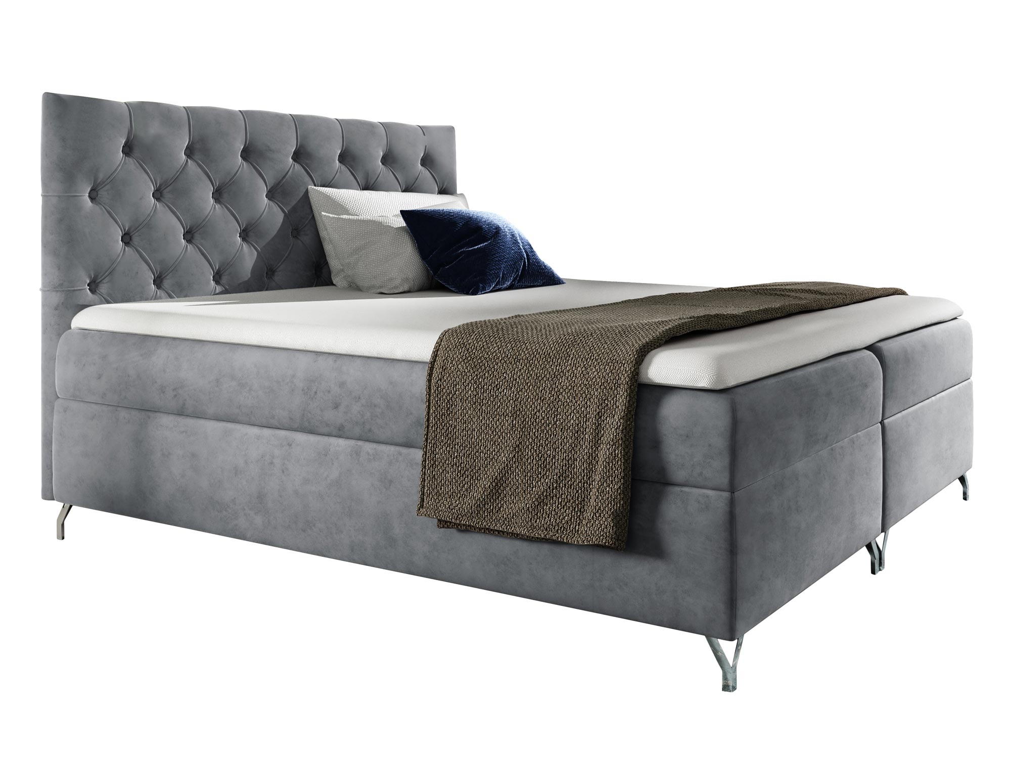 Prezentowane łóżko kontynentalne OSANE to model na który powinny zwrócić uwagę osoby urządzające sypialnię w nowoczesnym stylu, w szczególności tych w stylu glamour czy art deco. Gustowne pikowania to element niewychodzący z mody, a więc łóżko z pewnością posłuży wiele lat nie tracąc na aktualności. Co więcej, dzięki szerokiej gamie kolorystycznej z łatwością dopasujesz odpowiedni odcień do swojego wnętrza. Dodatkowo, łóżko jest osadzone na metalowych nóżkach, które dodają meblu lekkości oraz elegancji. Niewątpliwie dwa duże pojemniki na pościel to duża zaleta, gdyż nie tylko ułatwiają organizację, ale również oszczędzają miejsce w przestrzeni, zatem będzie to doskonały wybór dla sypialni o małej powierzchni.