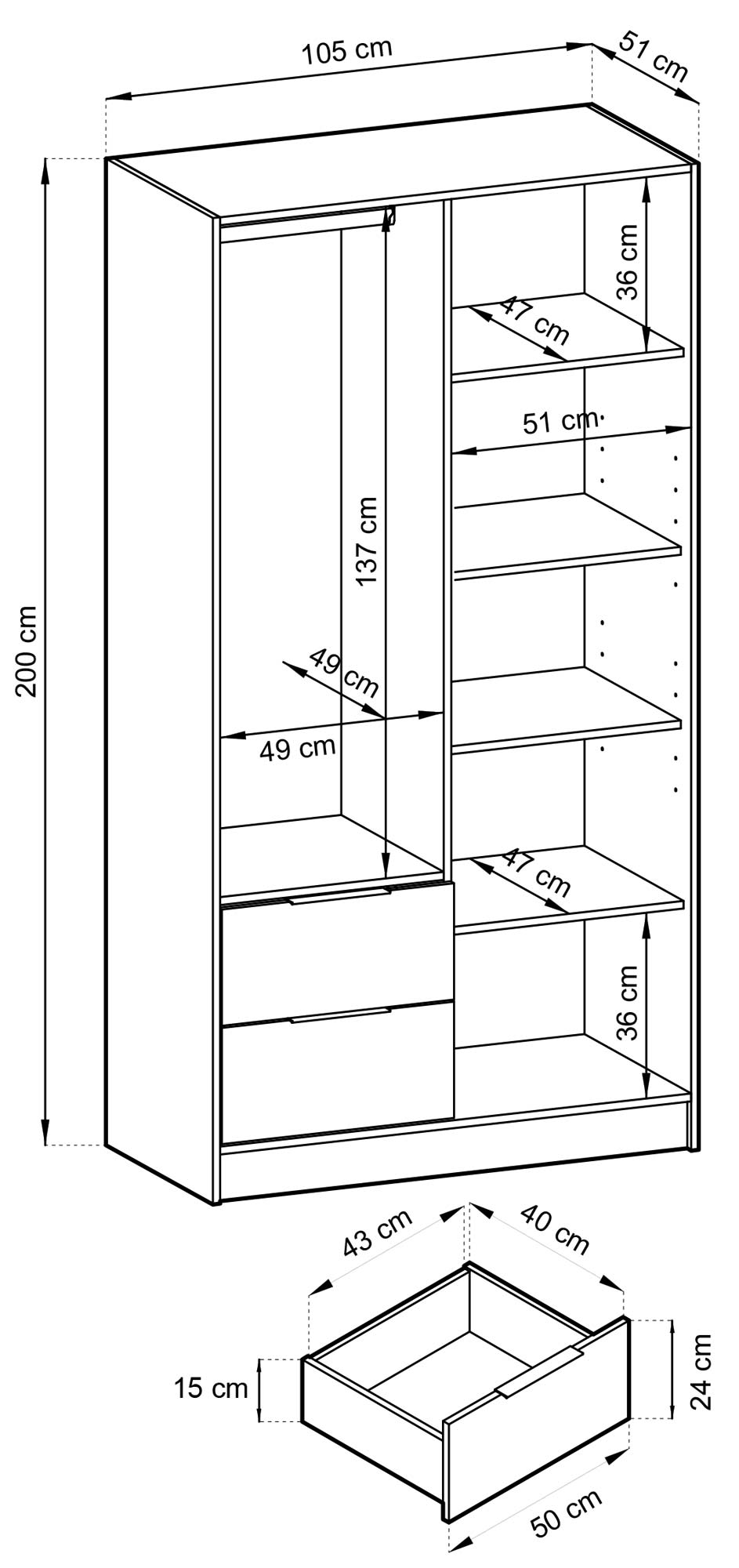 Szerokość: 105 cm / Wysokość: 200 cm / Głębokość: 51 cm