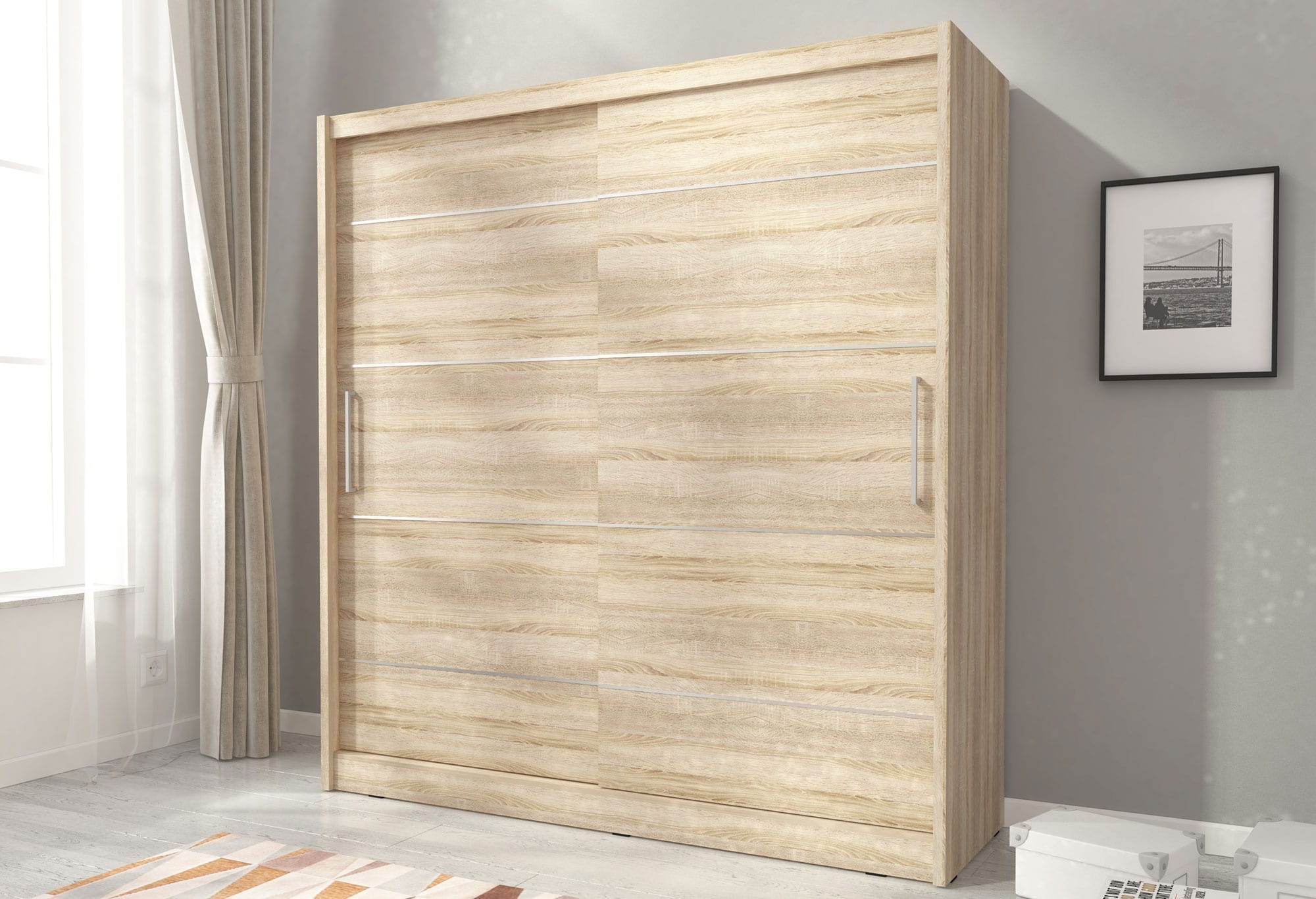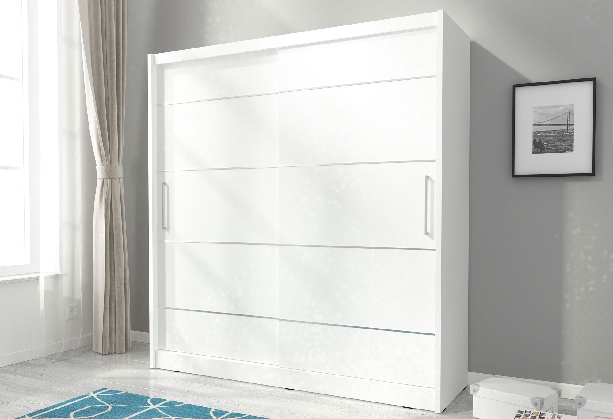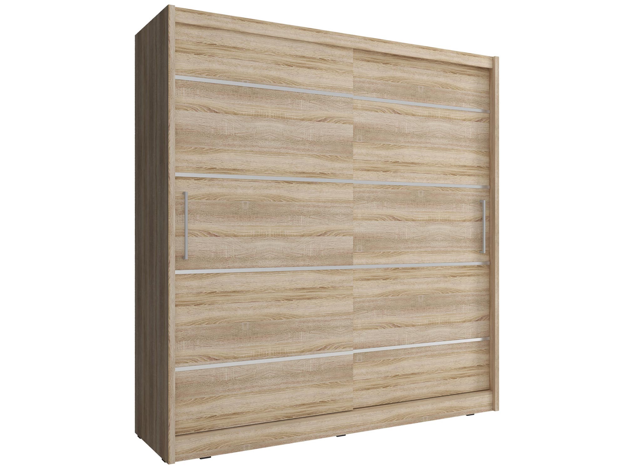 Nowoczesna szafa na ubrania ALVERA ALU 200cm z drzwiami przesuwnymi jest doskonałym rozwiązaniem zarówno do mniejszych jak i większych pomieszczeń. Z pewnością jej pojemne i bardzo funkcjonalne wnętrze zapewnia w pełni wystarczającą ilość miejsca potrzebnego do przechowywania ubrań. Nowoczesna szafa do sypialni ALVERA ze wstawkami aluminiowymi będzie idealnie pasować do każdego wnętrza. Co więcej jest ona wspaniałym pomysłem na organizację przestrzeni zarówno w sypialni, przedpokoju czy garderobie.