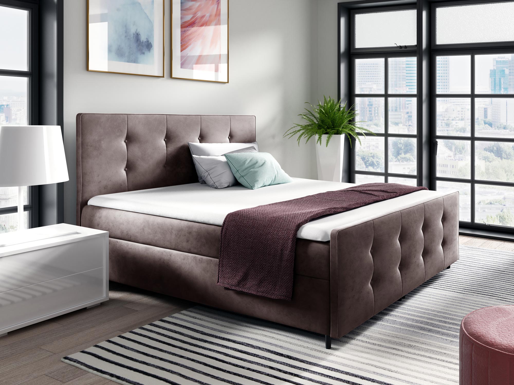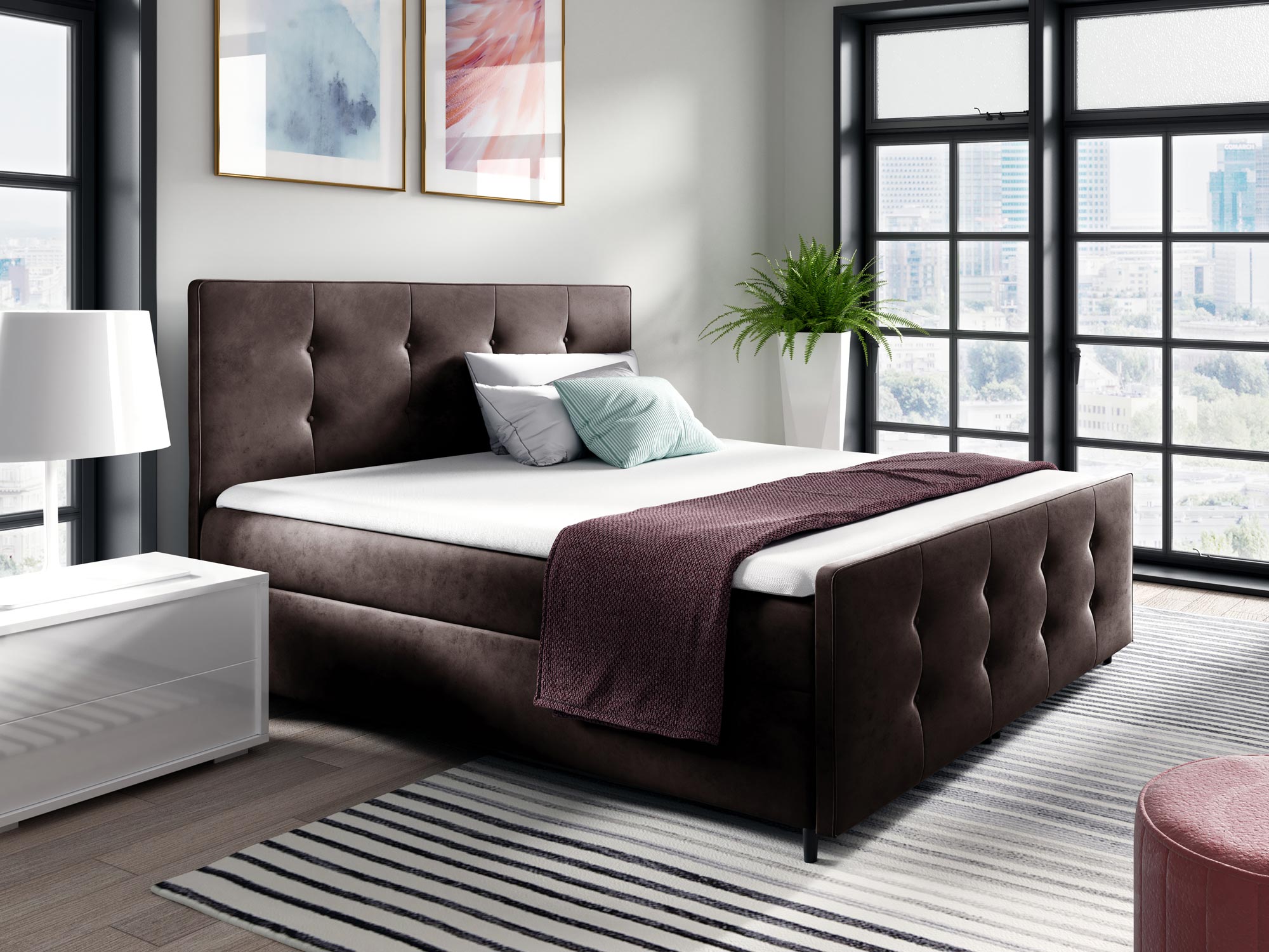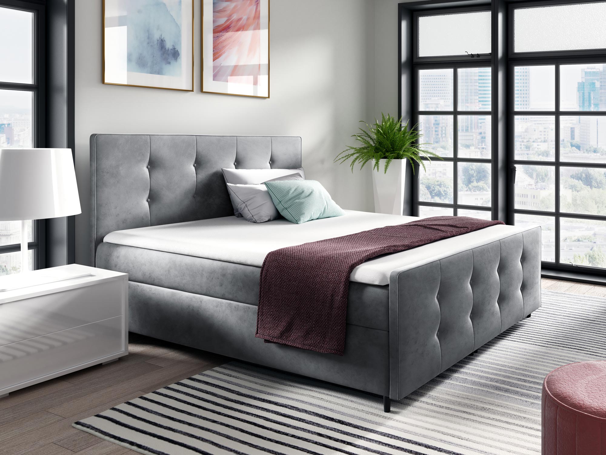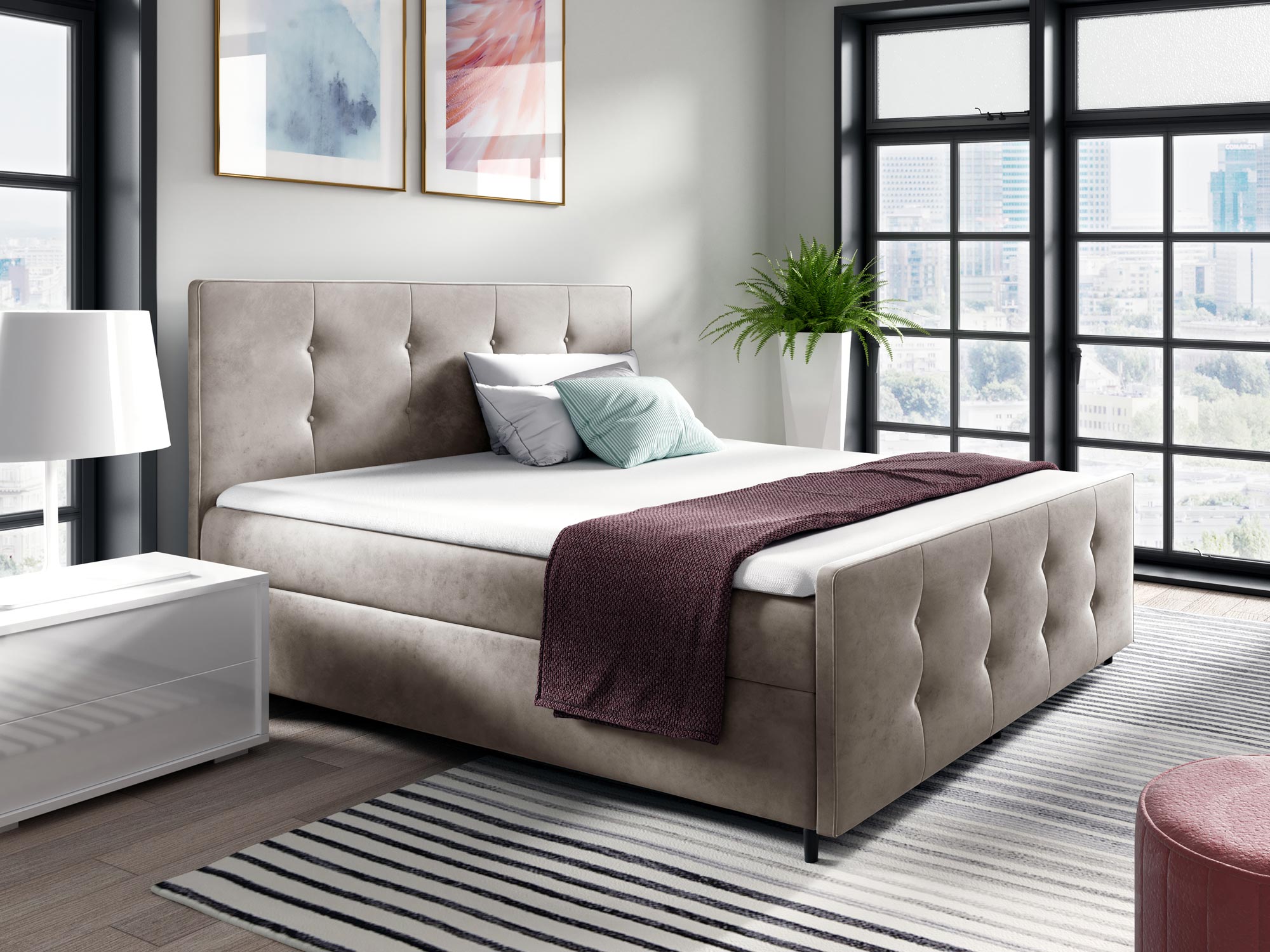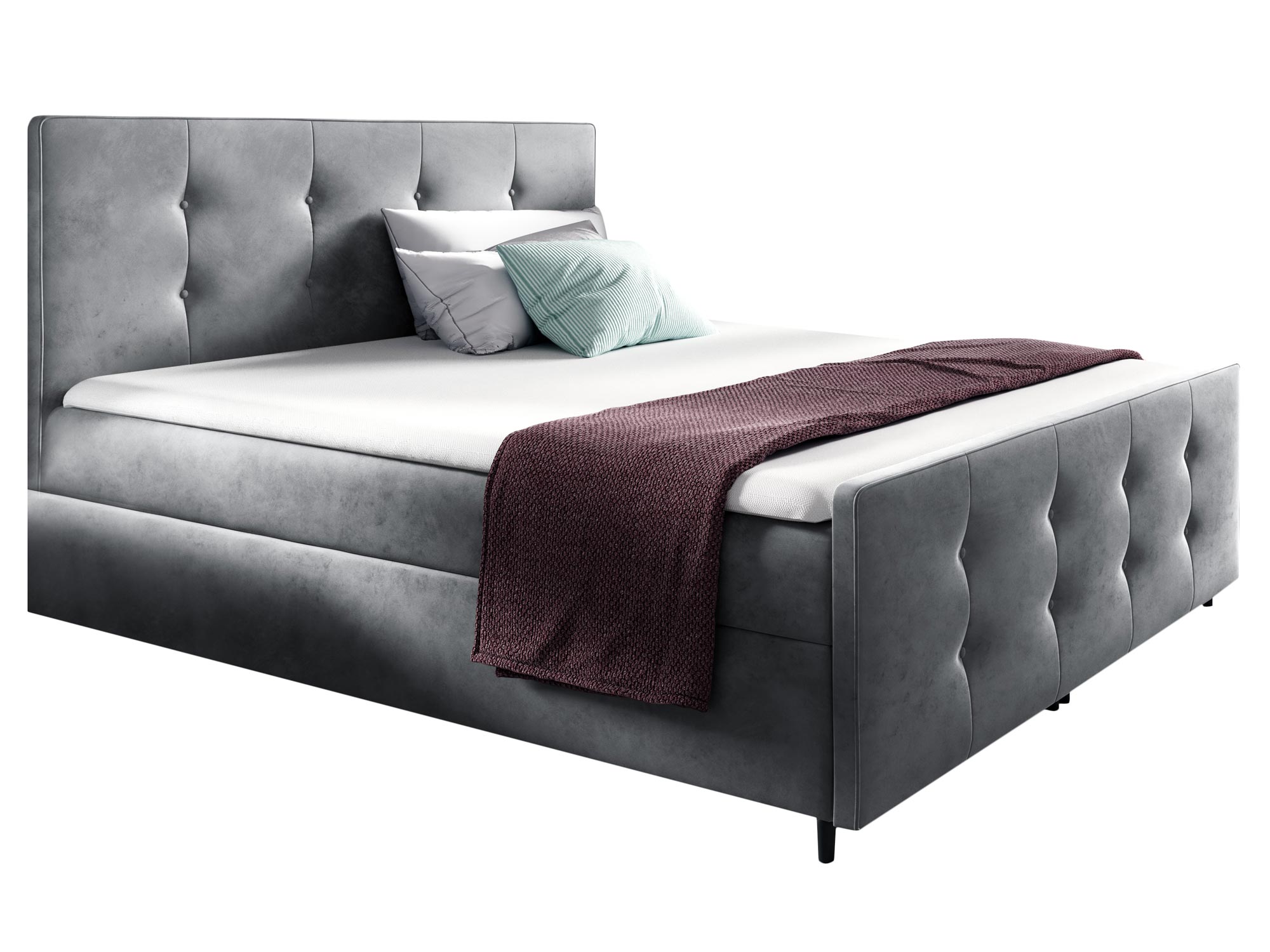 Co najważniejsze łóżko kontynentalne YONI to model wyróżniający się elegancką prezencją, ale również praktycznością i ponadczasowością. Ponadto, pikowane przeszycia na wezgłowiu to klasyczny wzór, który nigdy nie wychodzi z mody, co w połączeniu z wysokiej jakości materiałami zastosowanymi do produkcji mebla gwarantuje długą żywotność. Co więcej, łóżko posiada dwa pojemniki do przechowywania pościeli, poduszek czy koców co znacznie ułatwia organizację sypialni oraz oszczędza przestrzeń, zatem będzie to doskonały wybór dla małych pokoi. Dodatkowo materac sprężynowy dba o regenerację podczas snu, a topper piankowy zapewnia najwyższy komfort snu.