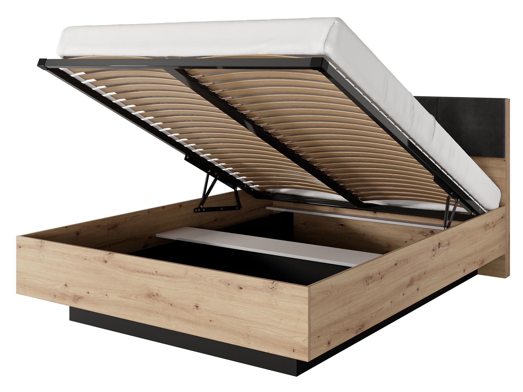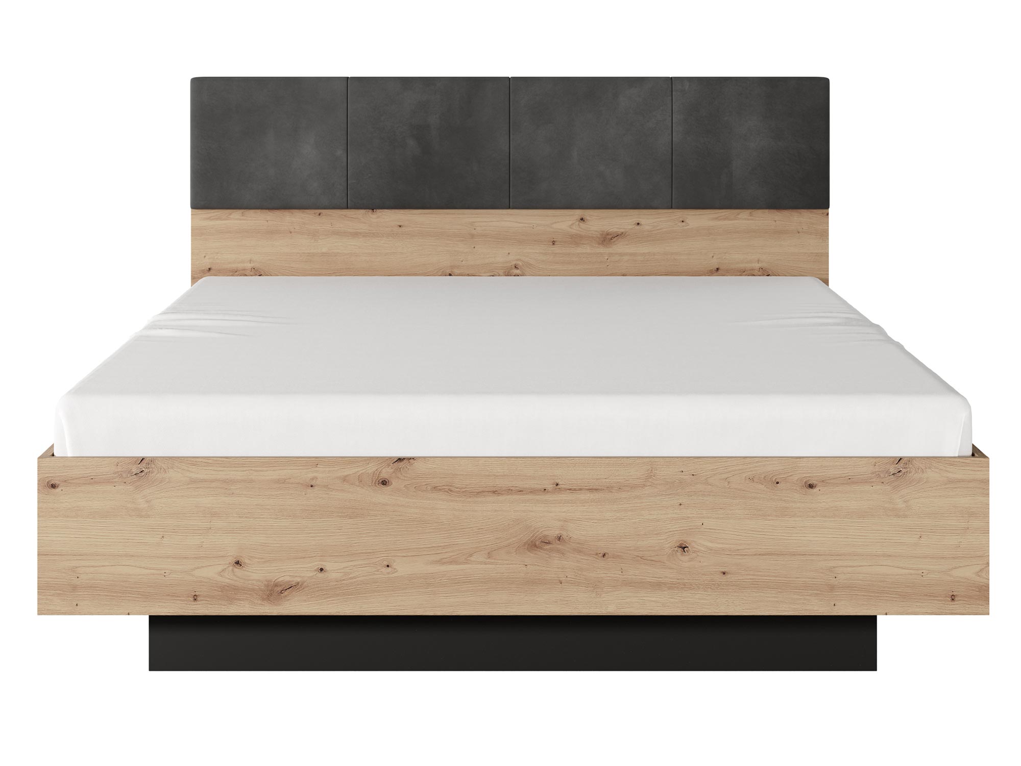 Nowoczesne łóżko z drewnianym zagłówkiem i szarym tapicerowanym panelem
