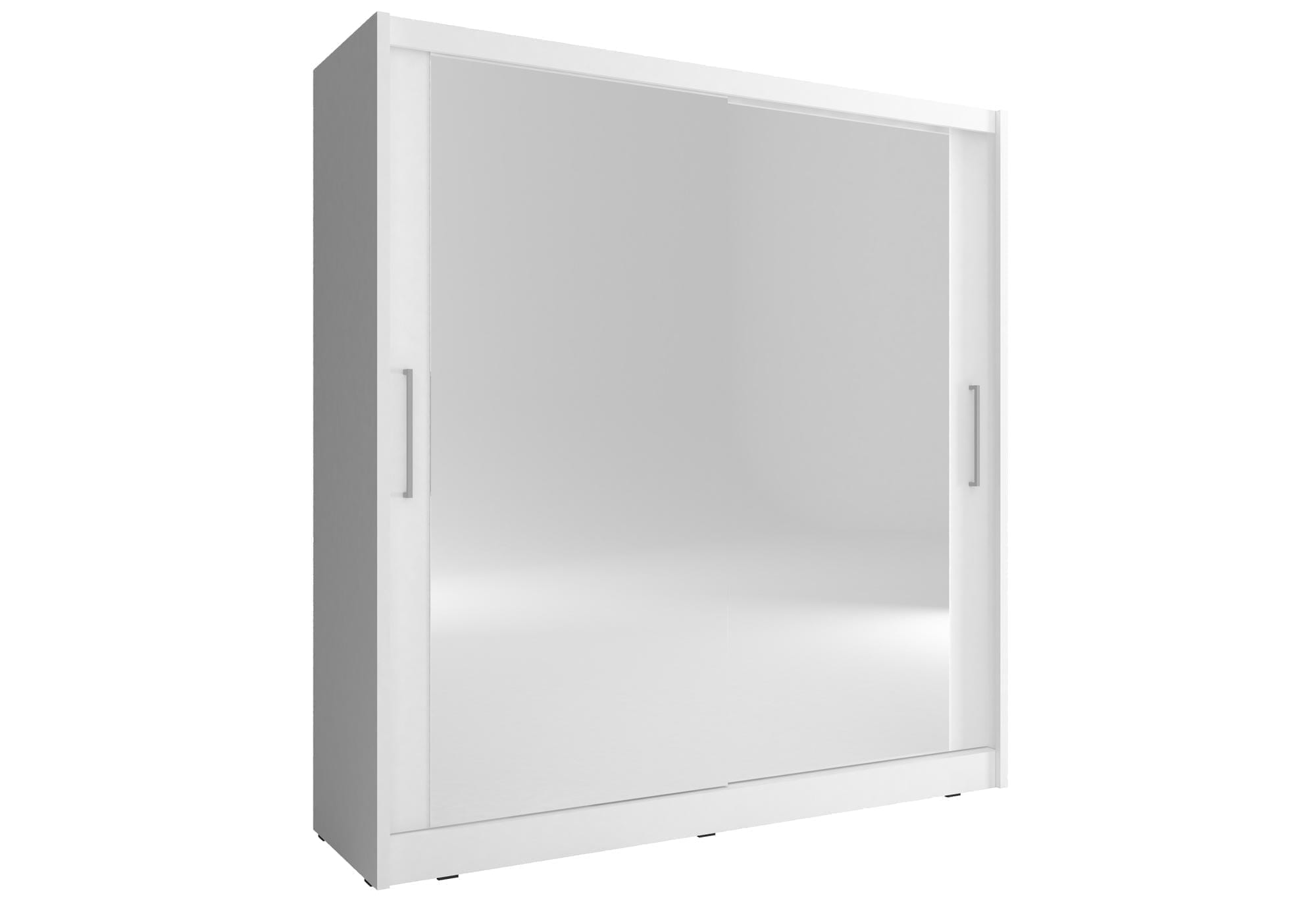 ALVERA IV to duża i pojemna szafa przesuwna. Wewnątrz podzielona na dwie części gdzie jedna zagospodarowana jest na ubrania wiszące, natomiast druga strona składa się z pojemnych półek. Na obu drzwiach umieszczone jest lustro. Pojemna szafa ALVERA VI 200cm wykonana została z wysokiej jakości płyty laminowanej, a drzwi zamontowane zostały na profesjonalnym systemie przesuwnym.
