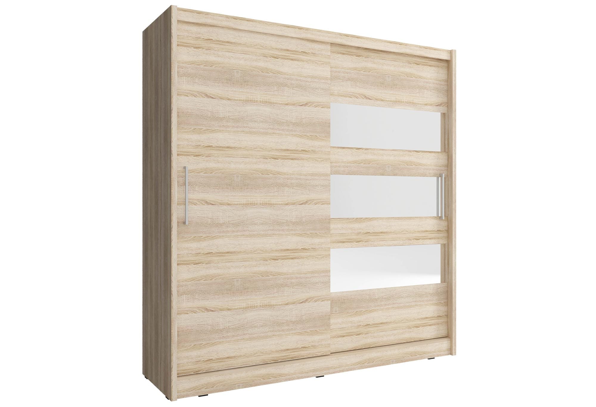W jednym skrzydle drzwi zostały na froncie zamontowane trzy podłużne lustra. Drzwi przesuwne posiadają system jezdny na aluminiowych prowadnicach. Pojemna szafa dwudrzwiowa ALVERA III 200cm wykonana z najwyższej jakości płyty laminowanej, wyróżnia się wysoką odpornością na zarysowania oraz wszelkiego rodzaju zabrudzeniami. Korpus oklejono trwałym obrzeżem ABS. Zobacz trwałe i solidne modele szaf drewnianych z naszej kolekcji.