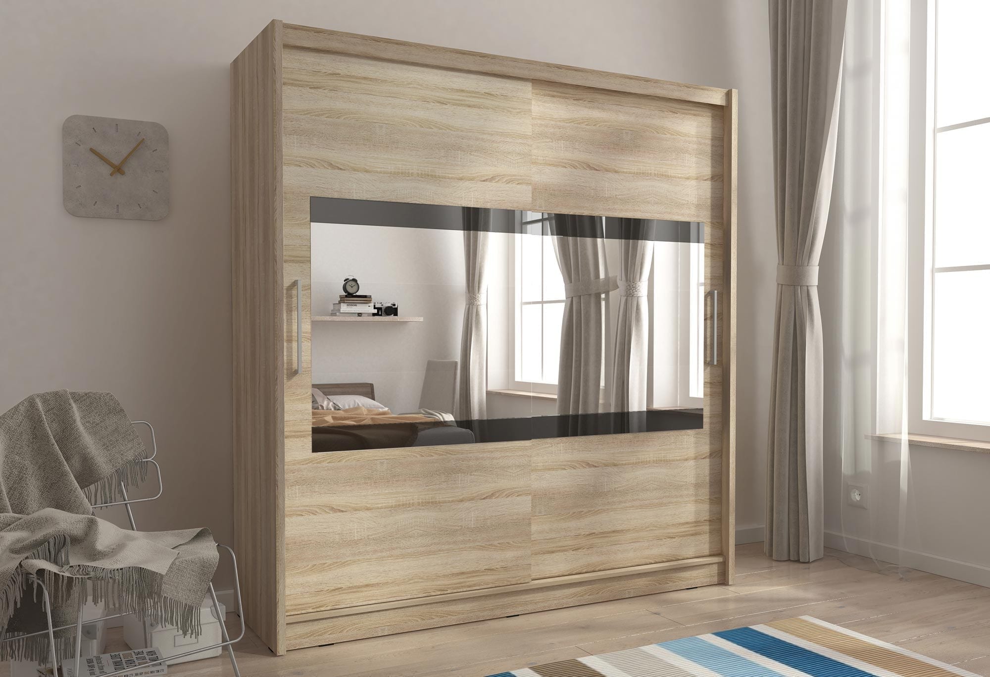 Pojemna szafa z lustrem ALVERA IV 180cm jest połączeniem niebywałej elegancji oraz niepowtarzalnej ekstrawagancji. Co więcej idealnie spełni swoją rolę jako szafa do przedpokoju, sypialni czy jako szafa garderobiana. Z pewnością nada każdemu pomieszczeniu szyku i stylu. Szafa ALVERA IV jest niezwykle pojemna oraz bardzo praktyczna. Z łatwością pozwoli ona pomieścić wszystkie niezbędne ubrania, dzięki wyposażeniu w drążek oraz wiele półek. Co więcej model ten pozwoli zachować upragniony porządek w szafie i zorganizować przestrzeń. Z pewnością szafa ta oferowana jest w nowoczesnych oraz naturalnych kolorach, co sprawia że można łatwo dopasować ją do każdego wnętrza. Oferujemy również inne modele szaf do sypialni – sprawdź!