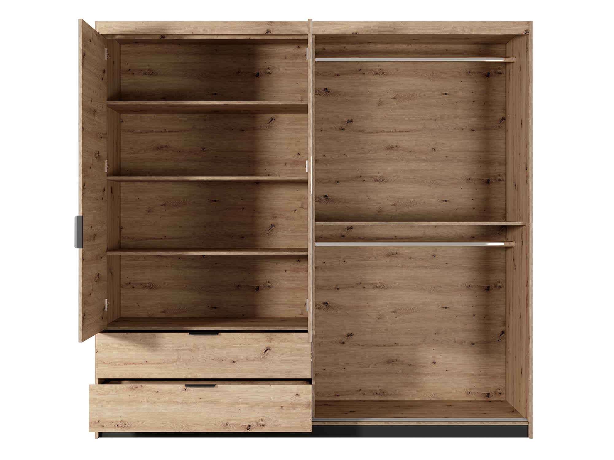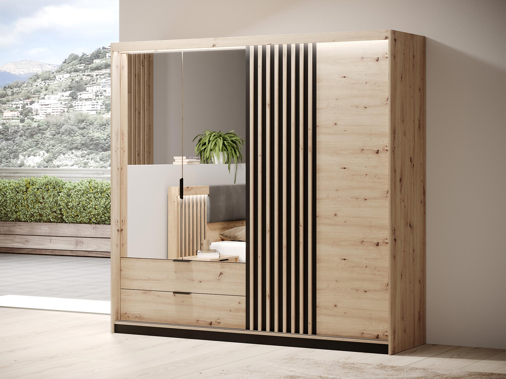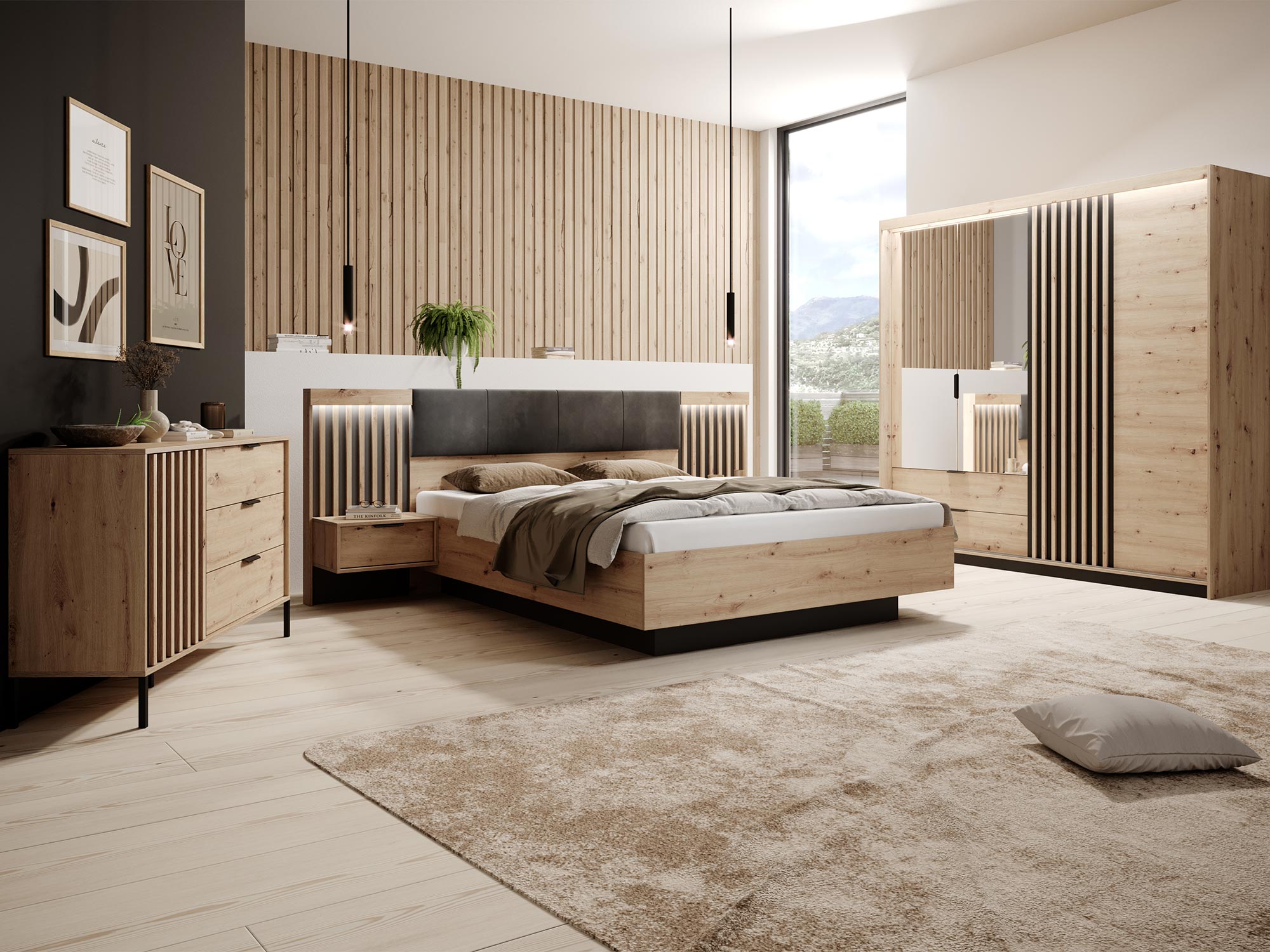 Szafa 220 cm REST to nie tylko przechowywanie, ale także wyrazisty element dekoracyjny Twojej sypialni. Łącząc w sobie ciepłe barwy dębu artisan z głębią antracytu oraz nowoczesne rozwiązania takie jak oświetlenie LED, ta szafa staje się sercem sypialni, w której każdy element współgra, tworząc przytulne i stylowe wnętrze.