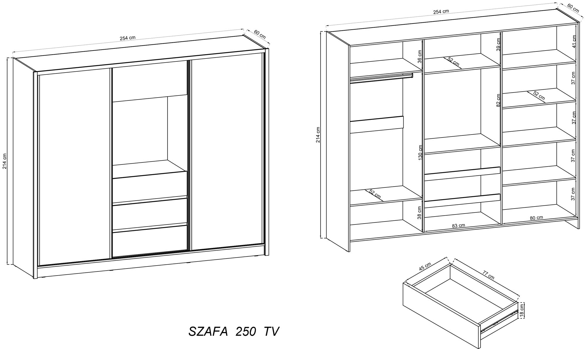 Szafa MYTV z szerokością 250 cm zapewnia obszerną przestrzeń do przechowywania, umożliwiając łatwe zorganizowanie garderoby, akcesoriów czy pościeli. Wewnątrz znajdują się praktyczne rozwiązania, takie jak regulowane półki i szuflady, które pozwalają na optymalne wykorzystanie dostępnej przestrzeni.