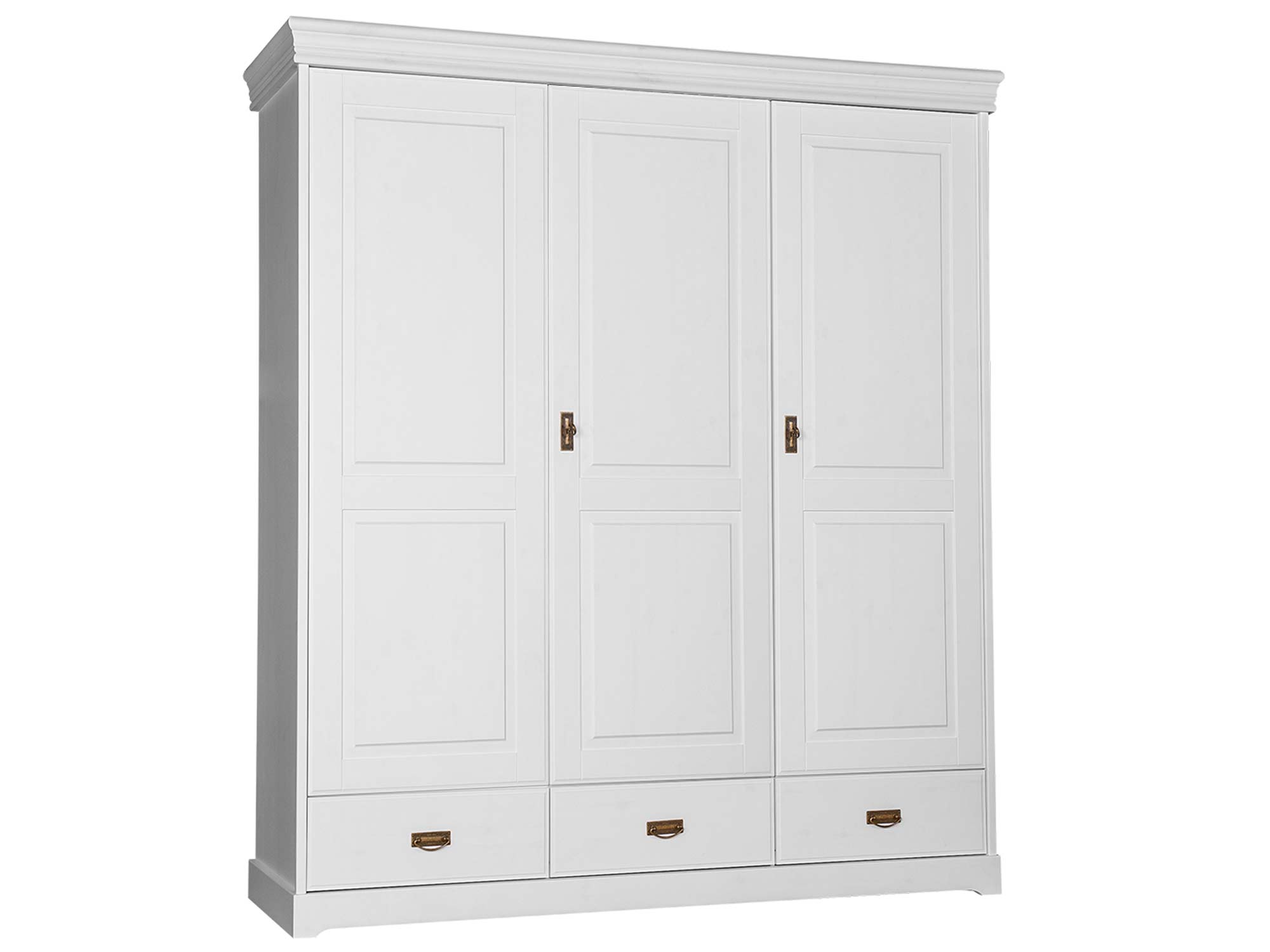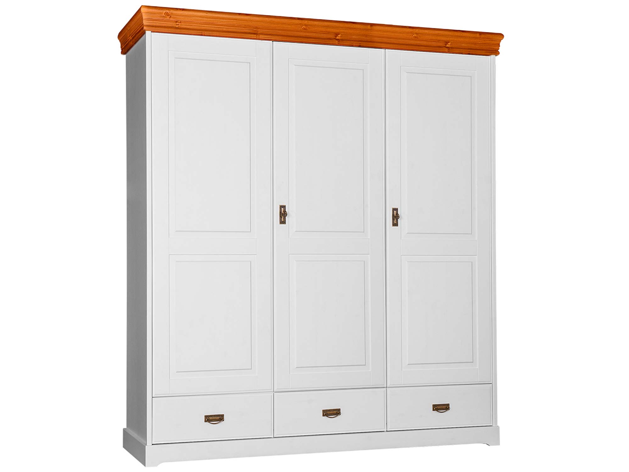 Przede wszystkim, prezentowana szafa trzydrzwiowa ANADI składa się z drążka na ubrania w lewej i środkowej części, gdzie dodatkowo na samej górze znajduje się duża półka, przykładowo na rzeczy mało używane. Co więcej, prawa strona zawiera trzy głębokie półki, które dzięki regulacji również mogą być dopasowane do własnych potrzeb. Dodatkowo trzy szuflady na samym dole mebla najczęściej wykorzystywane są na przechowywanie bielizny, jednak mogą być wykorzystywane również do organizacji dokumentów czy innych akcesoriów. Ponadto jest to propozycja zarówno do pokoi sypialnianych jak i przedpokoju, gdzie zapewni sporo miejsca na przejrzystą organizację. Zdecydowanie to co przykuwa wzrok są niekonwencjonalne uchwyty stylizowane na stare złoto, niewątpliwie dodają meblu charakteru. Zastosowanie farby i bejcy o niepełny kryciu pozwala na dostrzeżenie naturalnych sęków występujących w drewnie oraz podkreśla jego strukturę. Ponadto subtelne frezy, ozdobny wieniec i cokół sprawiają iż szafa perfekcyjnie odnajdzie się w stylu klasycznym, prowansalskim, ale również nowoczesnym.