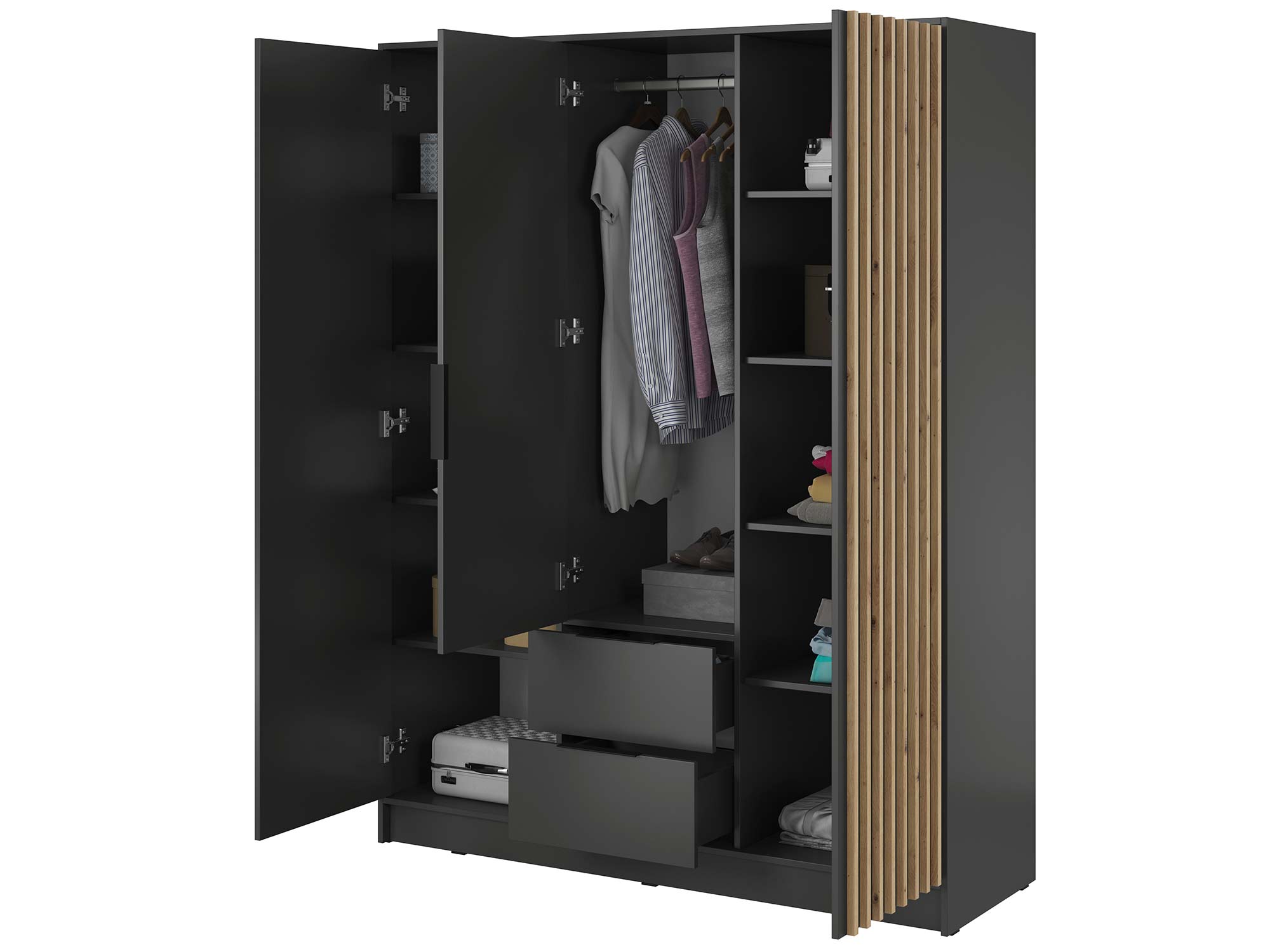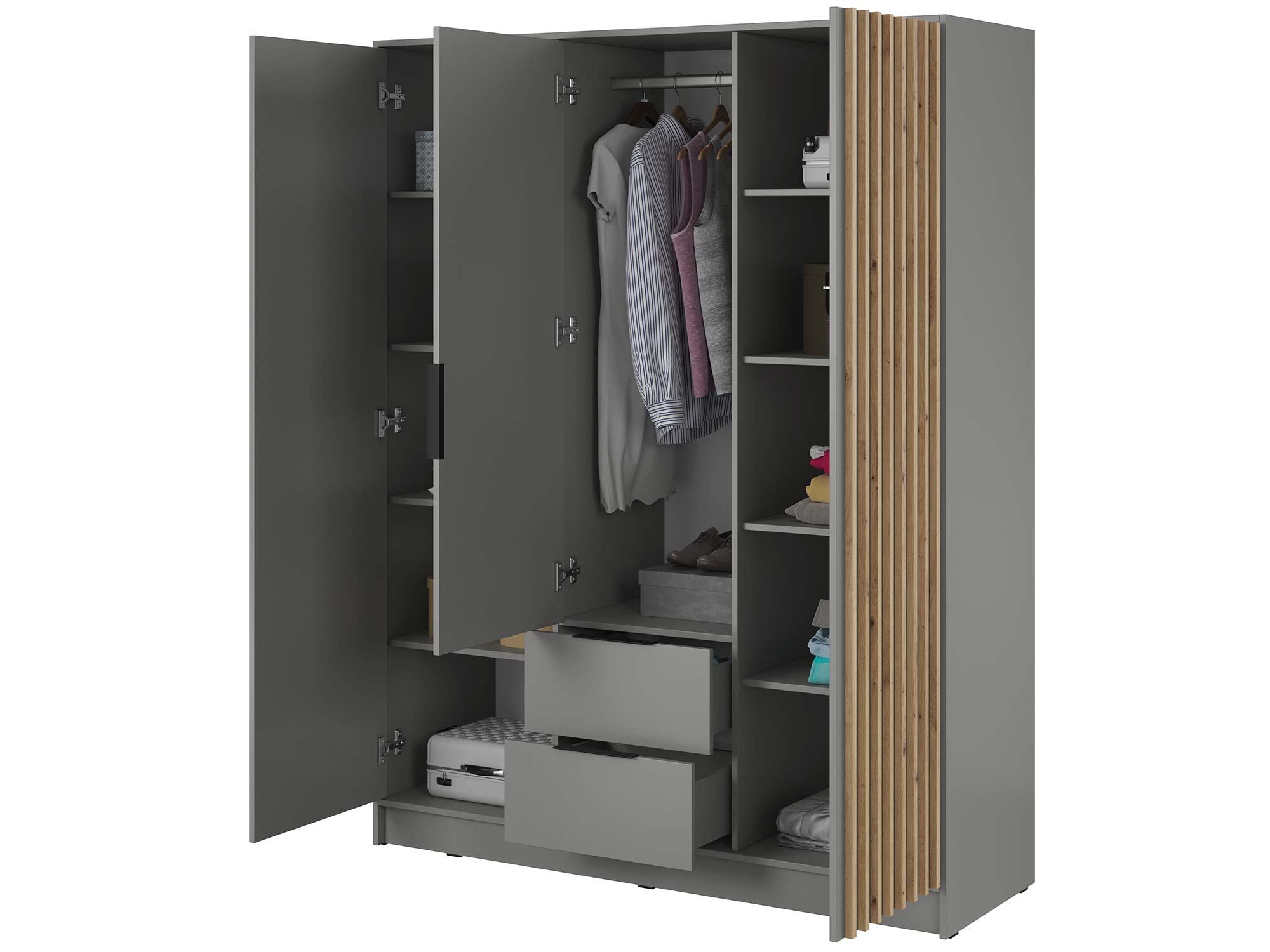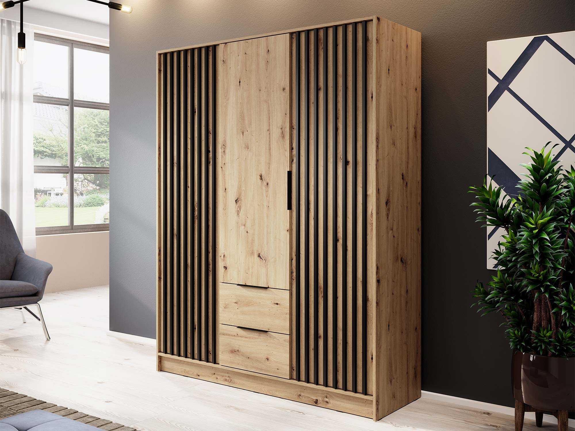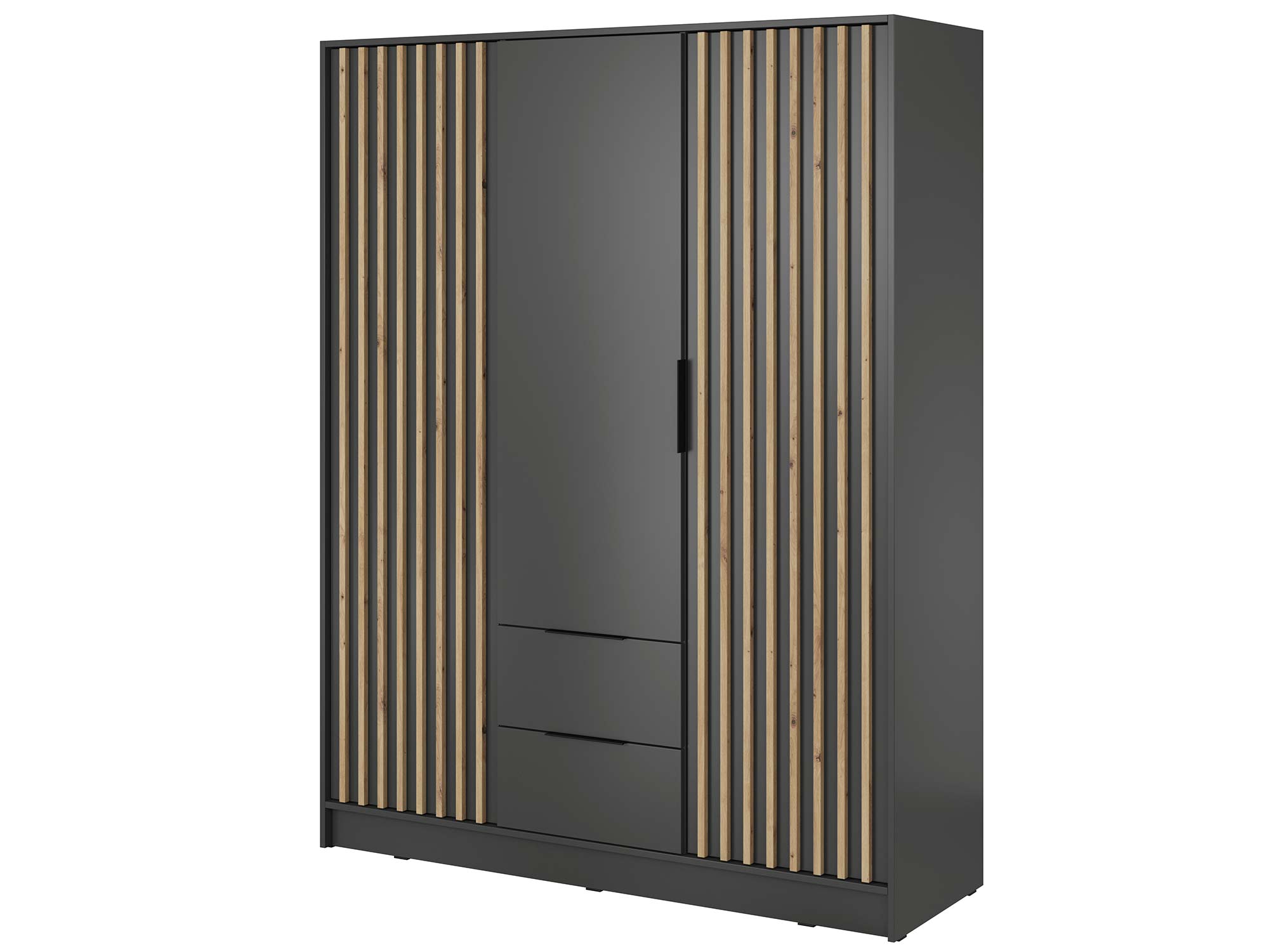 - Nowoczesny design: Proste, ale eleganckie linie szafy DELY 3D w połączeniu z unikalnymi detalami estetycznymi tworzą wyjątkowy mebel, który będzie pasował do każdego wnętrza.