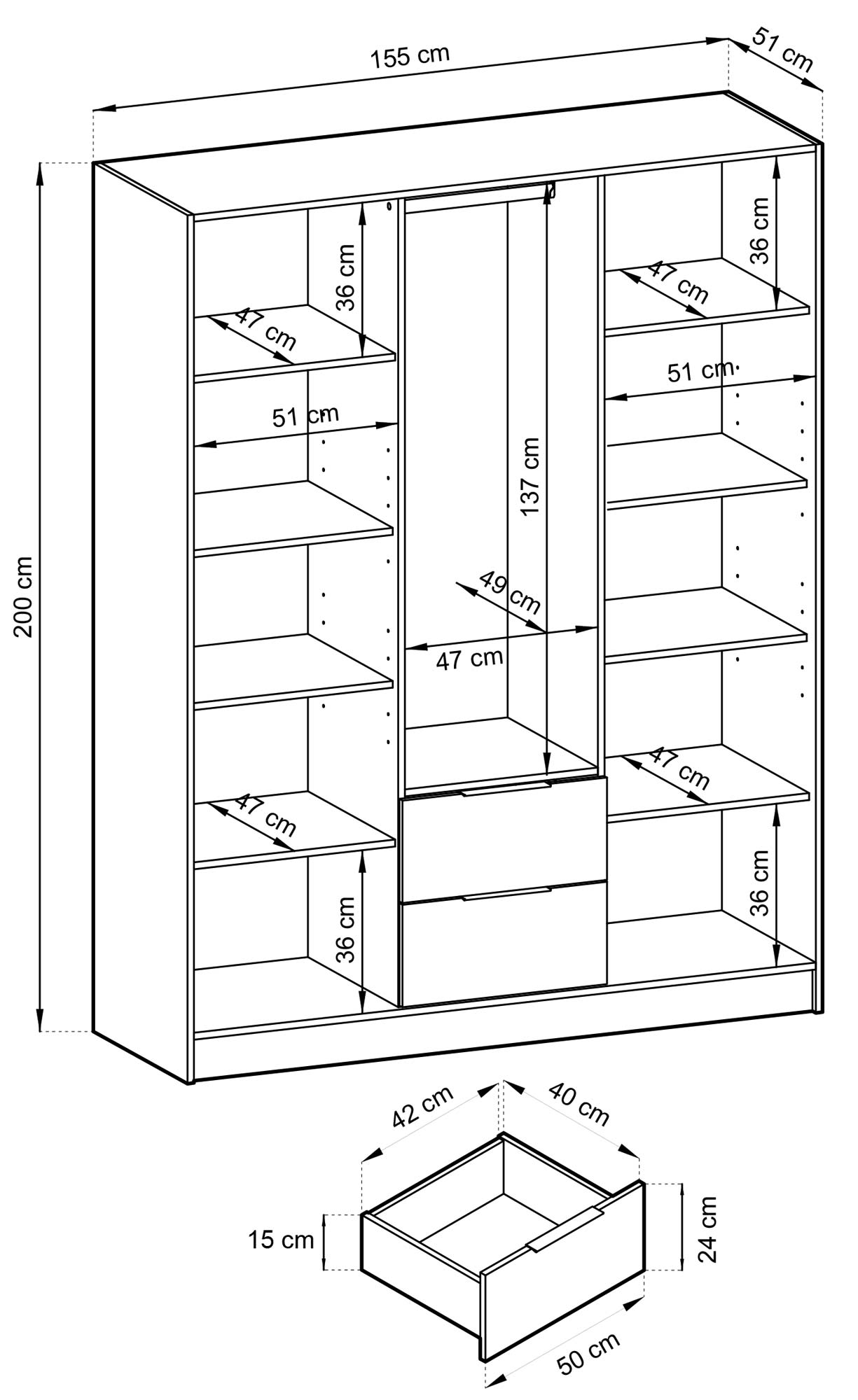 Szerokość: 155 cm / Wysokość: 200 cm / Głębokość: 51 cm