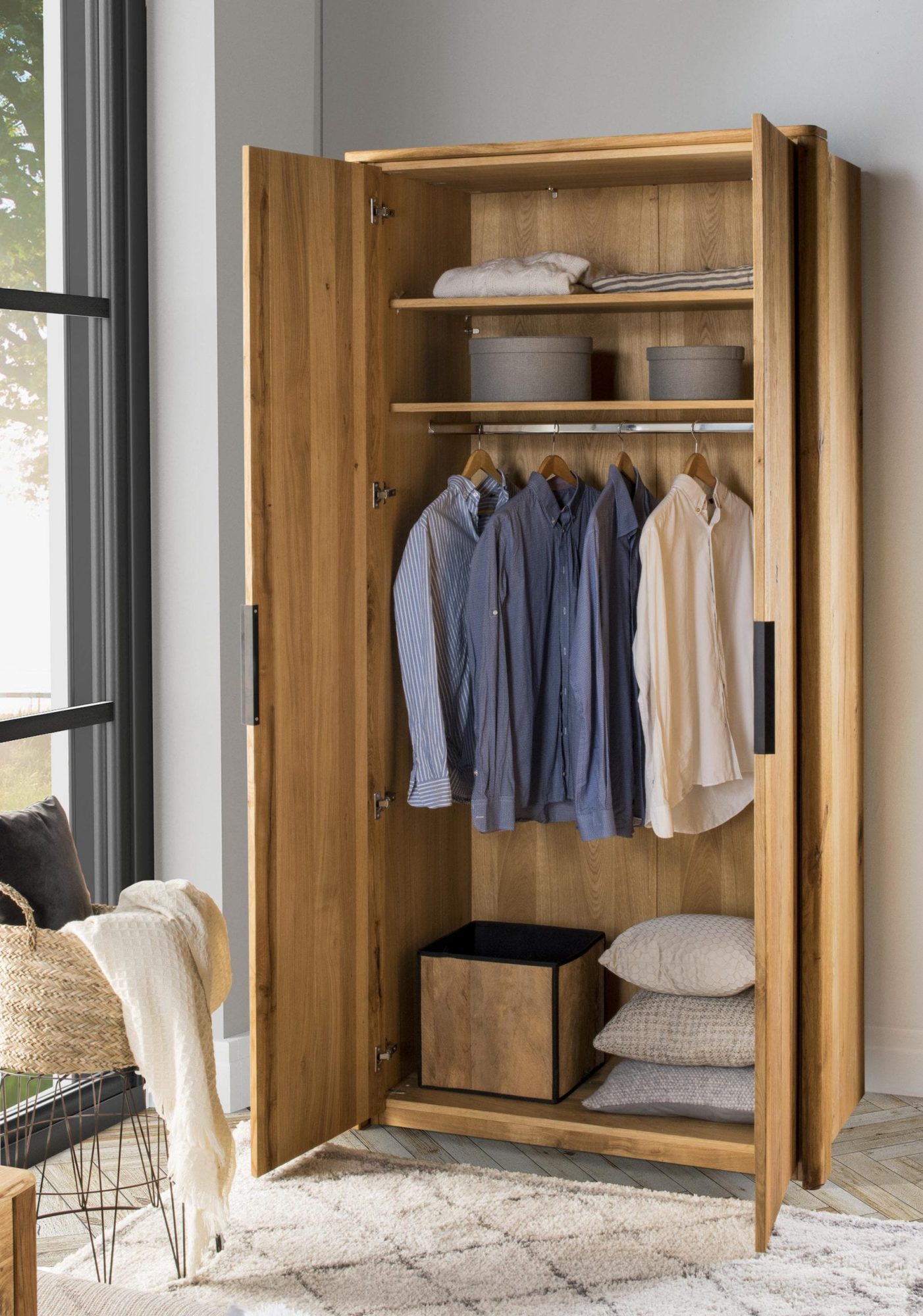 Prosta i elegancka szafa do sypialni Maseri wykonana z najwyższej jakości litego drewna dębowego z elementami fornirowanymi świetnie dostosuje się do każdej aranżacji niejednej sypialni. Ponadto stabilna forma oraz eleganckie, nowoczesne wykończenie sprawią, że szafa dwudrzwiowa drewniana szykownie upiększy niejedną aranżację. Co więcej Maseri ma funkcjonalne drzwi, za którymi mieszczą się dwie niezwykle praktyczne duże półki, a także niezmiernie przydatny drążek na wieszaki z ubraniami.