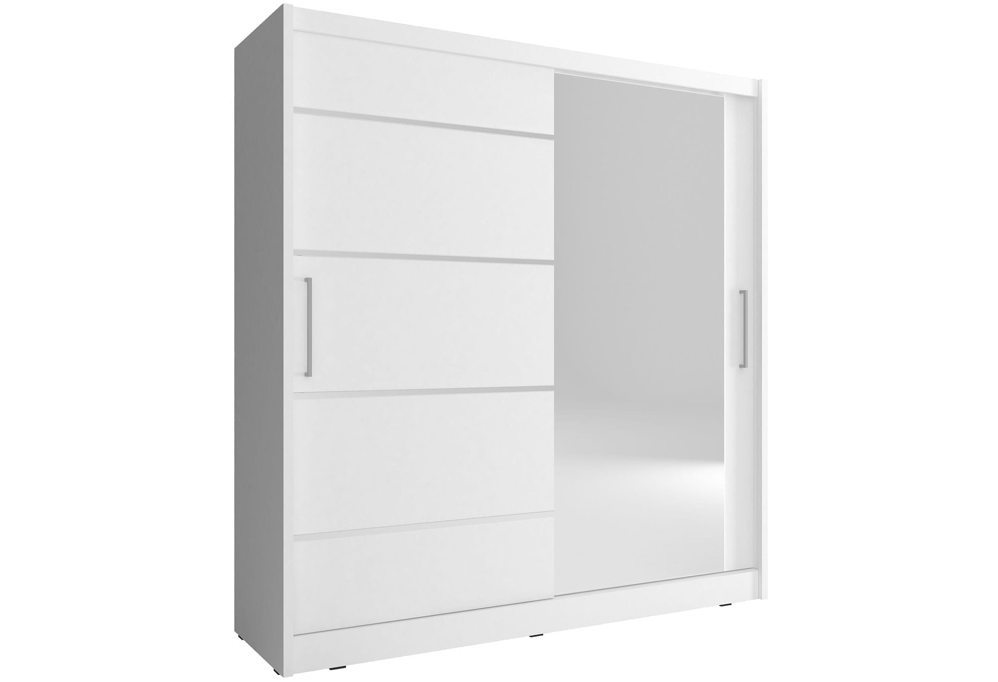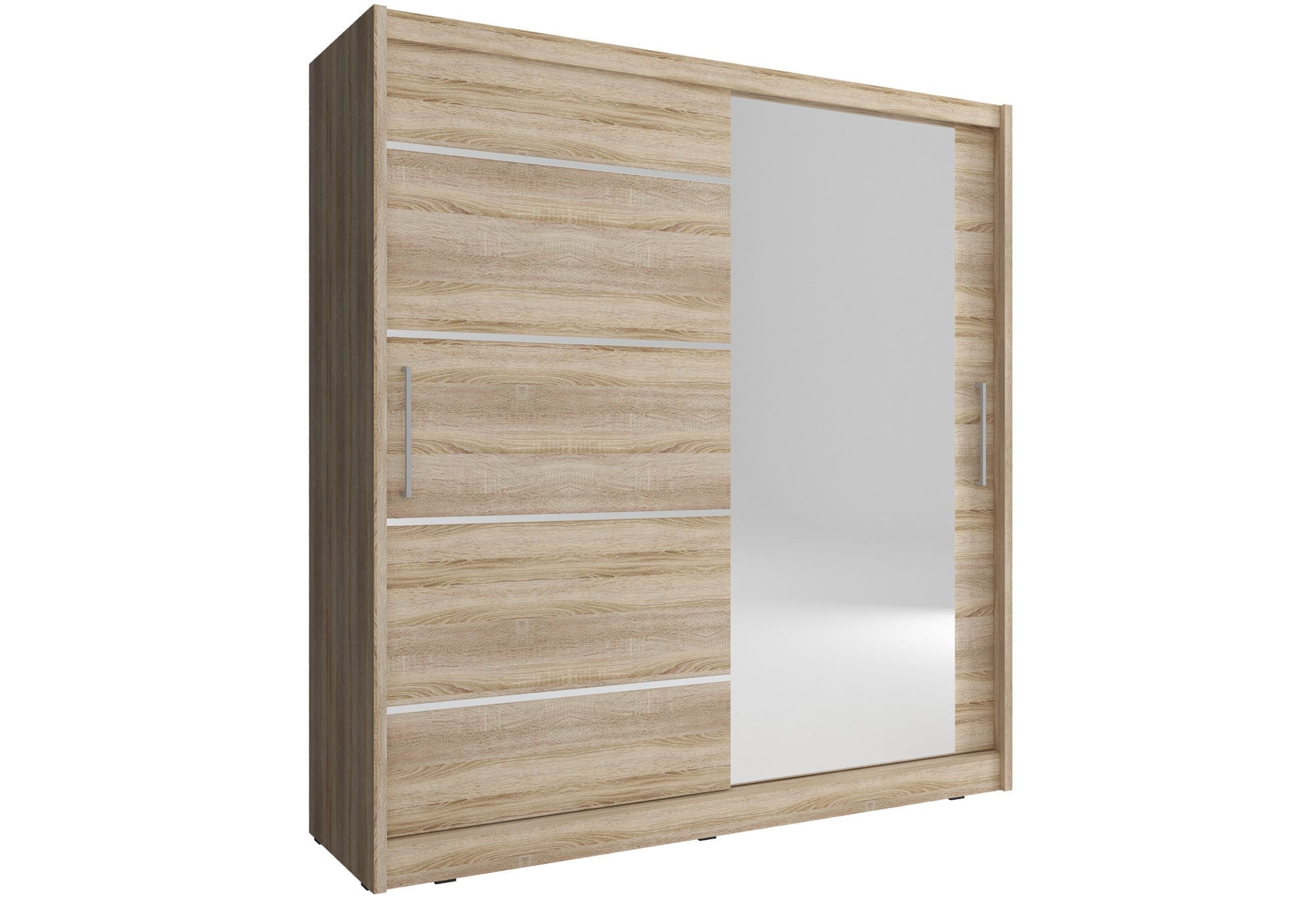 Drzwi szafy są przesuwne, na jednym z frontów znajdują się ozdobne listwy aluminiowe, dzielące front na panele, natomiast na drugim z frontów umieszczono duże lustro. W jej wnętrzu umiejscowiono półki i drążek na ubrania. Szafa na ubrania ALVERA I ALU 200cm jest dwudrzwiowa, wykonana z wysokiej jakości płyty obustronnie laminowanej. Wykończonej dodatkowo ochronnym obrzeżem ABS pozwalającym na długie użytkowanie szafy bez żadnych uszkodzeń. Zobacz również dostępne w naszej kolekcji szafy drewniane.