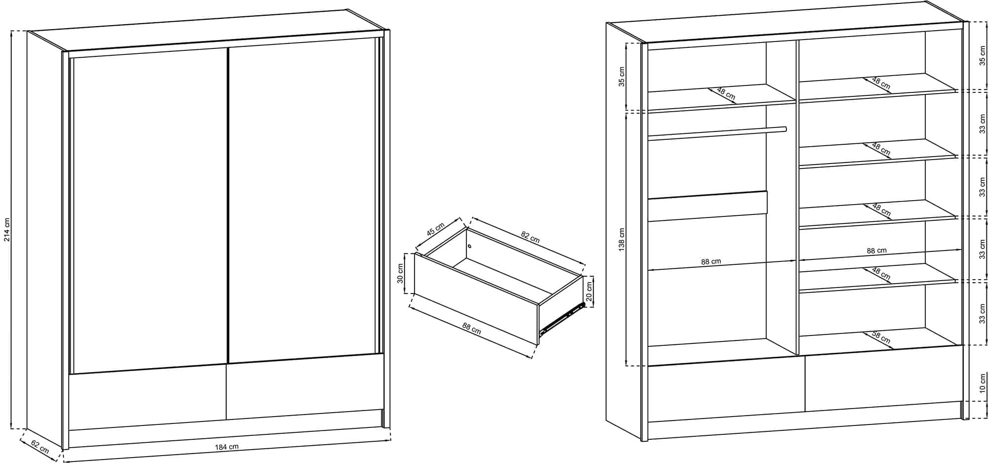 • Szerokość: 184 cm – Wysokość: 214 cm – Głębokość: 62 cm