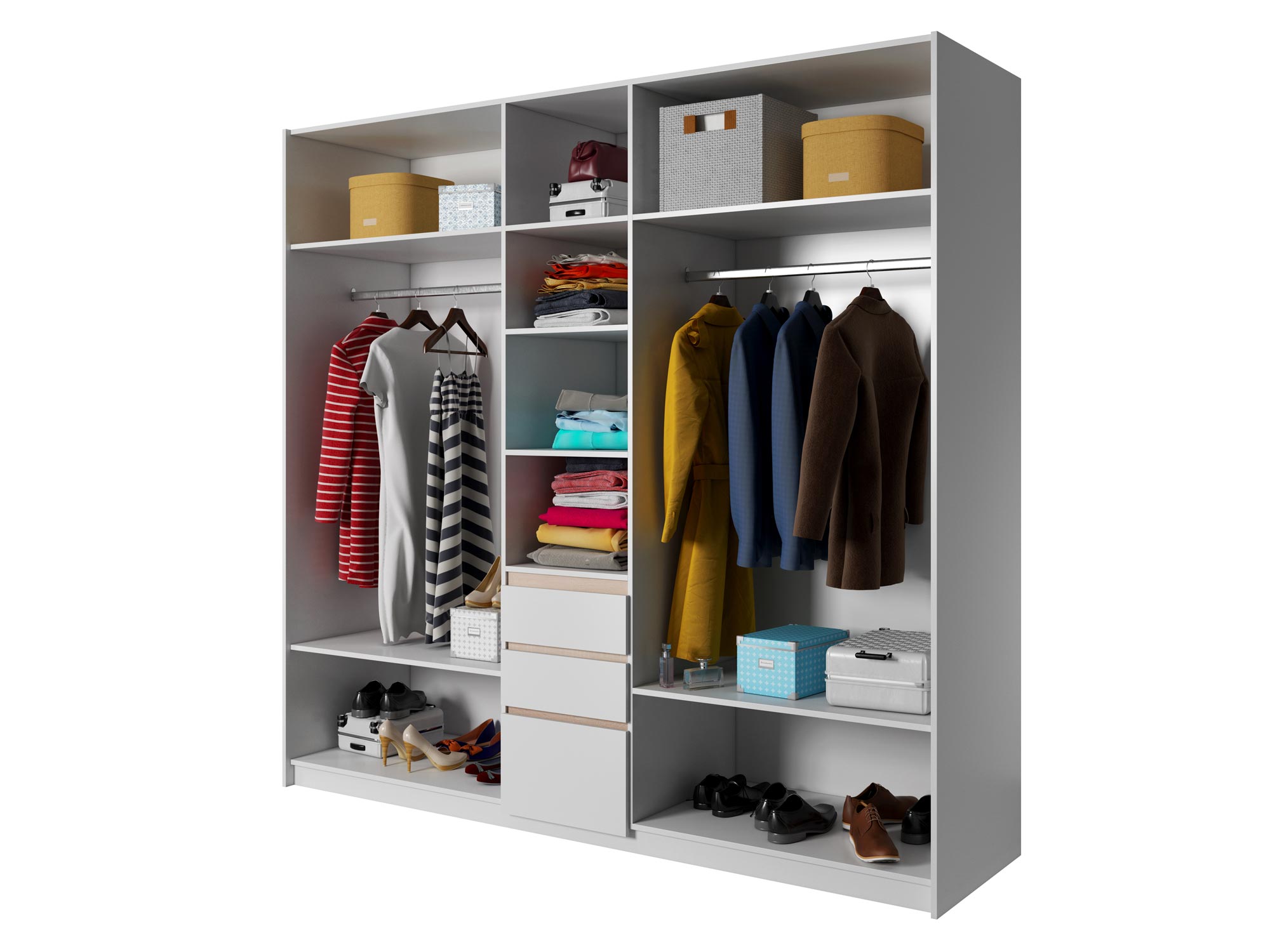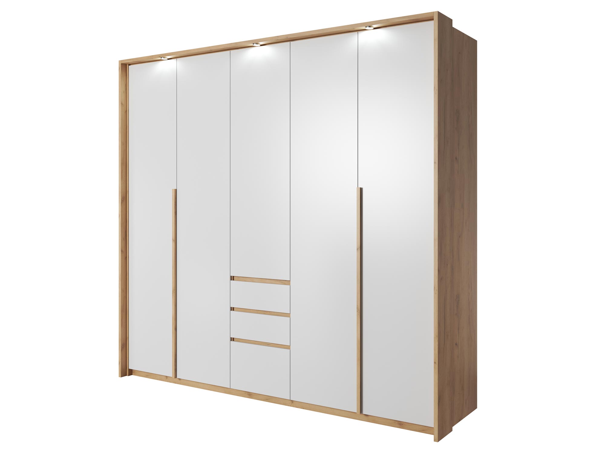 Szafa sypialniana 230 OLSEN wykonana z wysokiej klasy płyt laminowanych, które sprawiają iż szafa jest solidna i trwała. Pojemna szafa we wnętrzu posiada z lewej i prawej strony wnęki z drążkiem oraz pojemną półką, na której z łatwością pomieścisz wiele ubrań. Co więcej pośrodku umieszczone zostały 3 półki za drzwiami, oraz dwie pojemne szuflady. Z pewnością stylowe połączenie kolorystyczne bieli z kolorystykom drewna doskonale wkomponuje się w wnętrze każdej sypialni.