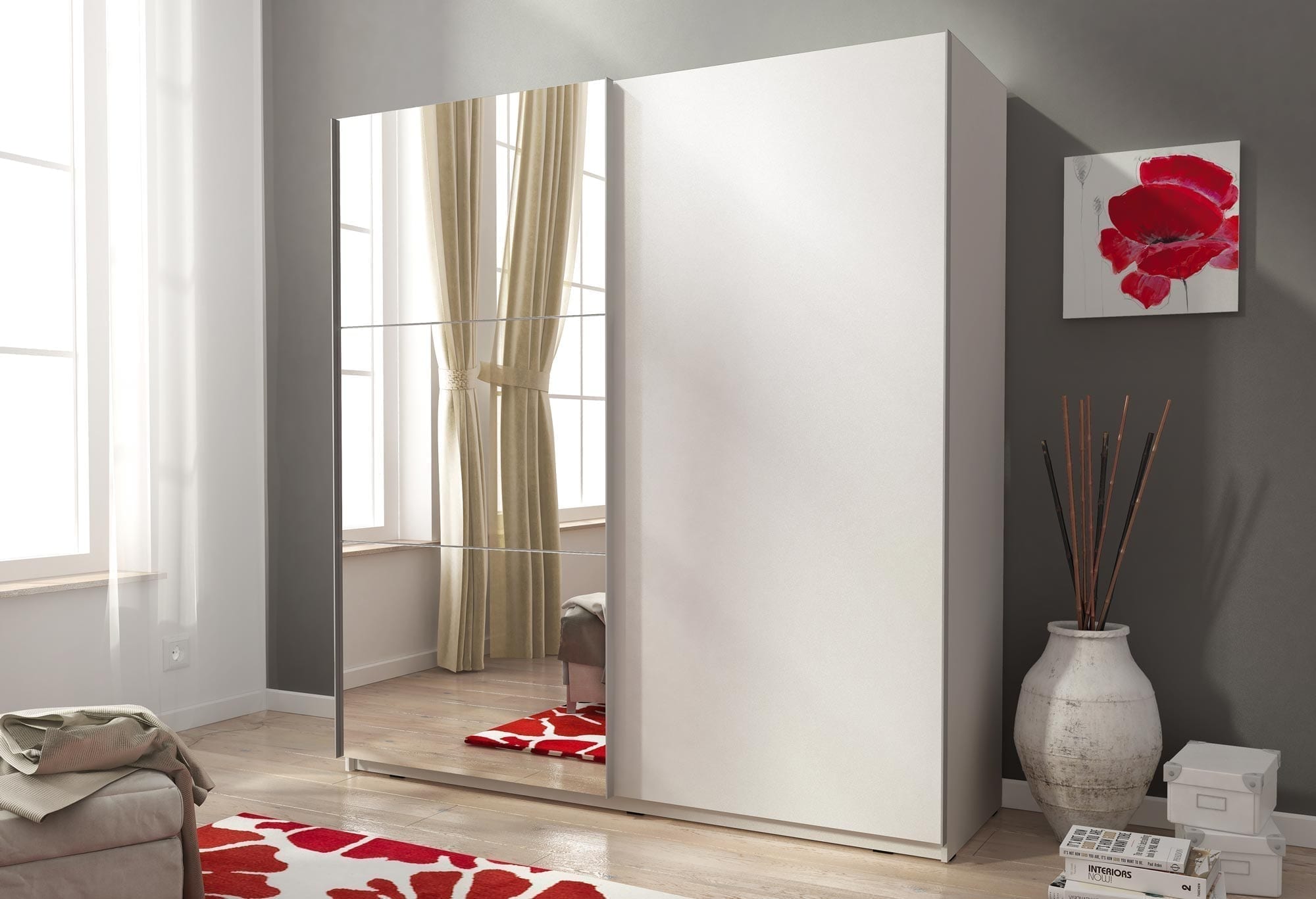 Szafa ubraniowa z lustrem GAYA II 200cm cieszy się niesłabnącą popularnością, a wszystko dzięki temu, że powalają one wykorzystać powierzchnię użytkową do maksimum, nie zabierając dodatkowo miejsca jak przy drzwiach uchylnych. Dodatkowo szafa GAYA II posiada lustro na froncie jednych z drzwi, jest to bardzo praktyczny element aranżacji. Ponieważ pozwala na przeglądnięcie ubranej stylizacji bezpośrednio przy szafie, służy również do dekoracji danego pomieszczenia.
