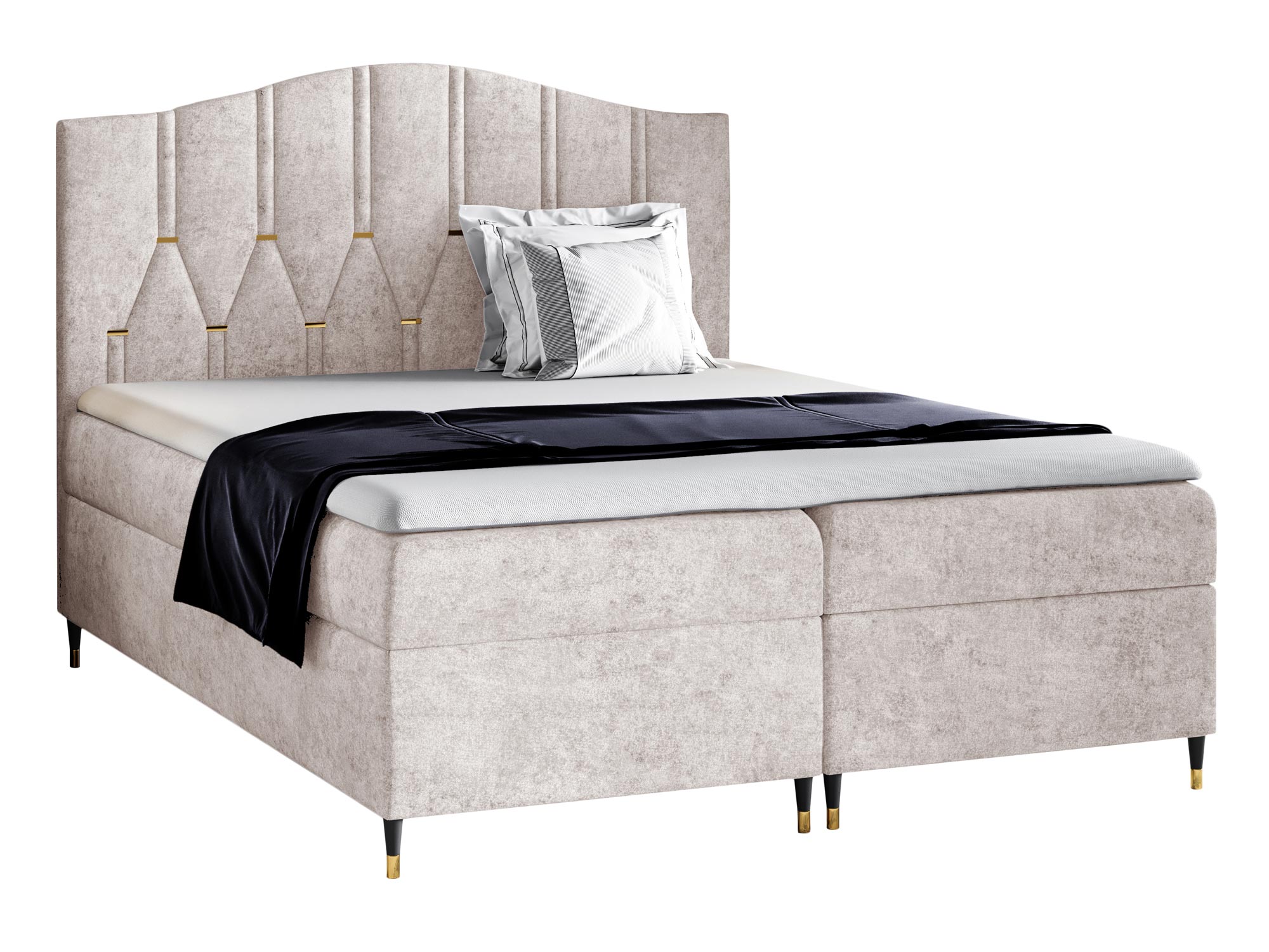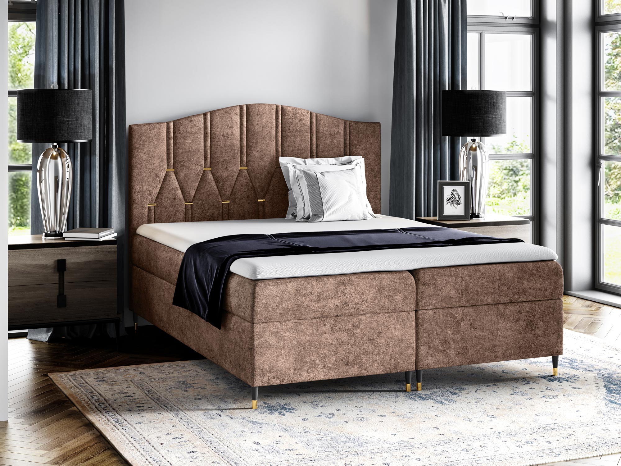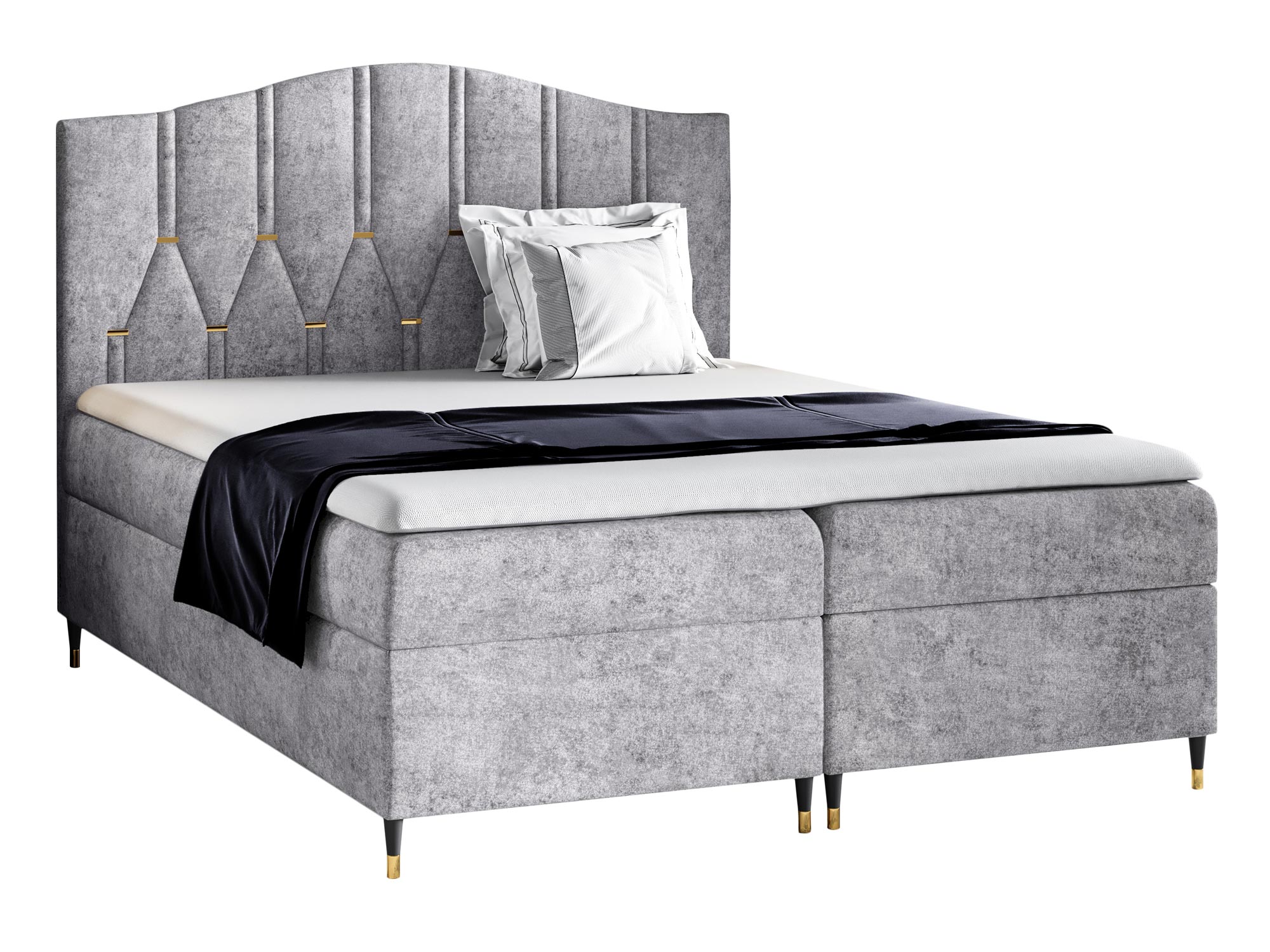 Co najważniejsze łóżko kontynentalne wykonano z dokładnością o najmniejszy szczegół z materiałów wysokiej jakości dzięki czemu mebel prezentuje się w sypialni fenomenalnie. Dodatkowo łóżko posiada dwa pojemniki na przechowywanie pościeli, poduszek czy koców, co znacznie usprawnia organizację sypialni oraz oszczędza miejsce w przestrzeni. Co więcej szeroka gama odcieni tapicerki pozwala na swobodny dobór odpowiedniej barwy do swojej aranżacji. Ponadto nóżki na których osadzone jest łóżko dodają meblu lekkości, a złote wstawki prezentują się niezwykle elegancko. Co więcej zastosowany materac oraz topper zapewniają regenerujący i wyjątkowo komfortowy sen.