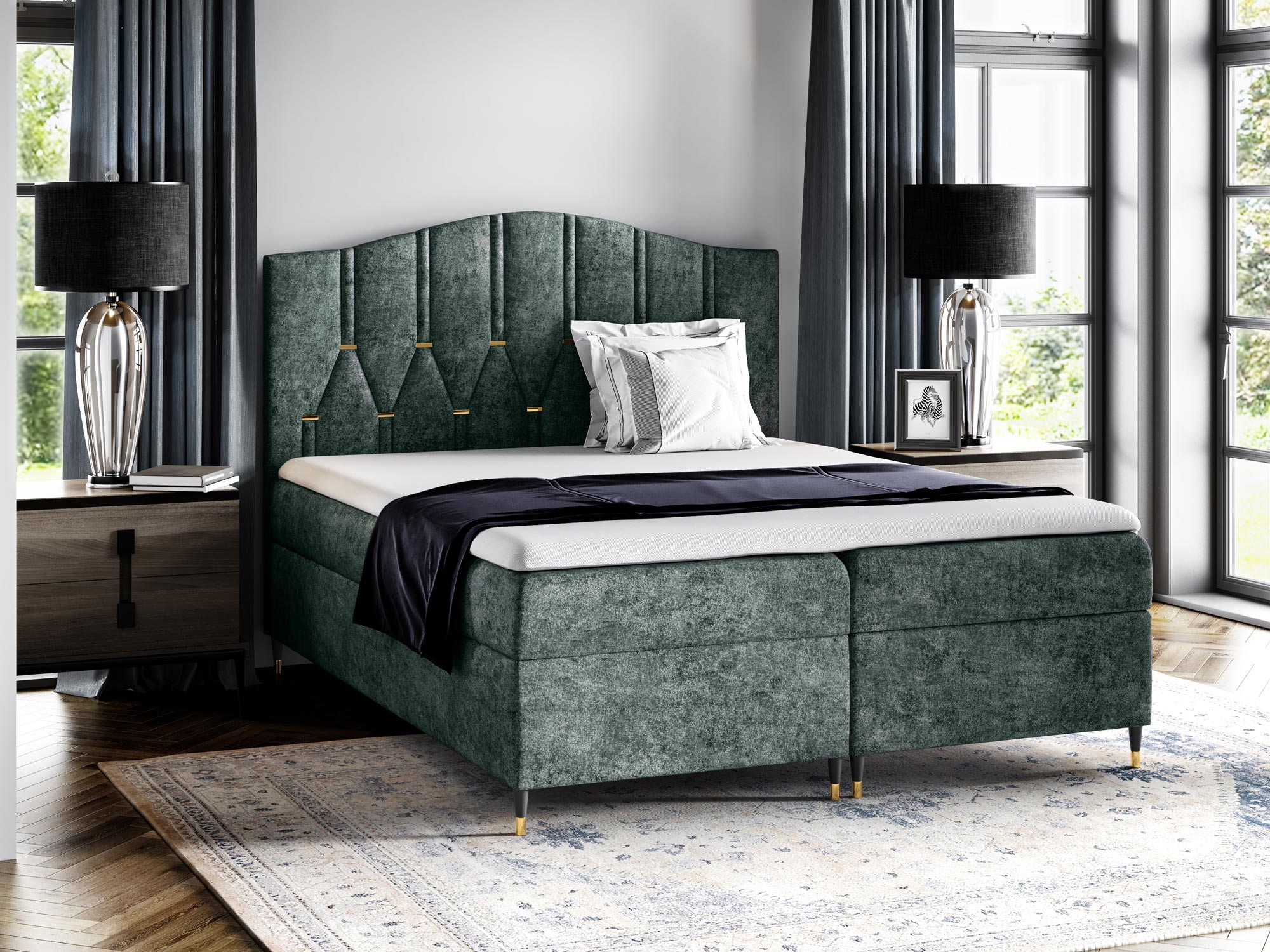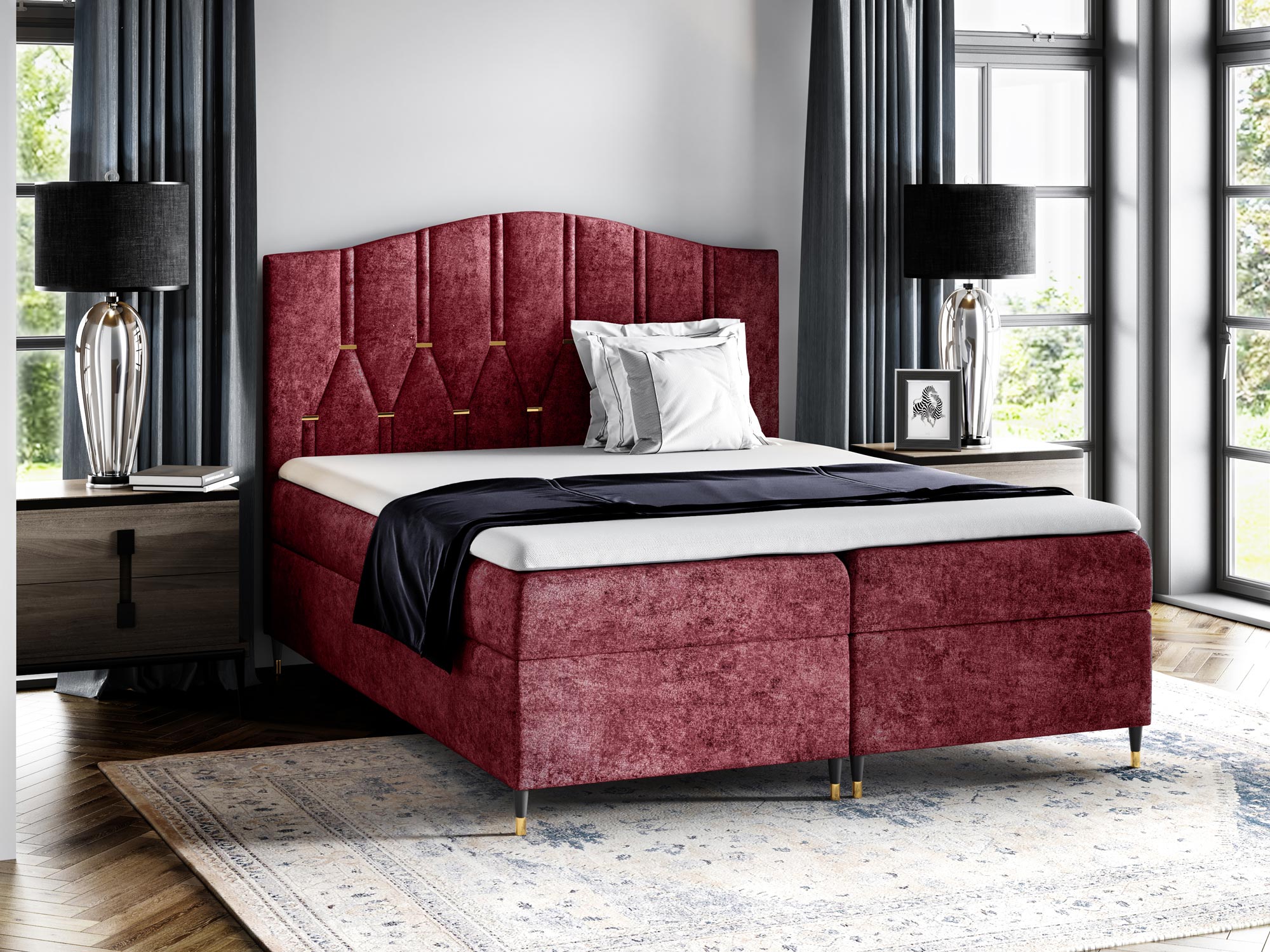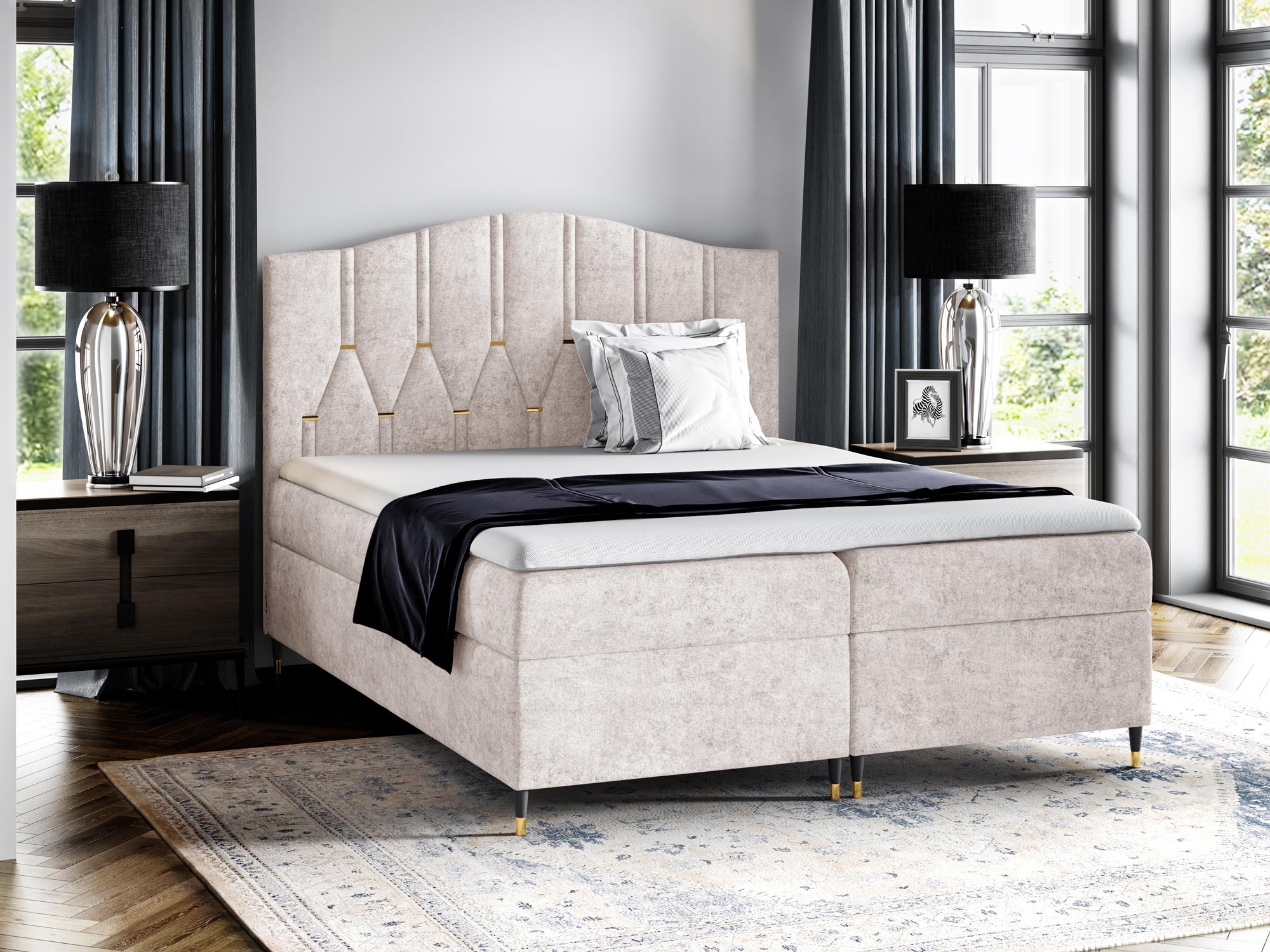 Co najważniejsze łóżko kontynentalne wykonano z dokładnością o najmniejszy szczegół z materiałów wysokiej jakości dzięki czemu mebel prezentuje się w sypialni fenomenalnie. Dodatkowo łóżko posiada dwa pojemniki na przechowywanie pościeli, poduszek czy koców, co znacznie usprawnia organizację sypialni oraz oszczędza miejsce w przestrzeni. Co więcej szeroka gama odcieni tapicerki pozwala na swobodny dobór odpowiedniej barwy do swojej aranżacji. Ponadto nóżki na których osadzone jest łóżko dodają meblu lekkości, a złote wstawki prezentują się niezwykle elegancko. Co więcej zastosowany materac oraz topper zapewniają regenerujący i wyjątkowo komfortowy sen.