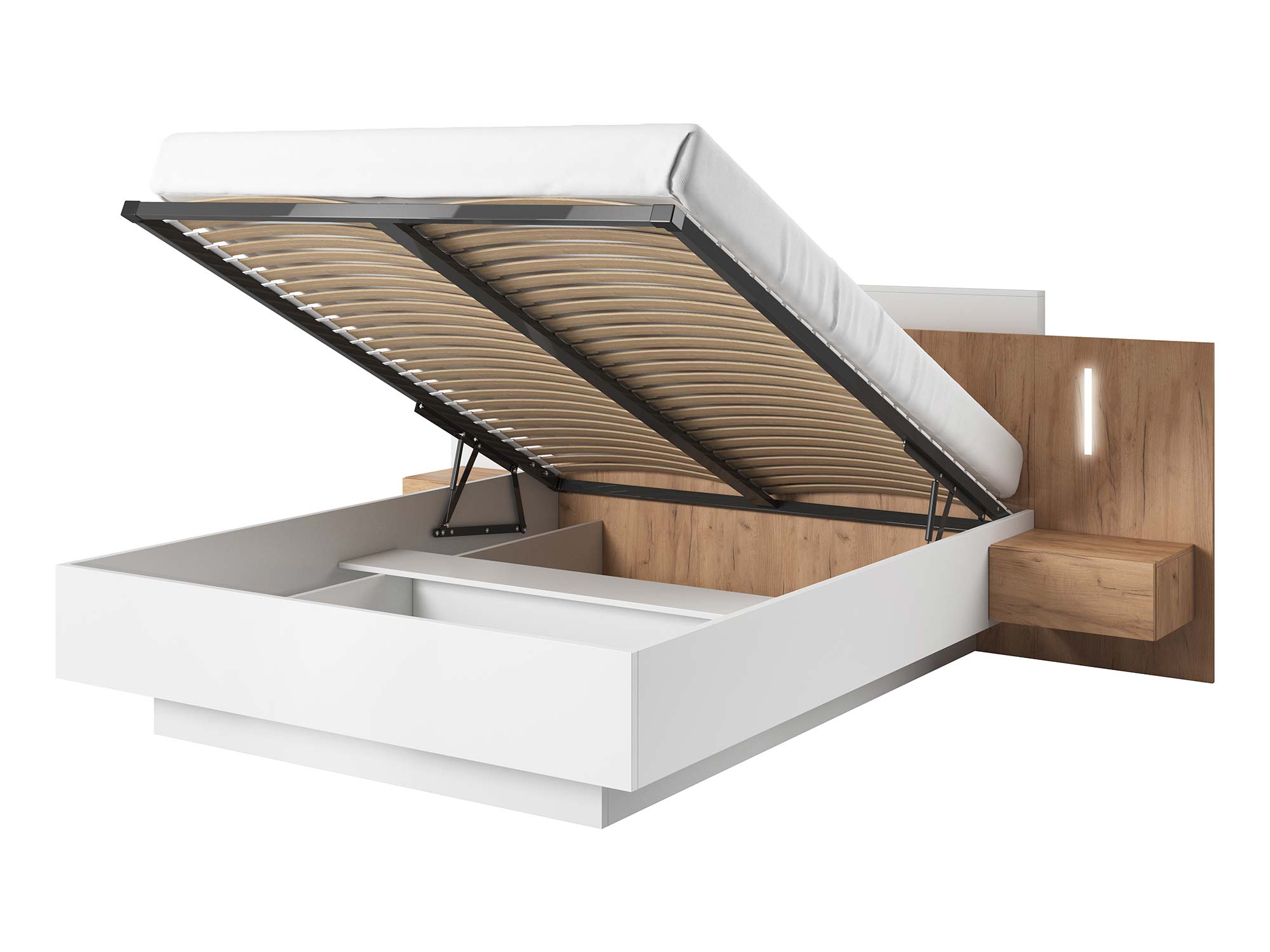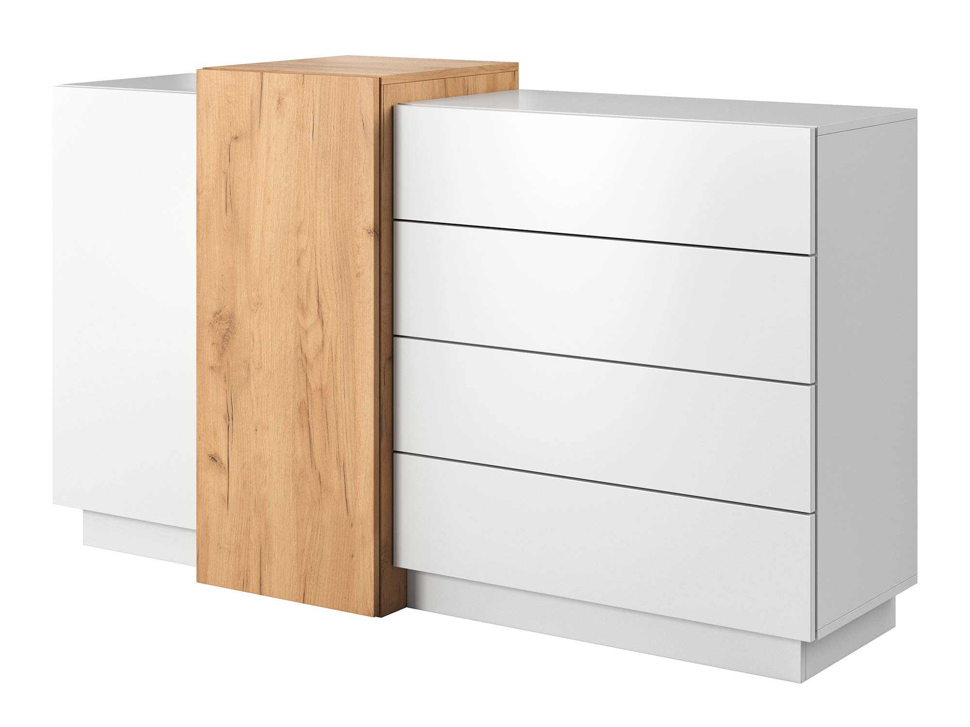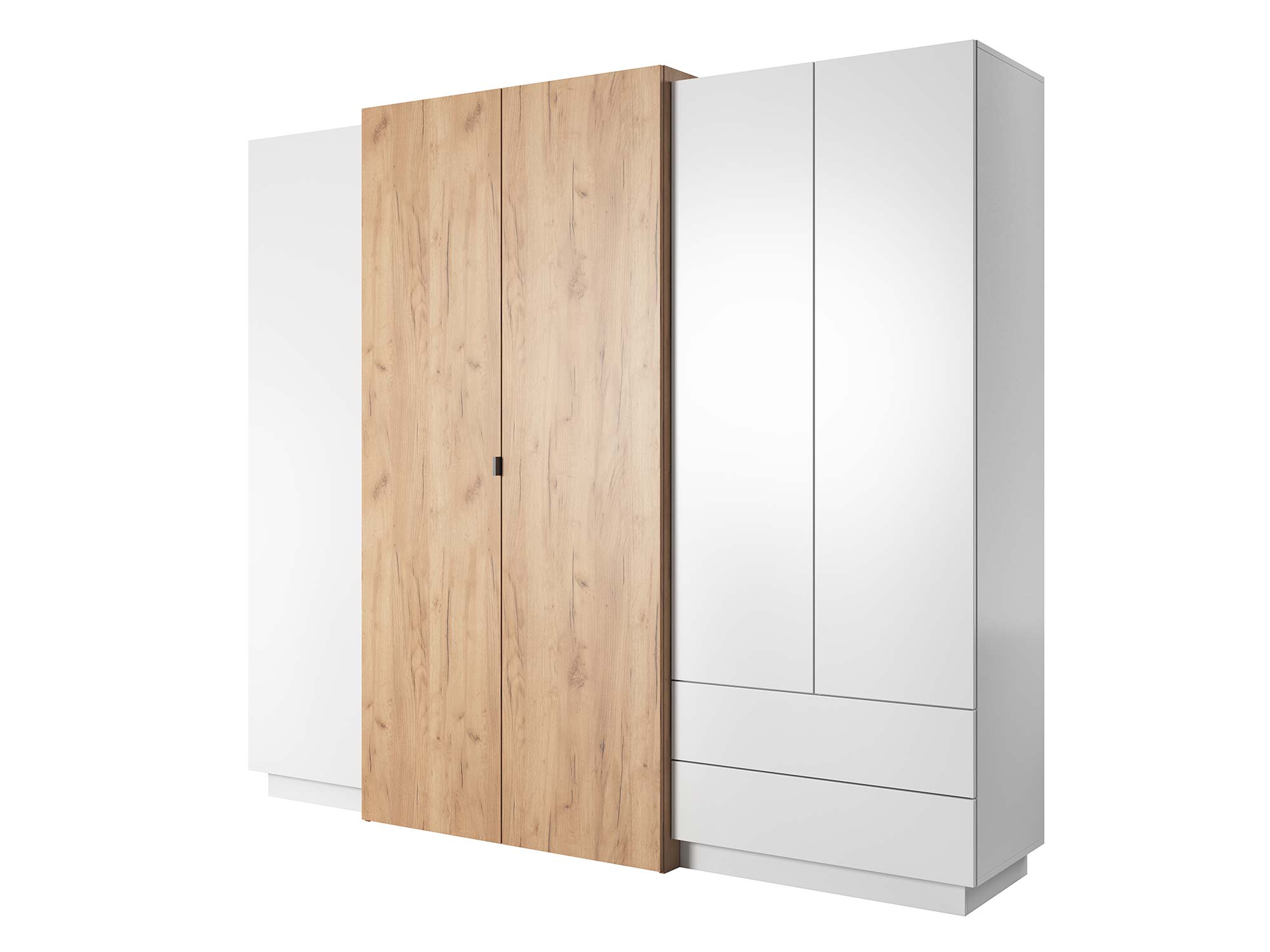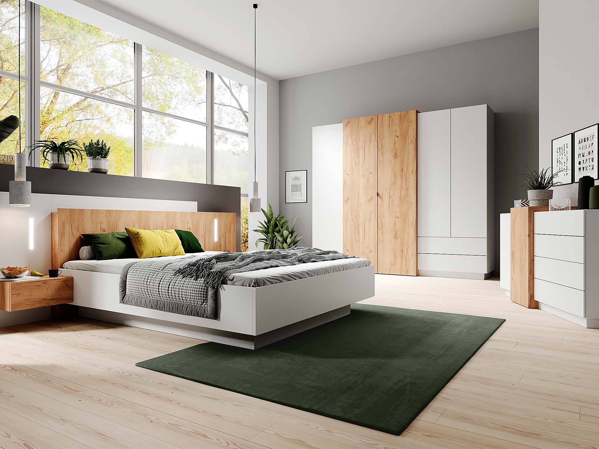 Odkryj Zestaw Mebli Sypialnianych MAILS, która łączy w sobie drewniane, naturalne akcenty złotego dębu z bielą, tworząc niepowtarzalny charakter każdej nowocześnie urządzonej sypialni. Ta kolekcja przenosi ciepło natury do wnętrza, oferując jednocześnie nowoczesne i funkcjonalne rozwiązania. Przestronna szafa z lustrem, łóżko z nieregularnym zagłowiem i pojemną komodą tworzy kompleksowe wyposażenie sypialni, zapewniając styl i komfort.