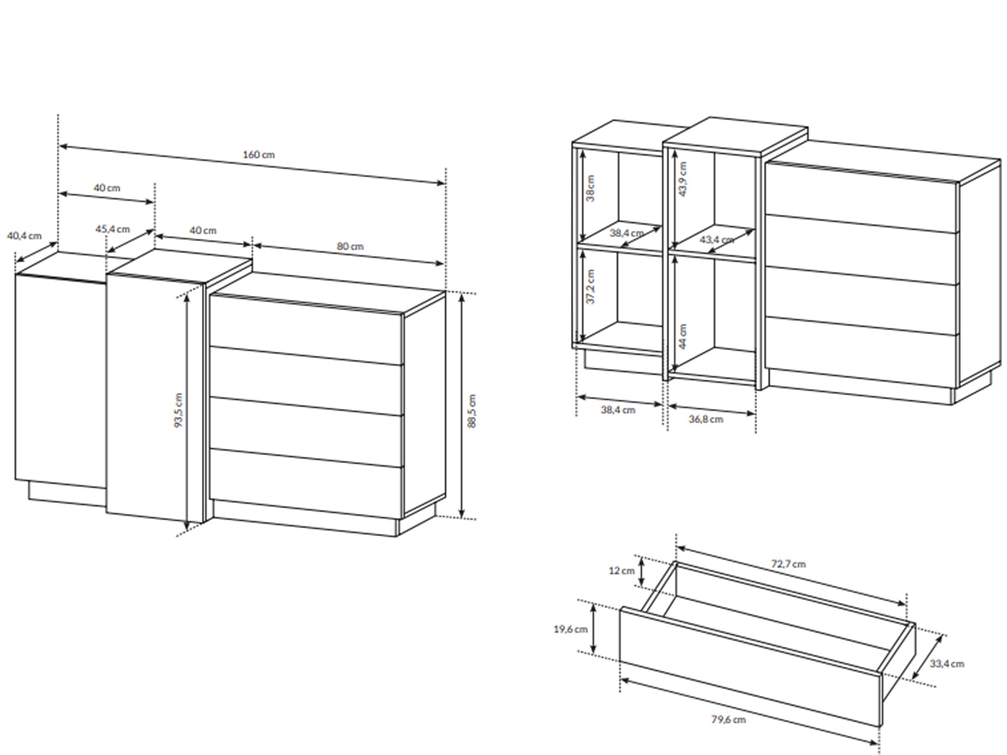 - Korpus oraz fronty wykonane z wiórowej płyty laminowanej E05, 16mm.