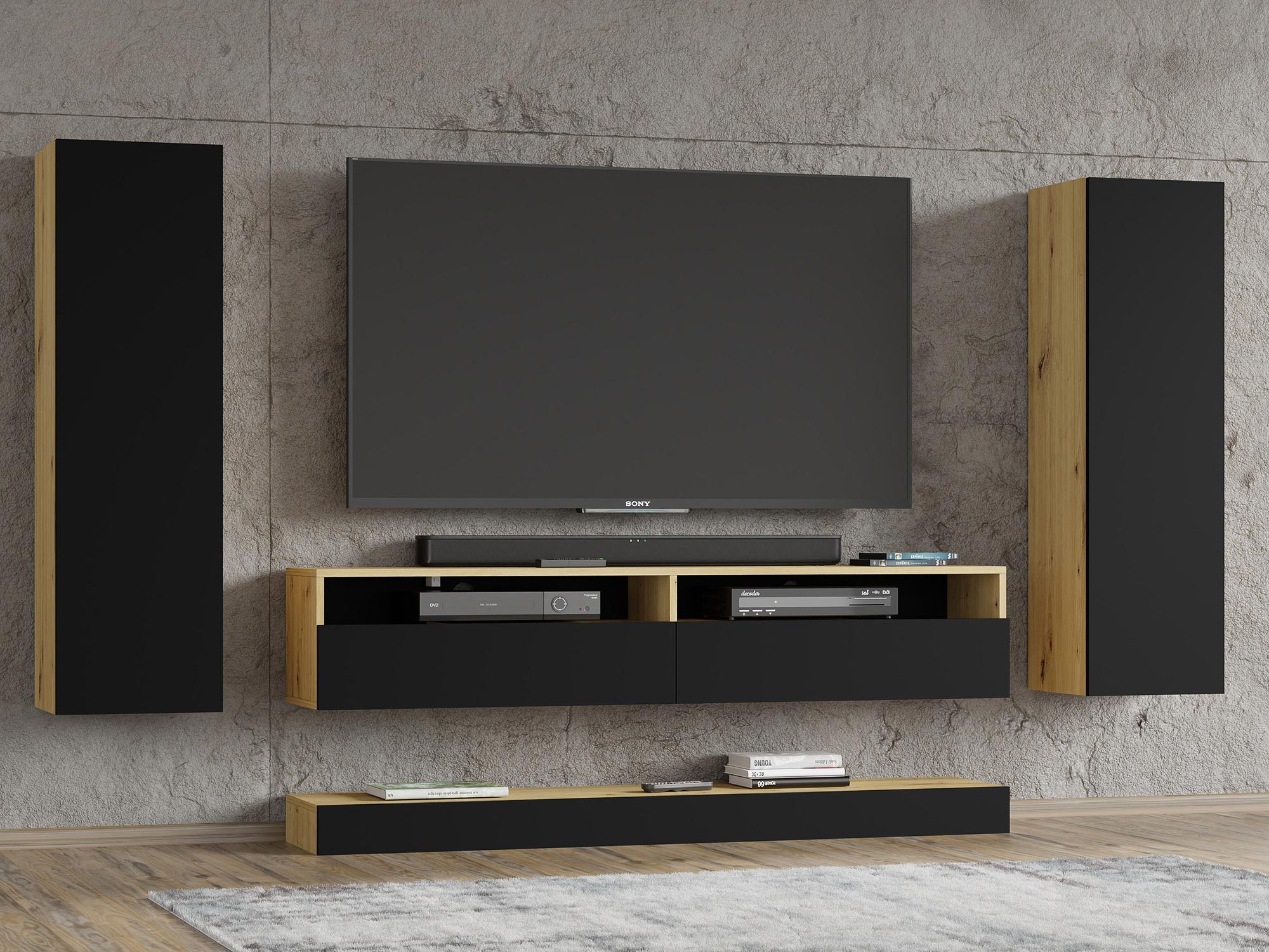 Designerska Meblościanka Elsa C Dąb Czarny Mat to idealne rozwiązanie dla osób, które cenią sobie nowoczesny design, funkcjonalność oraz wysoką jakość wykonania. Ten elegancki zestaw mebli do salonu, składający się z szafki RTV, panelu oraz szafki wiszącej, oferuje stylowy wygląd oraz praktyczność, której oczekujesz. Dzięki modnemu kolorowi dąb artisan / czarny mat, meblościanka Elsa C wprowadzi do Twojego wnętrza ciepło i nowoczesny charakter.