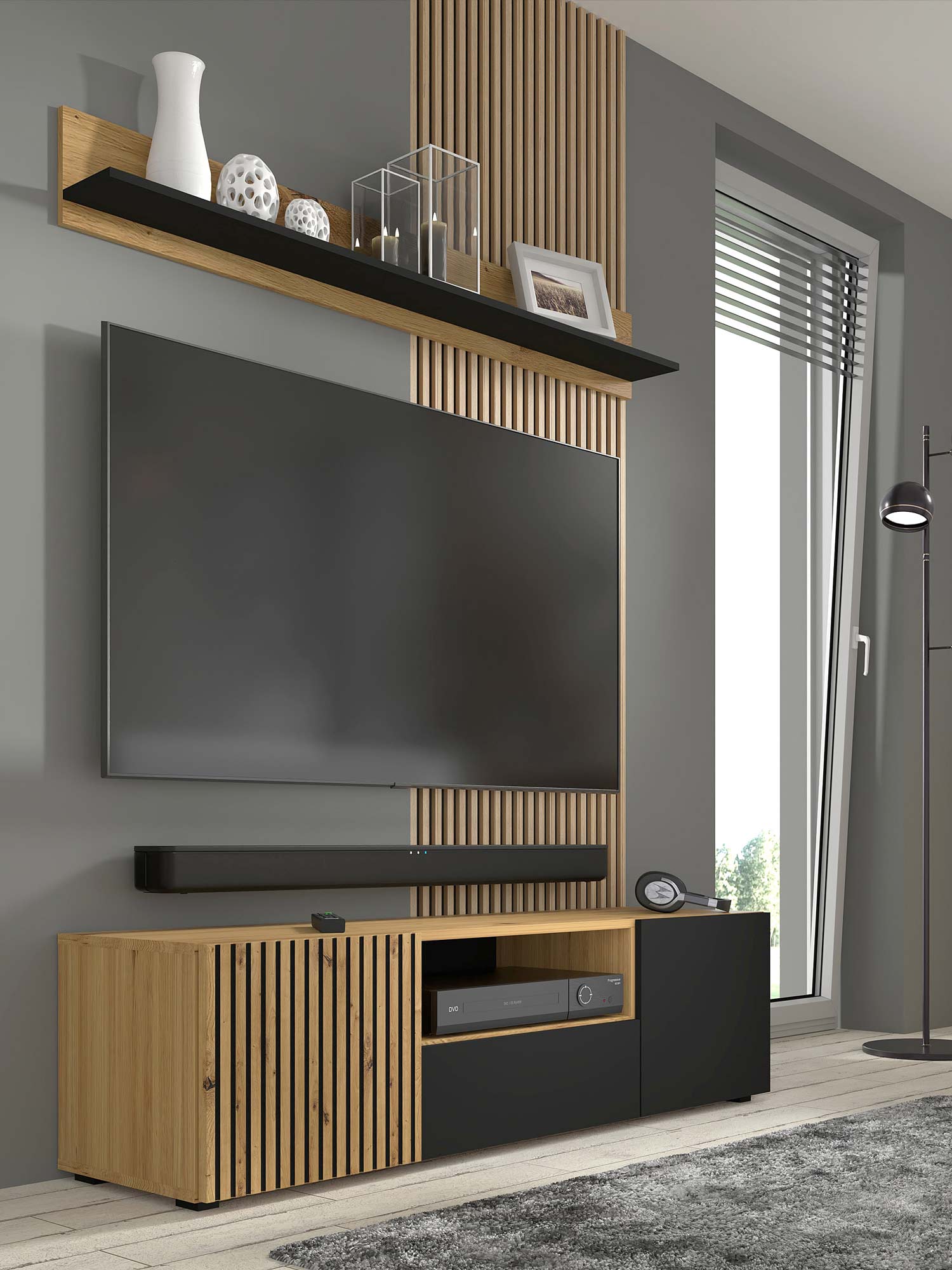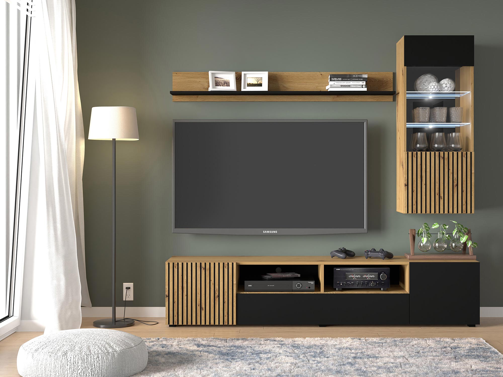 Funkcjonalna Meblościanka Merve B do Salonu to doskonałe rozwiązanie dla tych, którzy cenią sobie nowoczesny design, funkcjonalność oraz wysoką jakość wykonania. Ten zestaw mebli, składający się z szafki RTV, półki oraz witryny, został zaprojektowany, aby nadać Twojemu wnętrzu wyjątkowy charakter i praktyczność. Dzięki modnemu kolorowi dąb artisan / czarny mat, meblościanka Merve B wprowadza do wnętrza ciepło i nowoczesny akcent, który z pewnością przyciągnie wzrok.