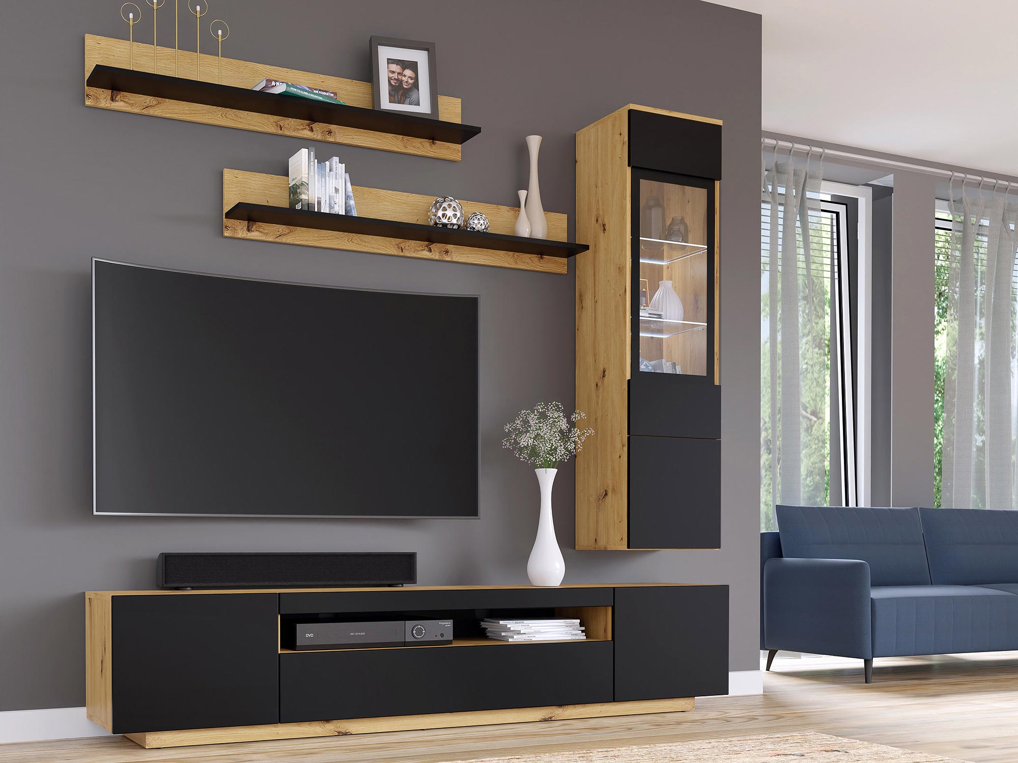 Meblościanka Kismet D Dąb Artisan to wyjątkowe rozwiązanie dla osób, które cenią sobie nowoczesny design, funkcjonalność oraz wysoką jakość wykonania. Ten elegancki zestaw mebli do salonu, składający się z szafki RTV, dwóch półek oraz witryny, został zaprojektowany, aby nadać Twojemu wnętrzu wyjątkowy charakter i praktyczność. Dzięki modnemu kolorowi dąb artisan / czarny mat, meblościanka Kismet D wprowadza do wnętrza ciepło i nowoczesny akcent, który z pewnością przyciągnie wzrok.
