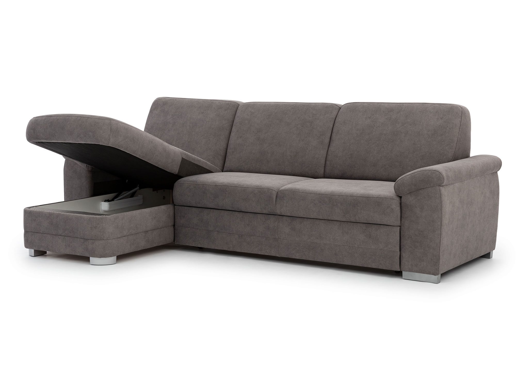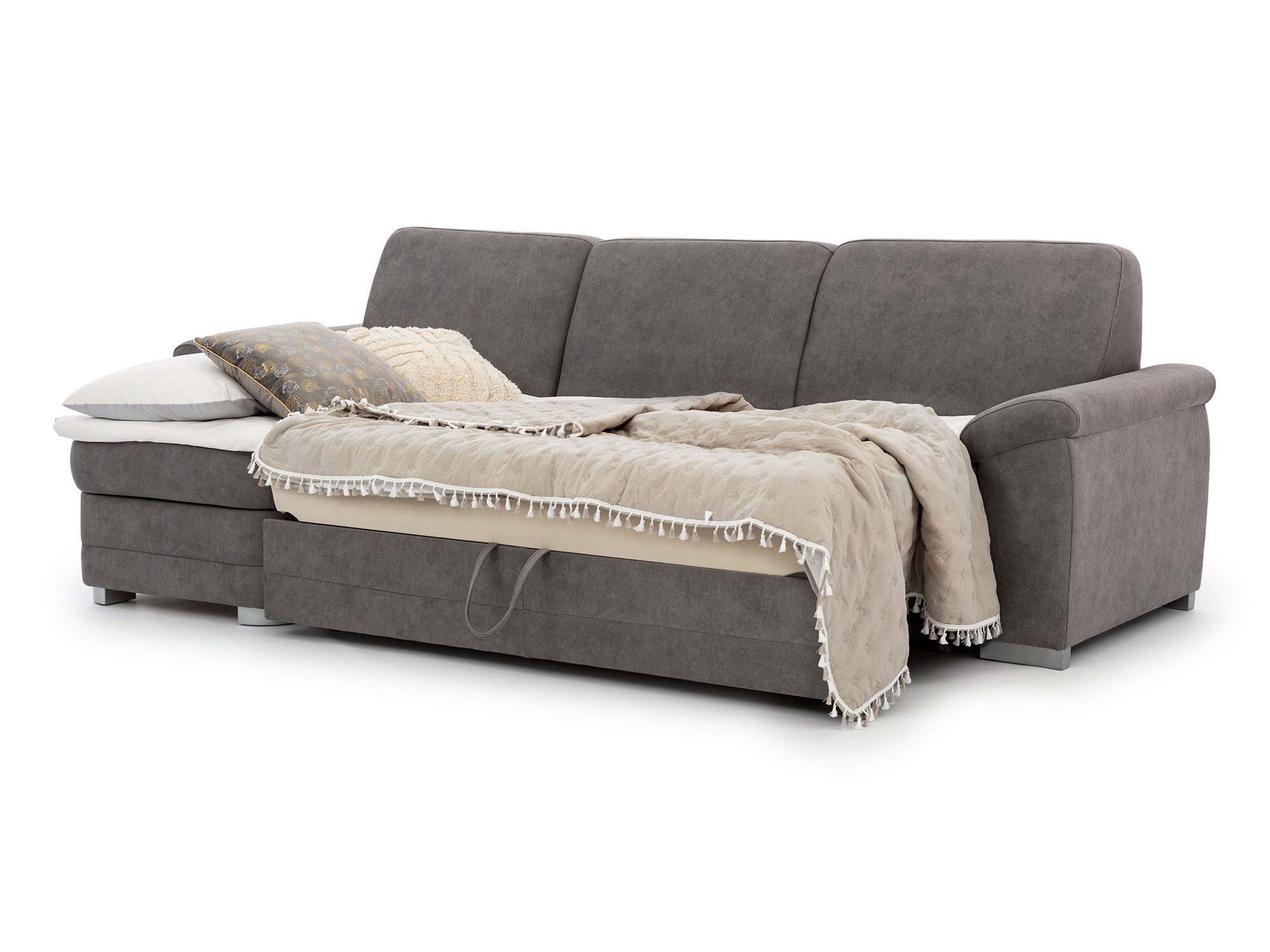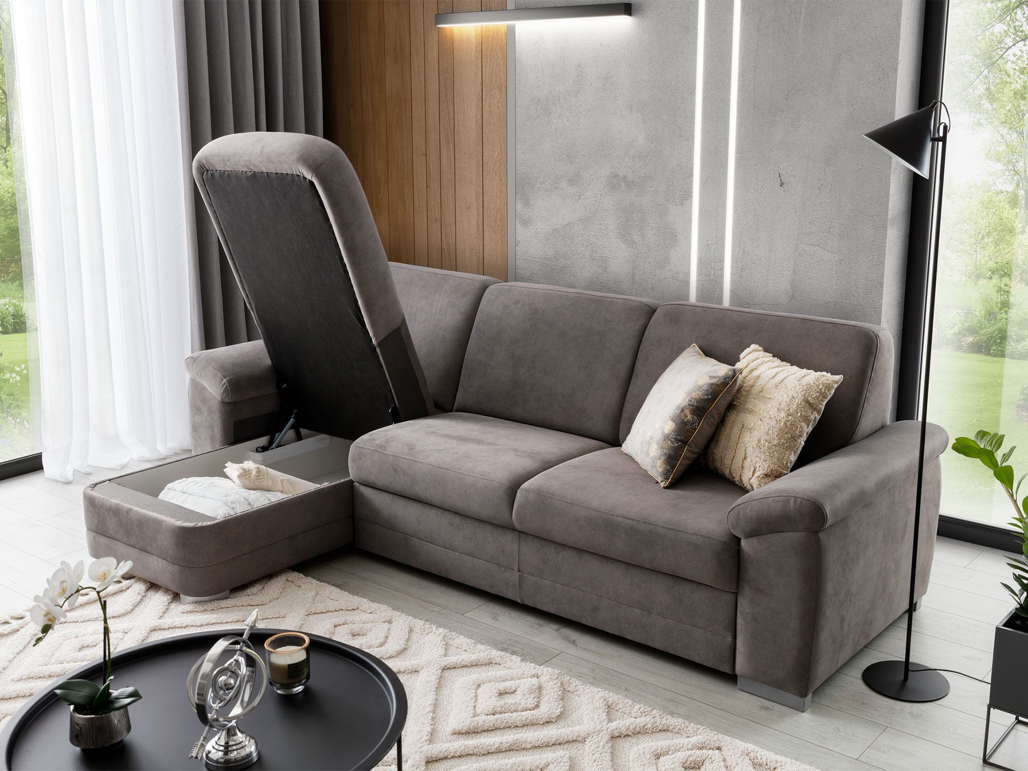 Nowoczesny narożnik z funkcją spania i pojemnikiem na pościel, tapicerka szara